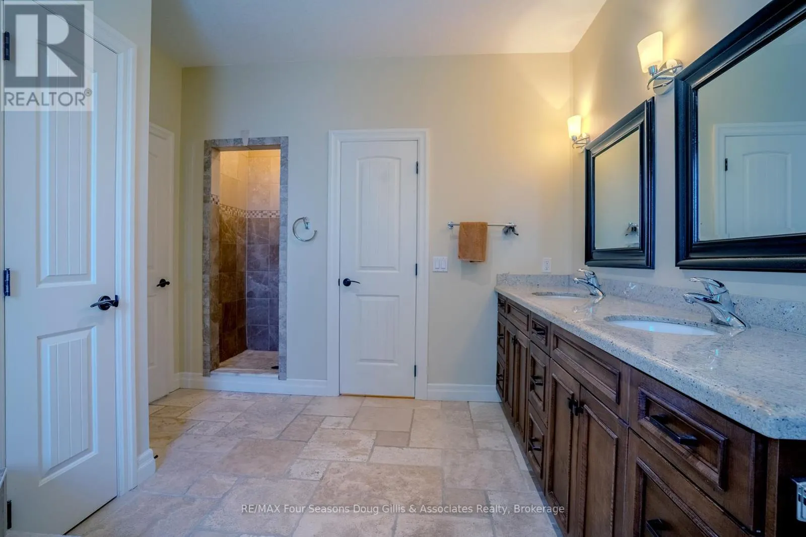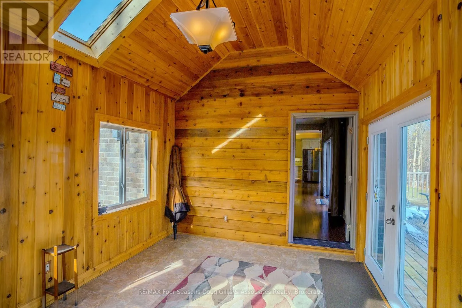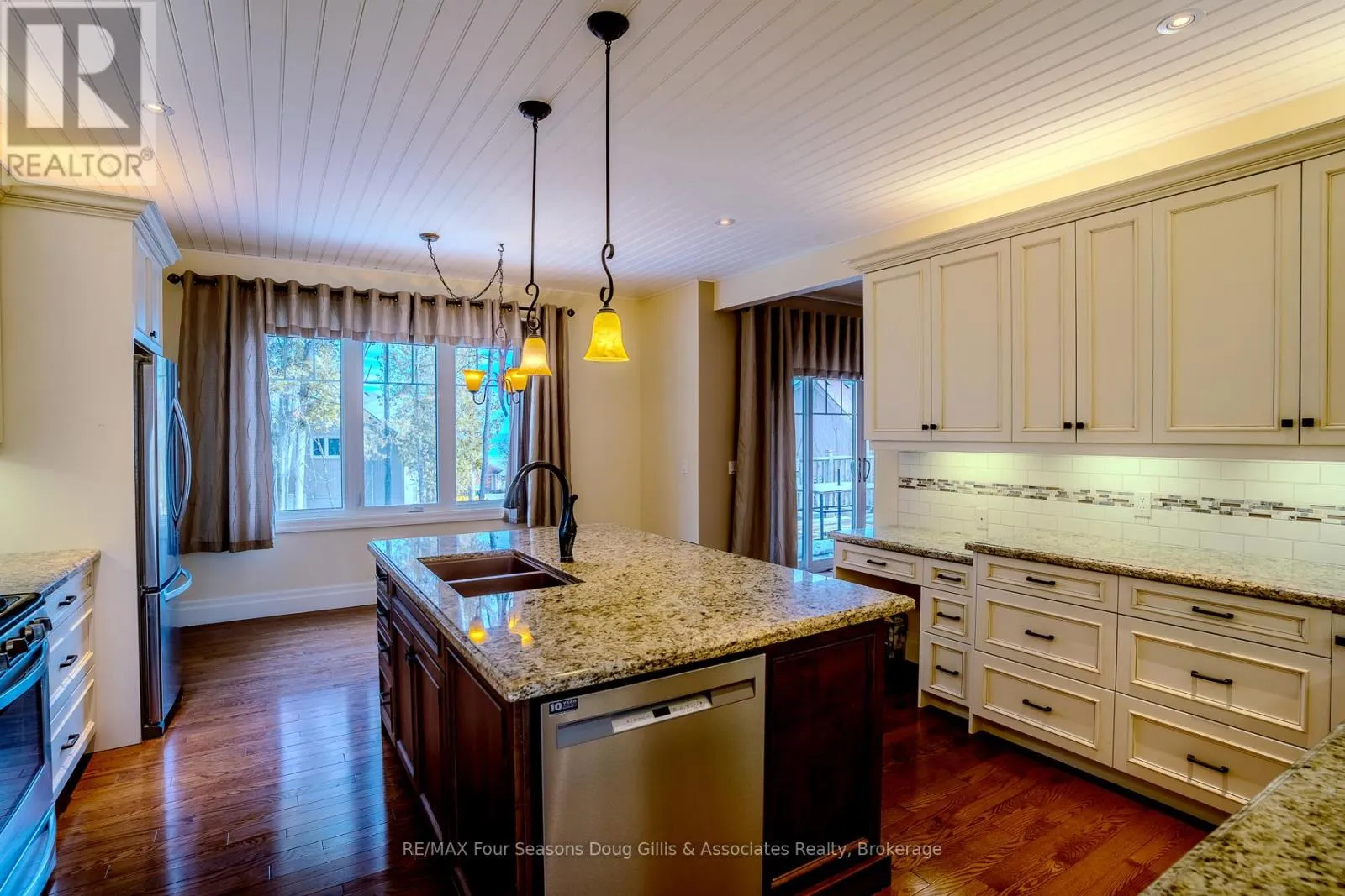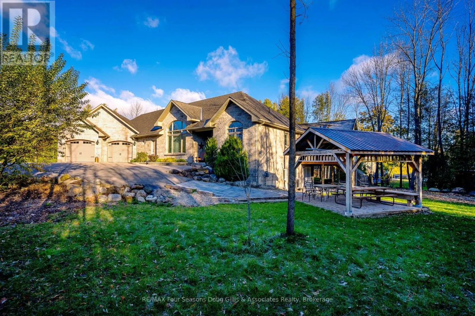 Cross Streets: Algonquin Drive and Lakeshore Rd. ** Directions: Head west on Hwy 26 through Meaford, Turn right on Ford ave, Left on Lakeshore Rd, Left on Algonquin Dr & a right on Algonquin Dr. House is on right hand side. Welcome to this exceptional 4,588 sq ft custom-built home, ideally situated on a private 0.89-acre (+/-) cul-de-sac in one of Meaford's most desirable neighbourhoods. Offering 5 bedrooms and 3.5 bathrooms, this beautifully designed residence blends timeless curb appeal with comfort and functionality. The exterior impresses with professional landscaping, split rail fencing, dual stone-pillared driveways, and a striking stone and brick façade with steep rooflines and expansive windows. Inside, the main level features 9-foot ceilings, wide hallways, oak hardwood and ceramic flooring, and vaulted tongue-and-groove ceilings in the open-concept living, dining, and kitchen areas. A gas fireplace with custom oak built-ins creates a warm focal point. The chef's kitchen showcases custom off-white cabinetry, granite countertops, dual stone sinks, a central island, tiled backsplash, and stainless-trim appliances including a gas range, hood fan, fridge with ice maker, and dishwasher. A cedar-lined three-season sunroom adds charm and flexibility, while the living room opens to a deck with panoramic Georgian Bay views. The finished lower level offers a spacious rec room with walk-out access, ideal for entertaining, guests, or extended family living. Two oversized, insulated, and drywalled garages provide space for up to four vehicles, a workshop, or storage-one with heated floors and the other with a unit heater. The landscaped yard includes a vegetable garden and garden shelter for outdoor enjoyment. Additional features include main-floor laundry, natural gas furnace, central air, HRV system, dual hot water heaters, central vacuum, municipal water, and an annually serviced Eco-Flow septic system. Built by the owner to a high standard of quality and craftsmanship, this property offers peaceful, upscale living just minutes from Meaford's waterfront, golf, and amenities. (id:27476)