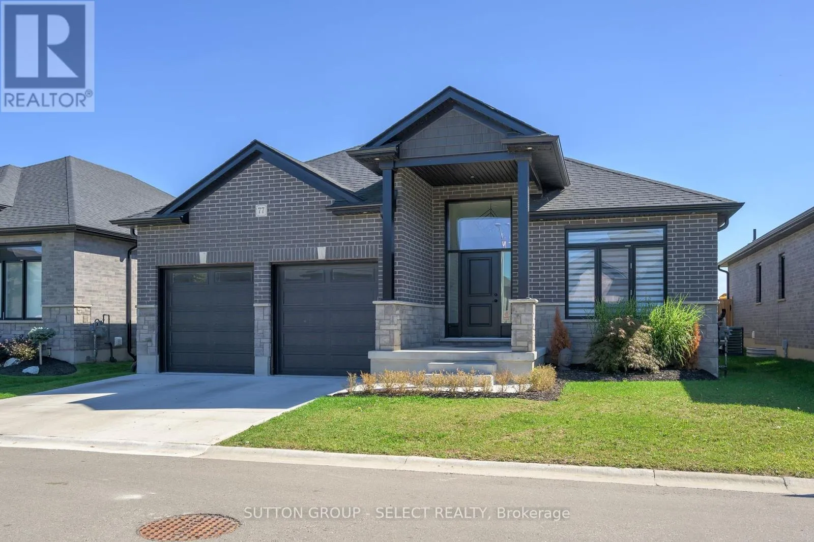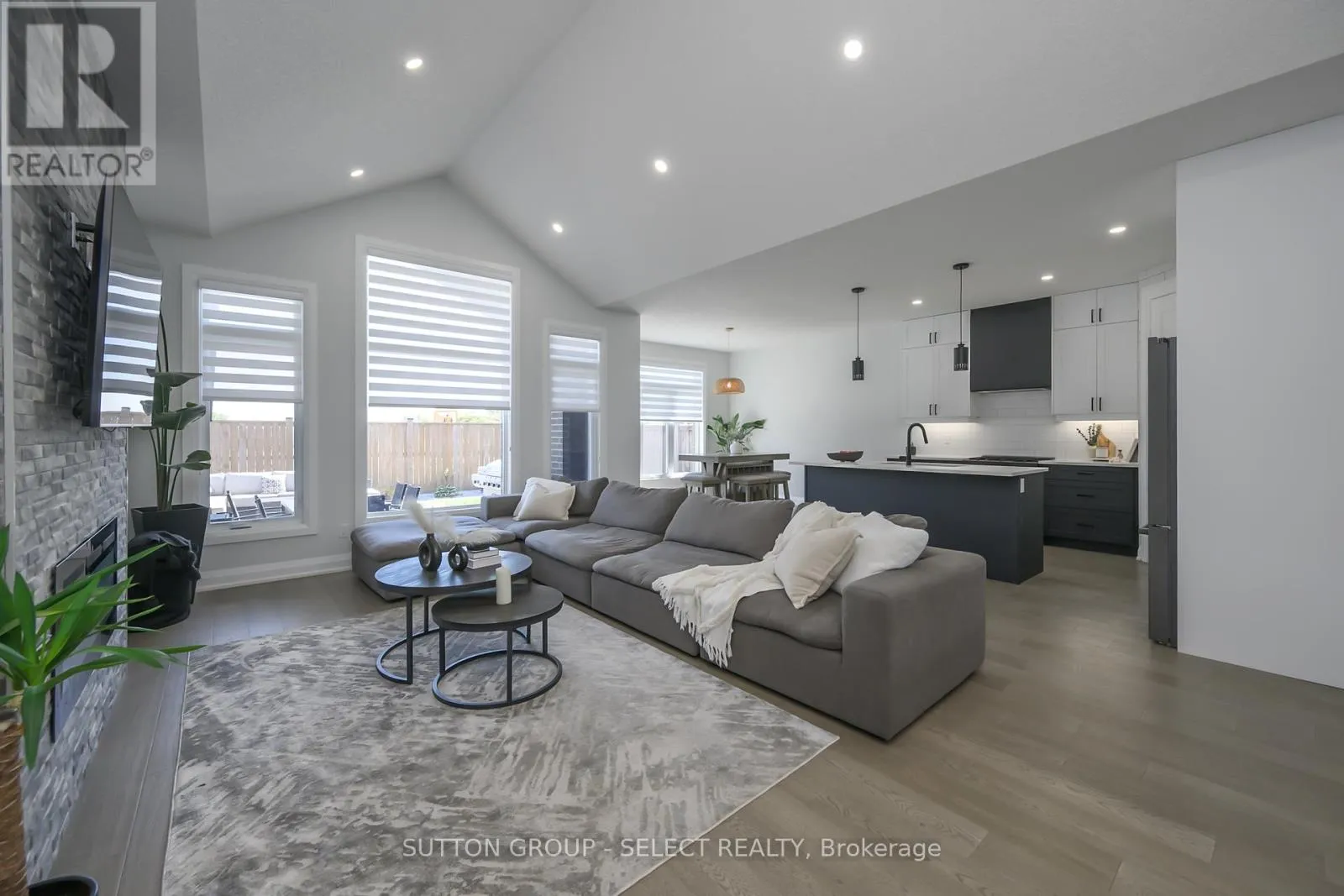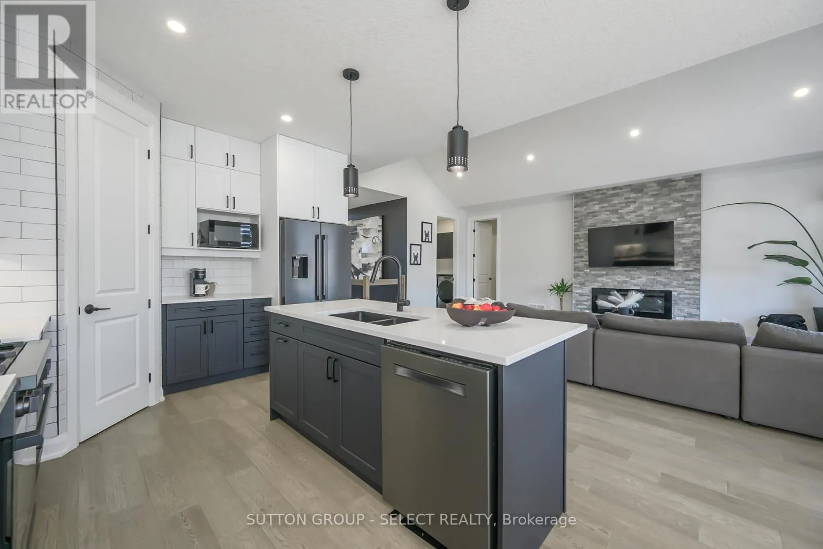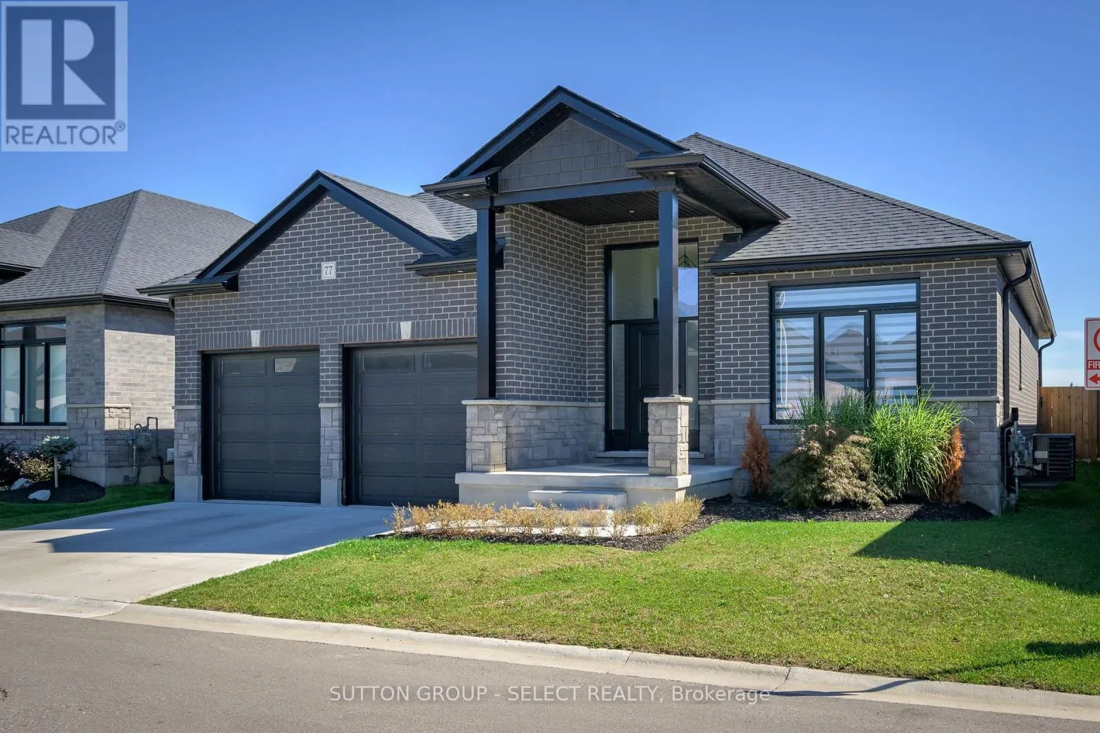 Cross Streets: Daventry Way & Allister Rd. ** Directions: From Glendon turn SE onto Crestview, Then turn SW onto Daventry, Then turn NW into the complex. Unit is on the Left when entering complex past the visitor parking spots. Exceptional Living in Tranquil Komoka! Welcome to 383 Daventry Way #77, an upscale vacant land condo in a desirable community just west of London, Ontario. This residence has been transformed with custom upgrades, designer finishes, and a smart layout that blends luxury with effortless living. Enter through a bright foyer with soaring ceilings, leading to an open-concept living space ideal for both daily living and entertaining. The gourmet kitchen features quartz countertops, premium Bosch appliances, and a floor-to-ceiling tiled pantry. The vaulted living room is a showpiece with a dramatic stone fireplace, mounted TV, and seamless sightlines from the kitchen island. The main-floor primary suite offers elegance and comfort with tray ceilings, a walk-in closet, and a spa-like six-piece ensuite complete with a deep soaker tub. Step outside to your private backyard oasis with professional landscaping, an expansive stamped concrete patio, gas BBQ, lounge and dining areas, hot tub, and outdoor television - perfect for year-round enjoyment. The fully finished lower level adds versatility with a spacious second living room, three bedrooms, a three-piece bath, and a stunning kitchenette with granite counters, double sink, two bar-sized fridges, and an island offering ample prep and storage space. This rare property combines the tranquility of Komoka with the sophistication of a fully upgraded luxury home. (id:27476)
