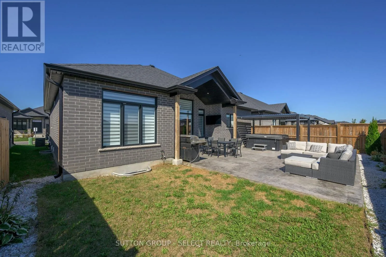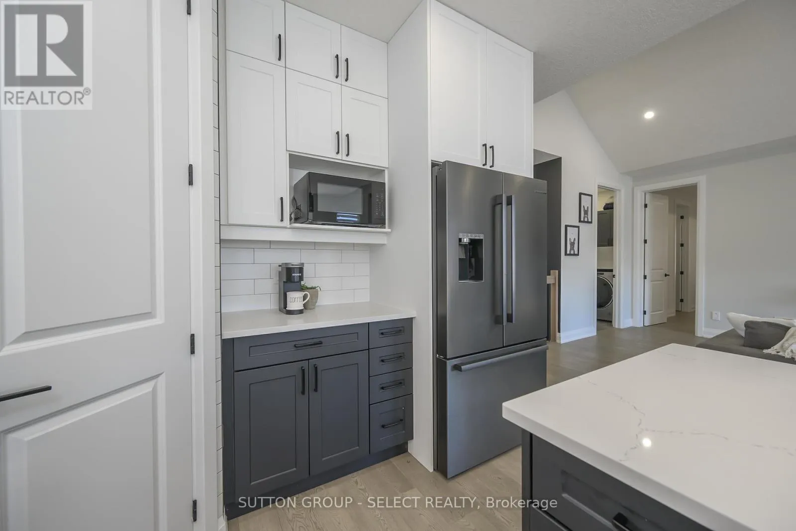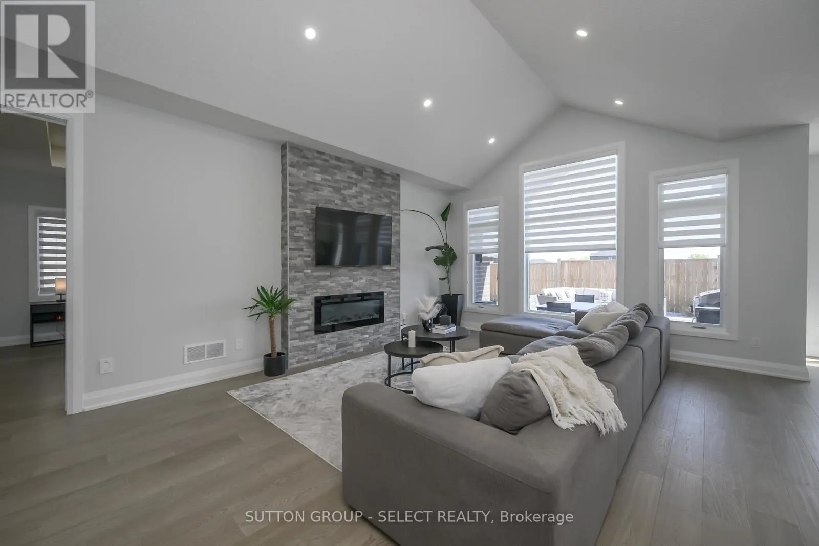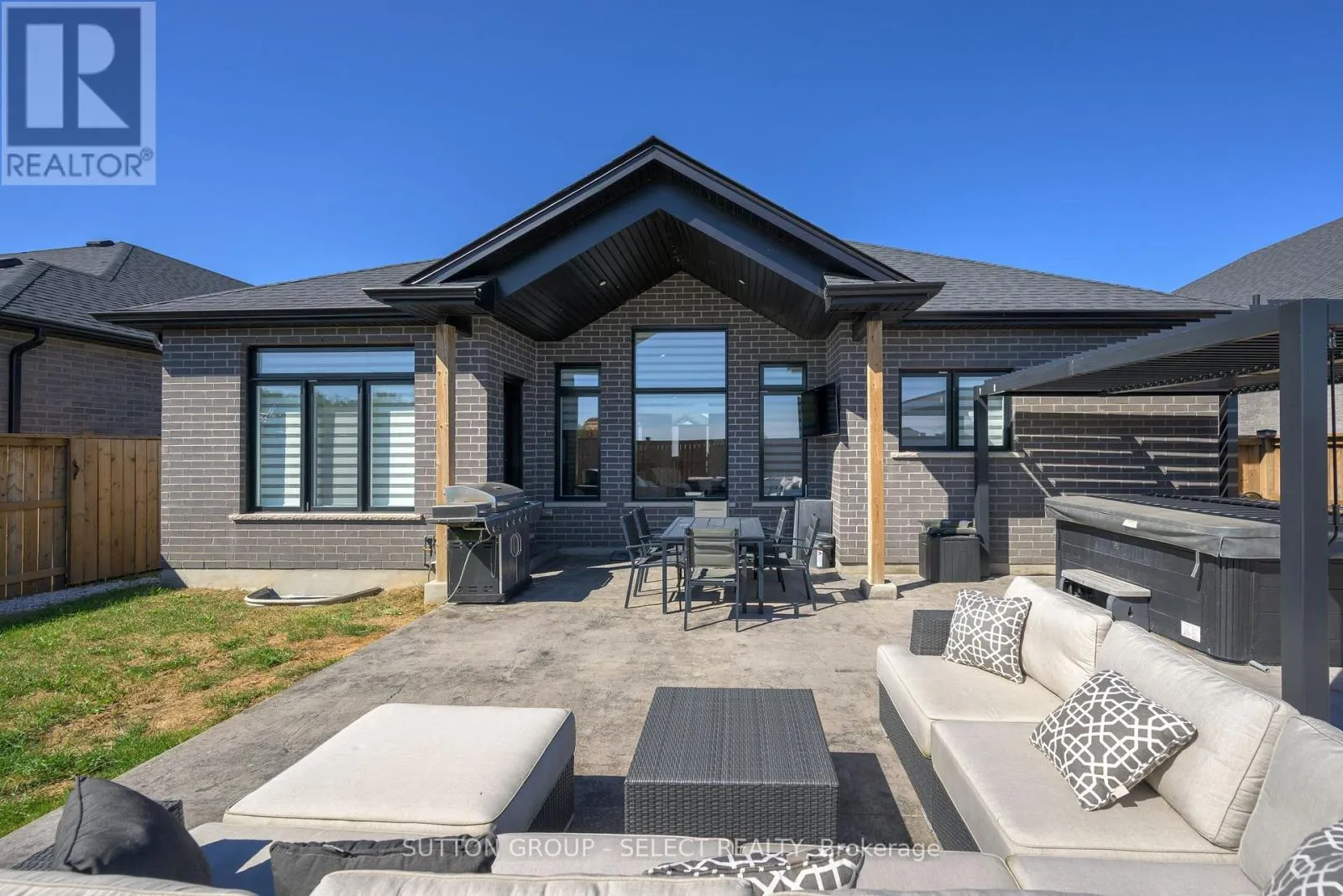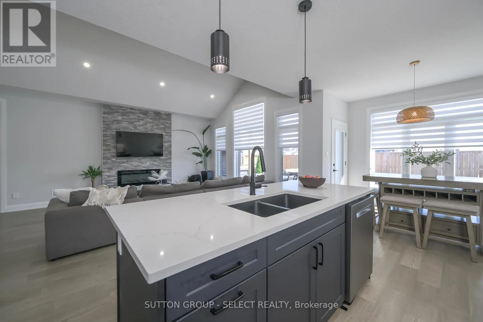 Cross Streets: Daventry Way & Allister Rd. ** Directions: From Glendon turn SE onto Crestview, Then turn SW onto Daventry, Then turn NW into the complex. Unit is on the Left when entering complex past the visitor parking spots. Exceptional Living in Tranquil Komoka! Welcome to 383 Daventry Way #77, an upscale vacant land condo in a desirable community just west of London, Ontario. This residence has been transformed with custom upgrades, designer finishes, and a smart layout that blends luxury with effortless living. Enter through a bright foyer with soaring ceilings, leading to an open-concept living space ideal for both daily living and entertaining. The gourmet kitchen features quartz countertops, premium Bosch appliances, and a floor-to-ceiling tiled pantry. The vaulted living room is a showpiece with a dramatic stone fireplace, mounted TV, and seamless sightlines from the kitchen island. The main-floor primary suite offers elegance and comfort with tray ceilings, a walk-in closet, and a spa-like six-piece ensuite complete with a deep soaker tub. Step outside to your private backyard oasis with professional landscaping, an expansive stamped concrete patio, gas BBQ, lounge and dining areas, hot tub, and outdoor television - perfect for year-round enjoyment. The fully finished lower level adds versatility with a spacious second living room, three bedrooms, a three-piece bath, and a stunning kitchenette with granite counters, double sink, two bar-sized fridges, and an island offering ample prep and storage space. This rare property combines the tranquility of Komoka with the sophistication of a fully upgraded luxury home. (id:27476)