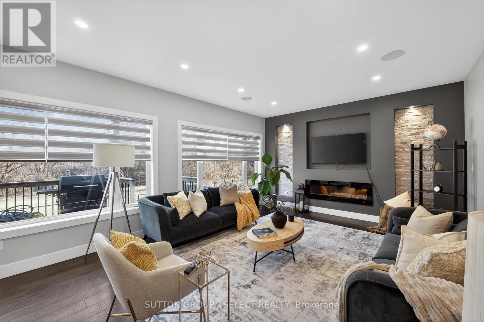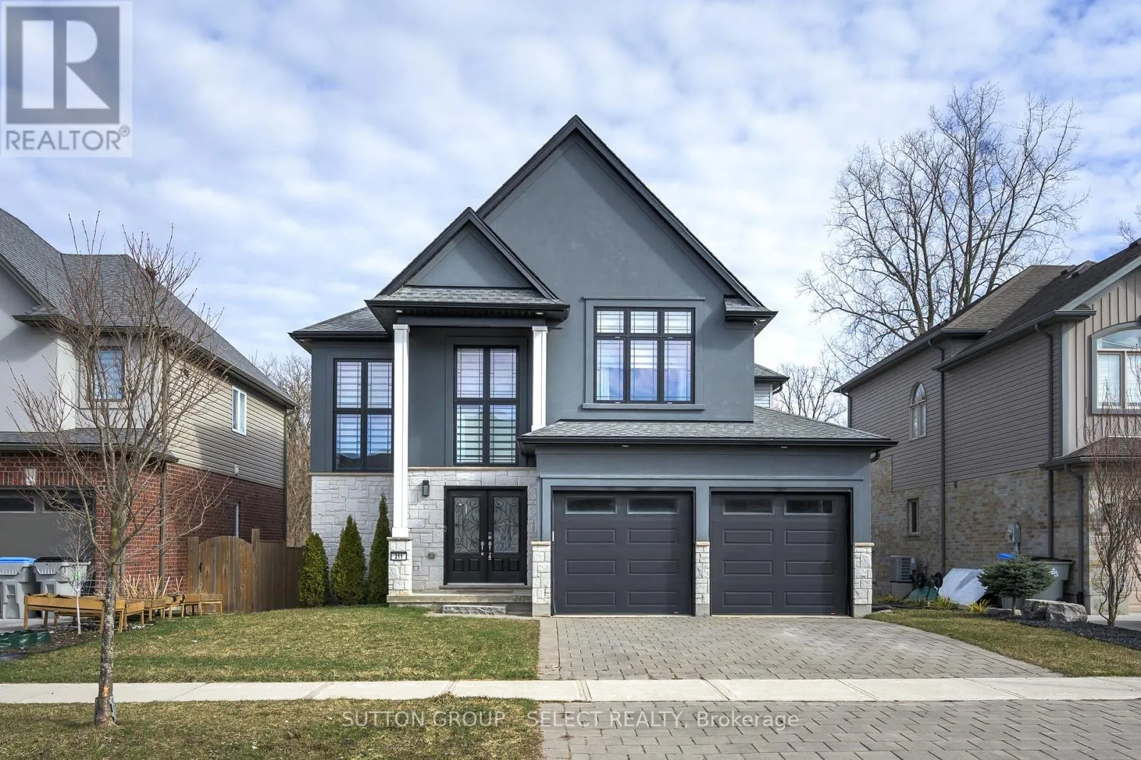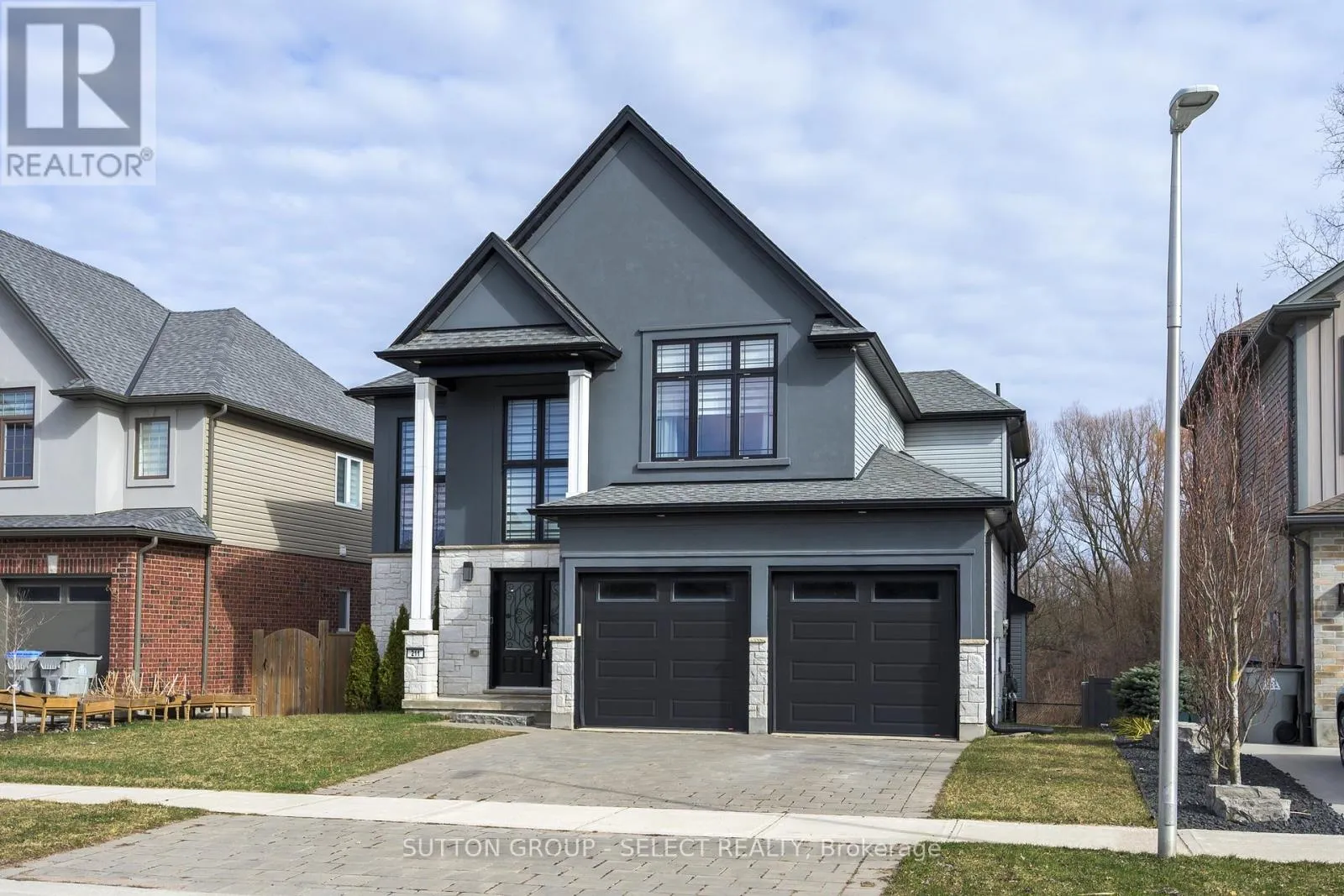 Cross Streets: Oxbow Dr/ Union Ave. ** Directions: Oxbow Dr to Union Ave. Welcome Home at the impressive 211 Union Avenue in quiet Komoka backing onto a green space. Modern and striking curb appeal stands apart with its deep hues, interlock brick drive, stone & stucco facade, and double-door front entry. Step into the soaring two-storey foyer beautifully illuminated by cascading chandeliers. The main floor offers a designated office space, a living room with a central gas fireplace - framed by a feature wall w/ linear stone wall niches with down lighting - and a sunshine-filled chef's kitchen + dining space featuring premium stainless steel appliances, a contrast centre island, quartz and granite surfaces, upscale pendant lighting and gleaming cabinetry, all overlooking the maturity of the green space, step-down deck, & fully fenced yard. 9' ceiling heights and gleaming hardwood throughout the main floor principal living areas as well. Four spacious bedrooms upstairs including the Primary, which offers 2 walk-in closets and a spa inspired 5pc ensuite. 4pc common bath. The bright lower level offers an additional bedroom, recreation room, full bath, a wet-bar rough in, and plenty of storage. Painted in contemporary, neutral tones throughout. Design and stunning attention to detail throughout. Bright open spaces and elevated finishes. (id:27476)