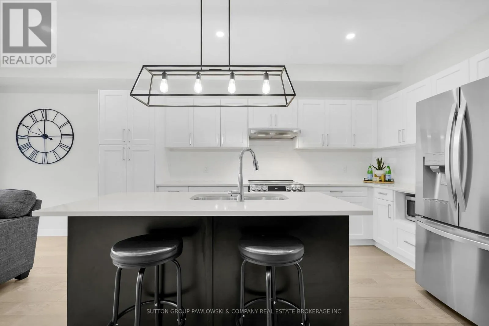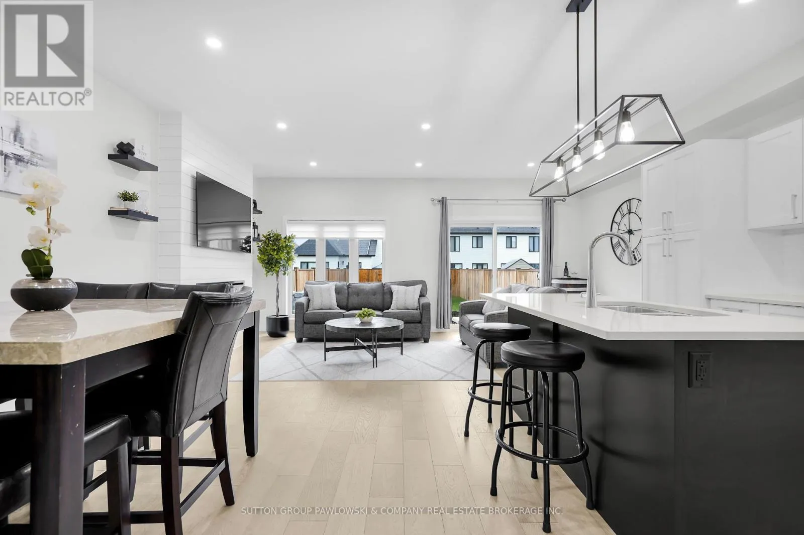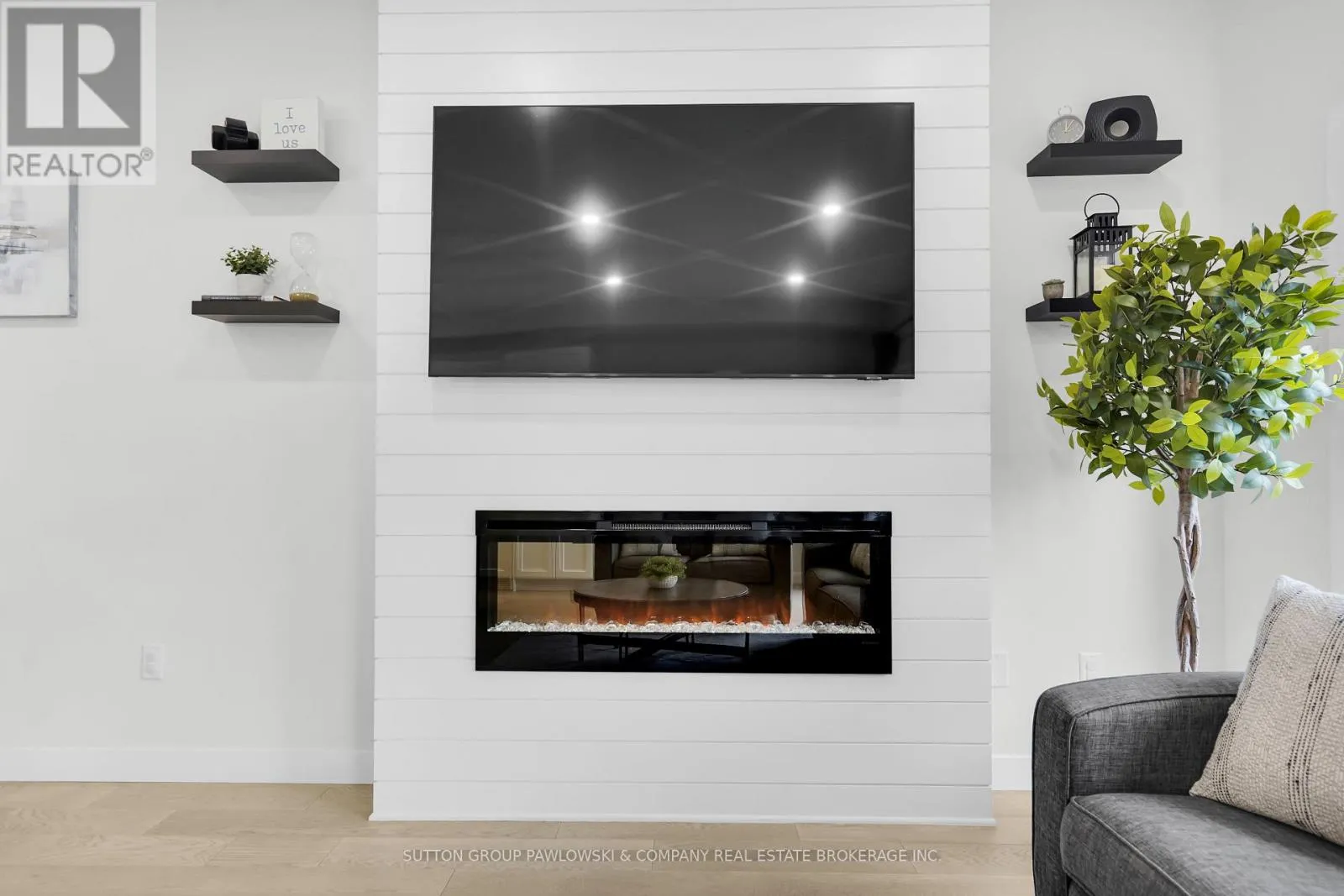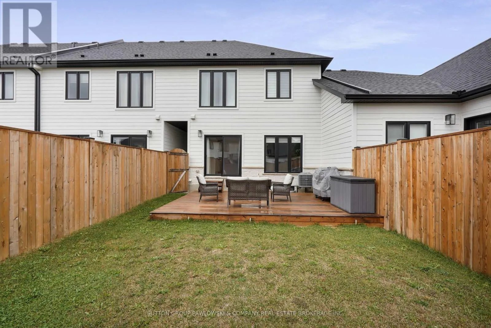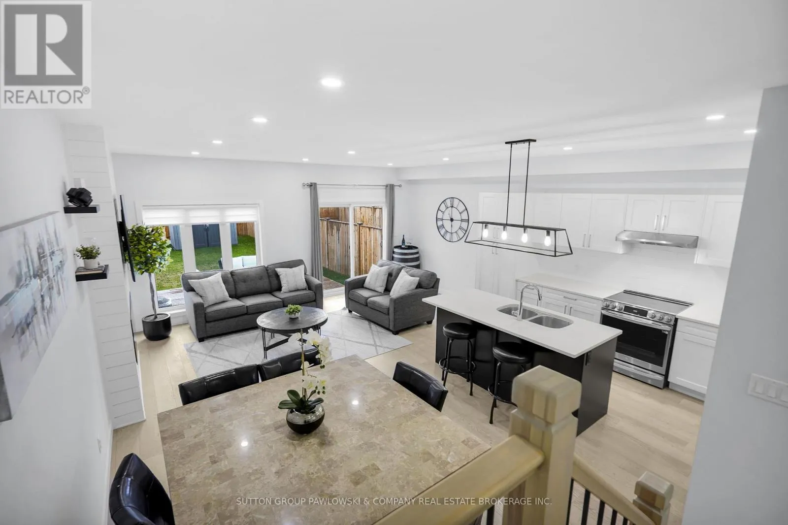 Cross Streets: Crestview Drive. ** Directions: . Welcome to this stylish freehold townhome in the highly sought-after Kilworth Heights West community. Offering approximately 1,745 sq ft of well-designed living space, this modern 2-storey home features 3 bedrooms, 2.5 bathrooms, and an attached single-car garage with inside entry - all with no condo fees. The bright, open-concept main floor is ideal for everyday living and entertaining, showcasing wide-plank flooring, a spacious living area with contemporary electric fireplace, and large windows that flood the space with natural light. The sleek kitchen is the heart of the home, complete with quartz countertops, modern cabinetry, stainless steel appliances, and a large island with seating. Patio doors lead to a private, fully fenced backyard with deck - perfect for outdoor dining and relaxation. Upstairs, the generous primary bedroom offers a walk-in closet and a beautifully finished ensuite with double vanity and glass shower. Two additional bedrooms, a full bathroom, and convenient upper-level laundry complete the second floor. The unfinished lower level provides excellent potential for future living space or storage. Located in a family-friendly neighbourhood close to parks, schools, shopping, and amenities, with quick access to Highways 401 and 402. A move-in-ready opportunity in one of Kilworth's most desirable communities. (id:27476)