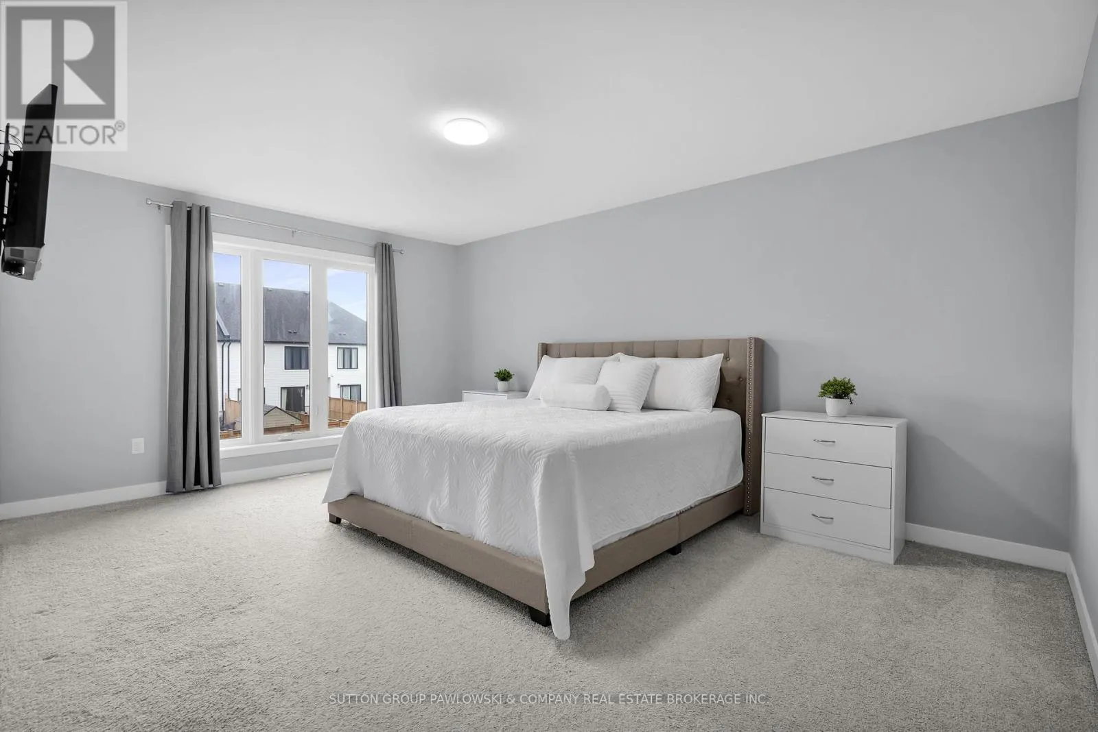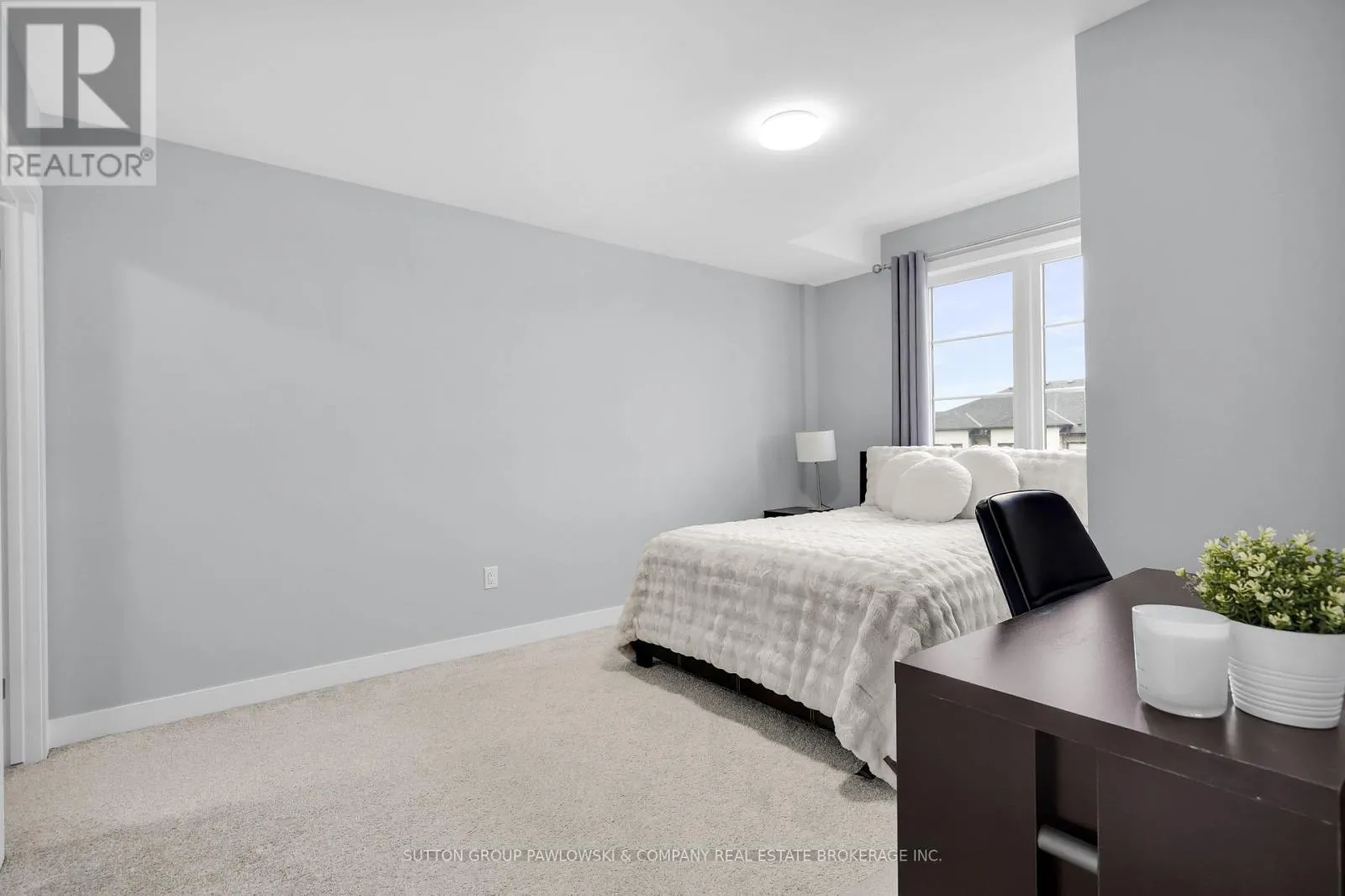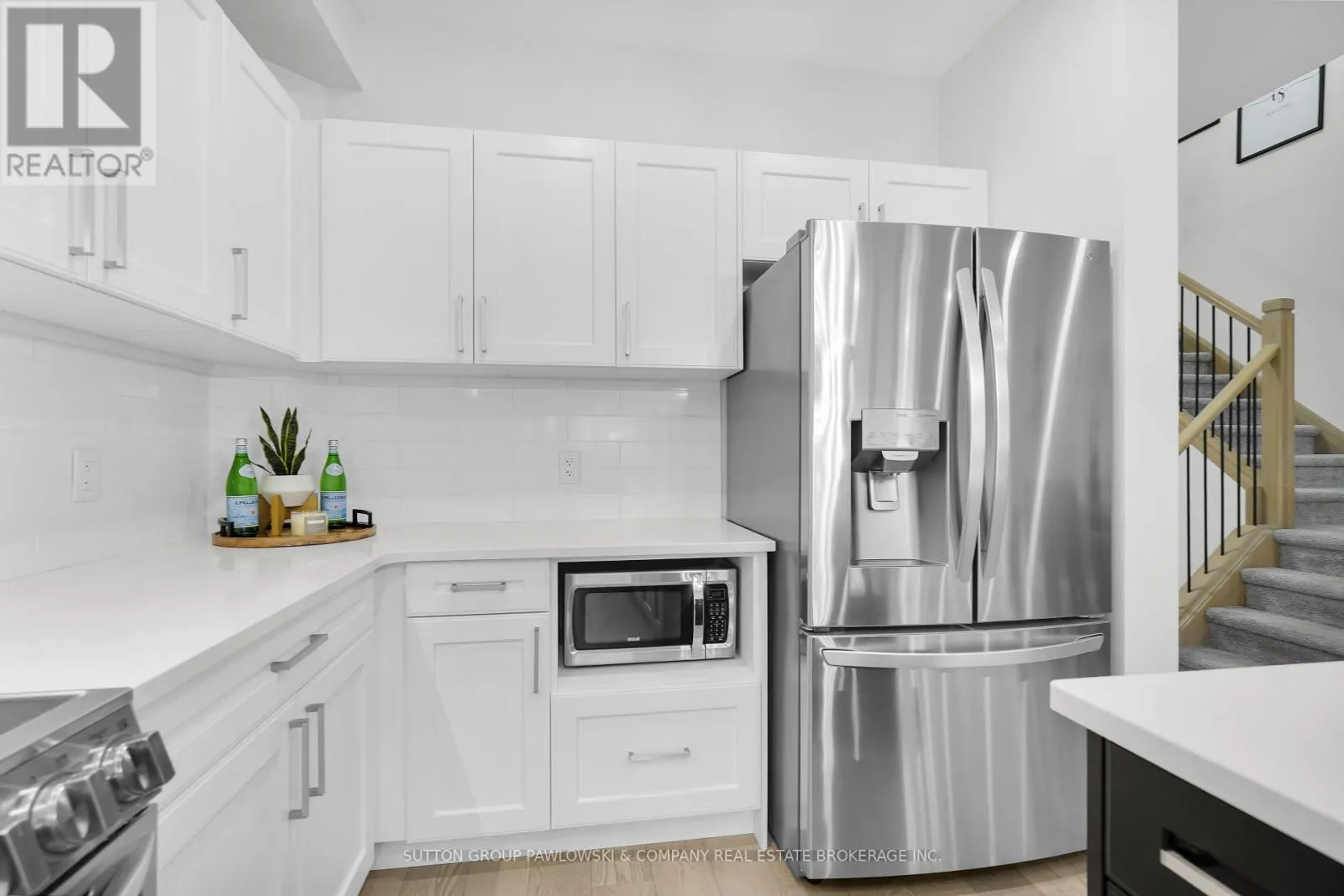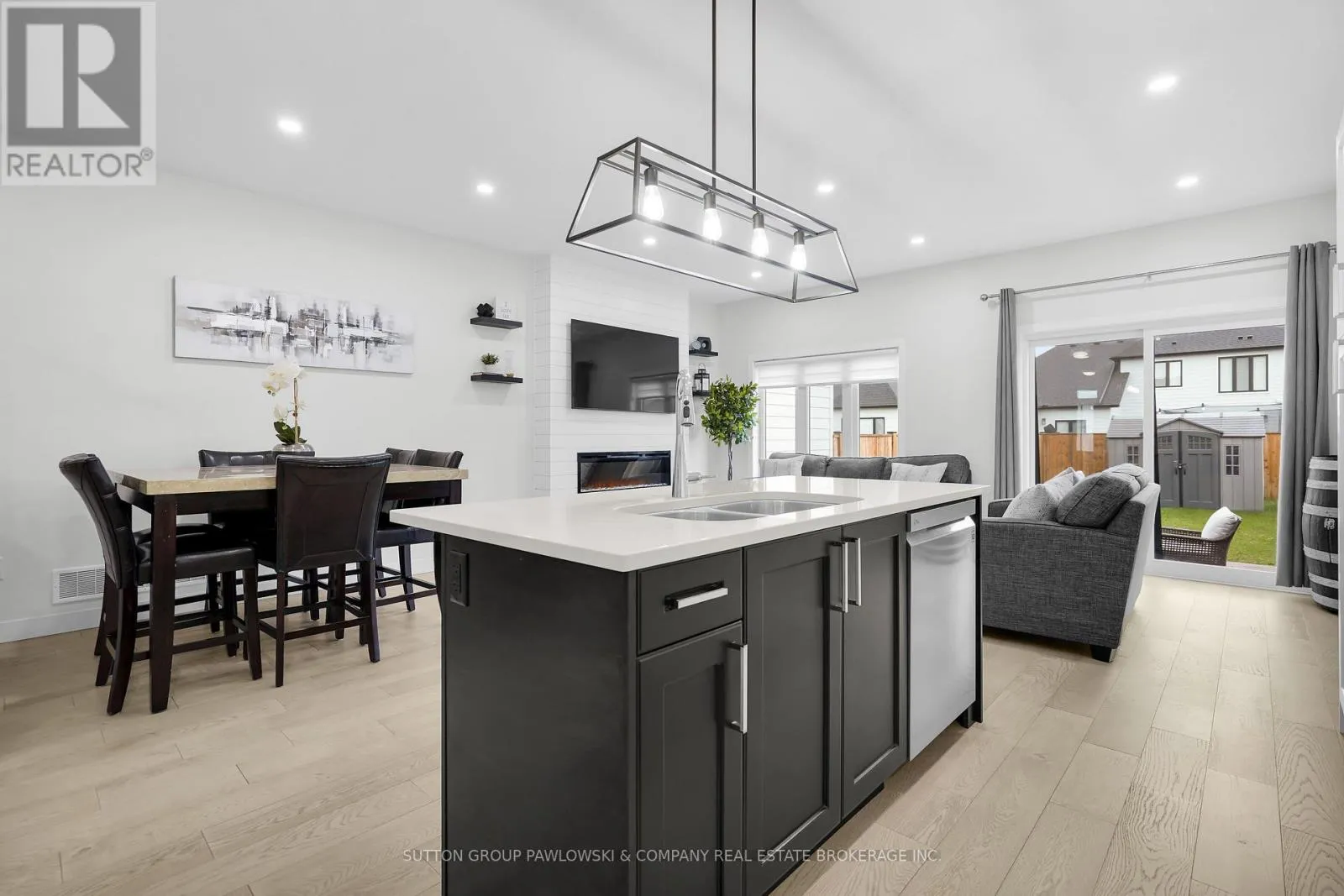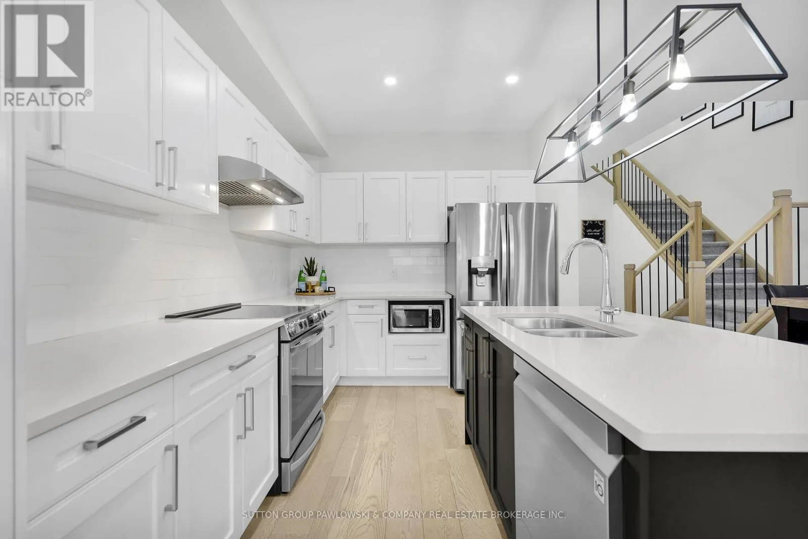 Cross Streets: Crestview Drive. ** Directions: . Welcome to this stylish freehold townhome in the highly sought-after Kilworth Heights West community. Offering approximately 1,745 sq ft of well-designed living space, this modern 2-storey home features 3 bedrooms, 2.5 bathrooms, and an attached single-car garage with inside entry - all with no condo fees. The bright, open-concept main floor is ideal for everyday living and entertaining, showcasing wide-plank flooring, a spacious living area with contemporary electric fireplace, and large windows that flood the space with natural light. The sleek kitchen is the heart of the home, complete with quartz countertops, modern cabinetry, stainless steel appliances, and a large island with seating. Patio doors lead to a private, fully fenced backyard with deck - perfect for outdoor dining and relaxation. Upstairs, the generous primary bedroom offers a walk-in closet and a beautifully finished ensuite with double vanity and glass shower. Two additional bedrooms, a full bathroom, and convenient upper-level laundry complete the second floor. The unfinished lower level provides excellent potential for future living space or storage. Located in a family-friendly neighbourhood close to parks, schools, shopping, and amenities, with quick access to Highways 401 and 402. A move-in-ready opportunity in one of Kilworth's most desirable communities. (id:27476)