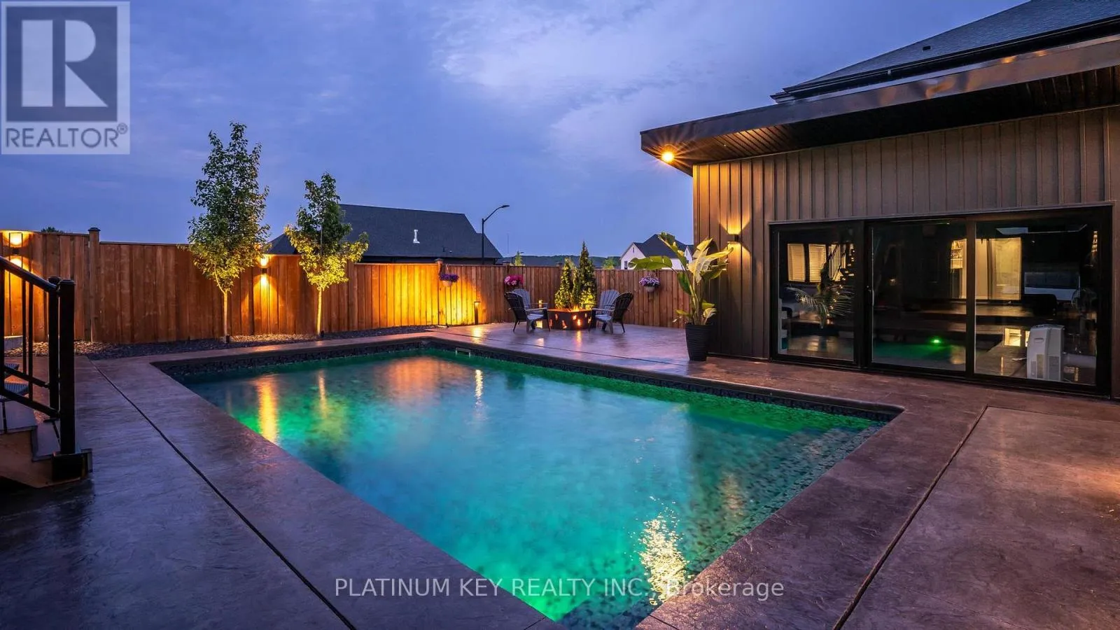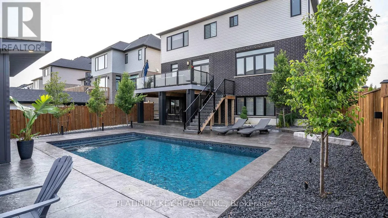 Cross Streets: Crestview Drive. ** Directions: From Glendon Dr (hwy 14), turn South on Crestview Drive, then Southwest on Daventry Way. Comfortable, luxury living in this stunning two storey Home in Kilworth. Situated on a fully fenced corner lot, this modern and elegant home features a walkout basement and a show-stopping backyard retreat. Built in 2022 with extensive upgrades completed in 2023, this 4+1 bedroom, 4.5 bathroom home offers over 3,000 sq ft of finished living space, including a sleek open-concept main floor with a gas fireplace, formal dining room, and a designer kitchen with built-in stainless appliances, gas stove, quartz island, and access to a tiered vinyl deck overlooking the Thames River Valley. Upstairs, two of the four bedrooms have private ensuites, including a luxurious primary suite with walk-in closet and spa-style 5-piece bath. The Third and Fourth bedroom share access to a jack-and-jill style ensuite bathroom. The finished walkout basement includes a custom bar, family room, gym, dedicated wine cellar, guest bedroom, and 3-piece bath with heated floors. Step outside to your private oasis with a heated inground pool (programmable pump, puck chlorinator, 300,000 BTU heater), fully powered pool cabana with gas heat, A/C, water & internet. Outdoor living enhanced by the professionally designed landscaping with WiFi-controlled lighting and a lawn sprinkler system for easy maintenance. The immaculate heated, 2-car garage is in showroom condition with direct access to the main floor laundry and plenty of space for storage or hobby use. Kilworth offers a peaceful, family-friendly lifestyle just minutes from London's West end amenities, trails, parks, and the Thames River. (id:27476)