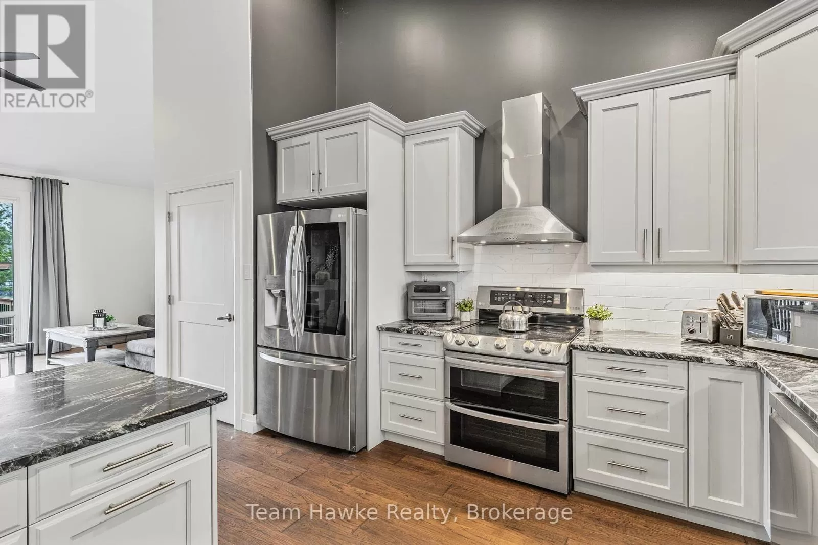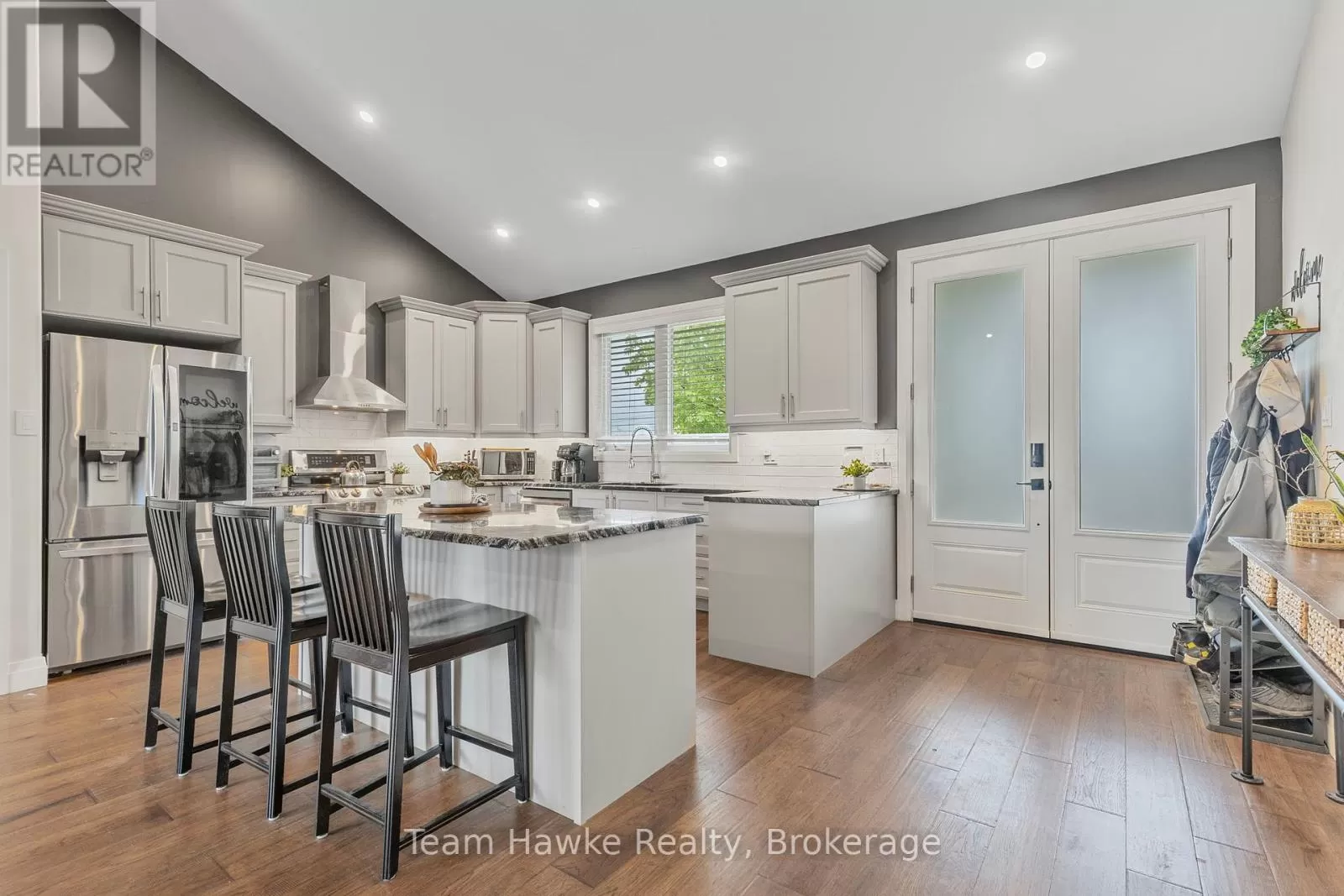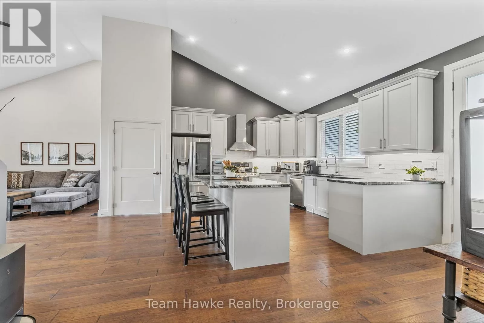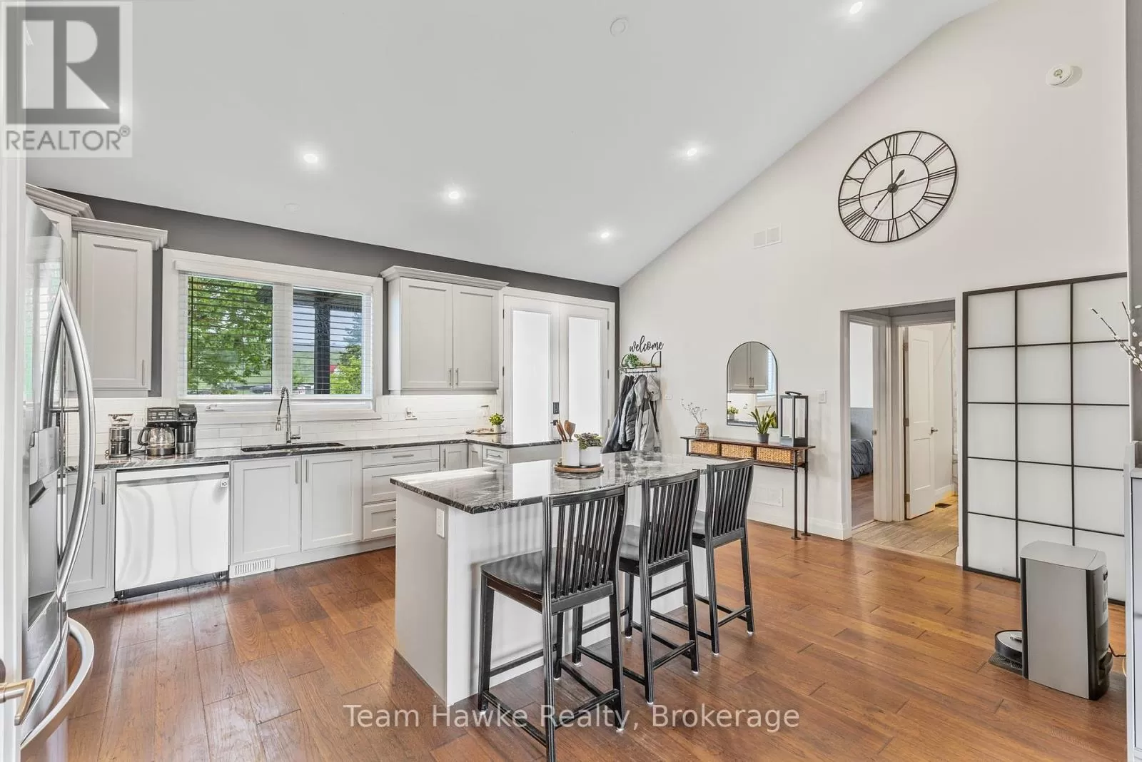 Hwy 12 - William St Built in 2021, this home offers a stylish, functional layout with quality finishes throughout, ideal for modern living! Step inside to find hardwood floors and a spacious open-concept design with soaring cathedral ceilings that give the main living areas an airy, welcoming feel. The kitchen is well-equipped with stainless steel appliances, a large granite island and plenty of cupboard space, giving you the ultimate prep space, and made for entertaining. The main floor includes two comfortable bedrooms, including a primary with its own private 3-piece ensuite and wall to wall closet. The second bathroom on this level stands out, featuring a deep soaker tub and elegant tile with creamy tones and rich, rust-coloured veining, paired with quartz counters, these features all bring a spa-like touch to the space. Youll also find the convenience of main floor laundry tucked neatly into the layout. Off the living room, walk out to your back deck and enjoy a fully fenced backyard that feels private and peaceful, filled with mature trees and only one direct residential neighbour. The finished basement expands your living space with a generous rec room, a third bedroom, and a full four-piece bathroom. Theres also a kitchen area ready for appliances, ideal for extended family, guests, or in-law potential. If youre looking for a move-in-ready home with flexible space, thoughtful design, and privacy, this one is well worth a look! (id:27476)