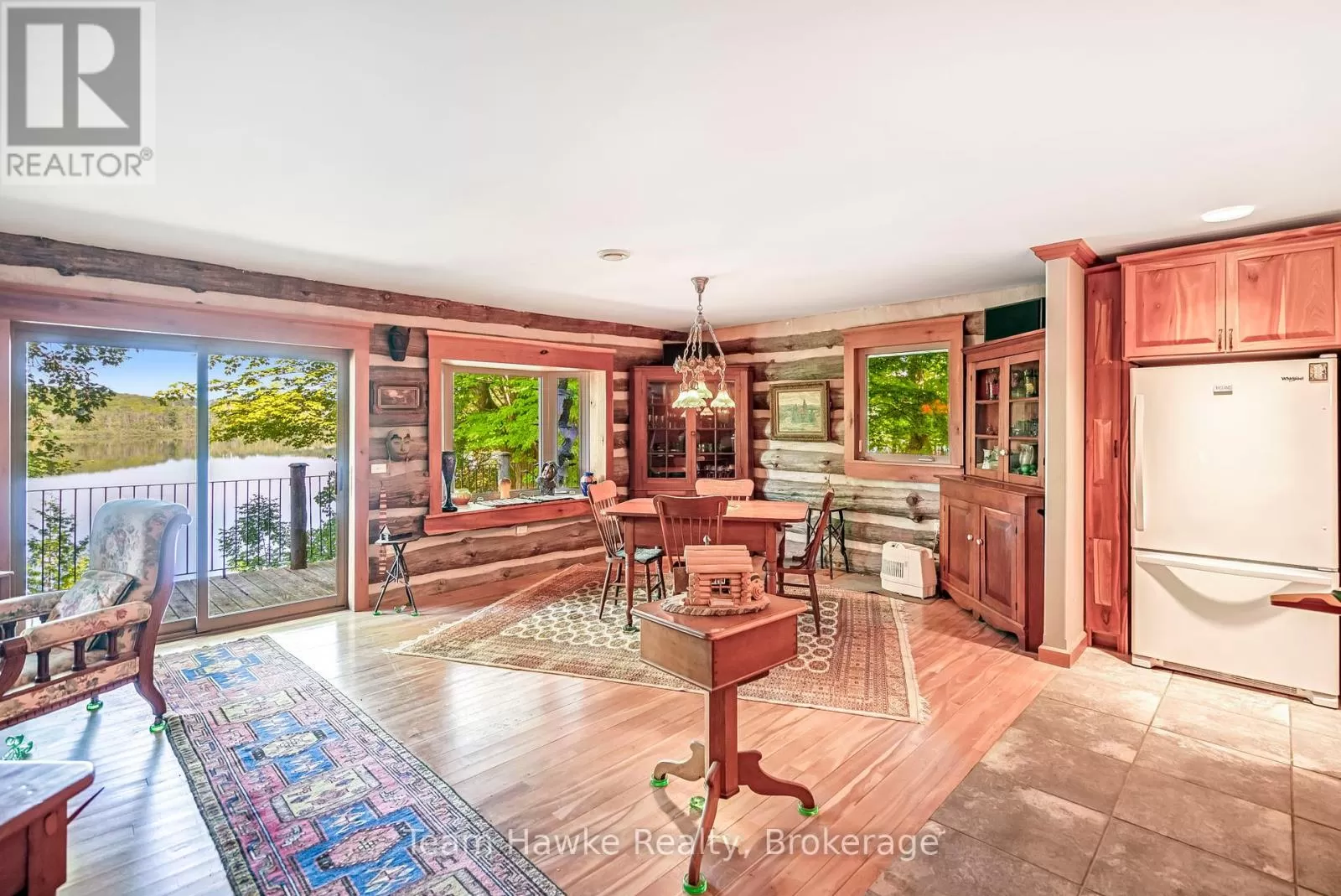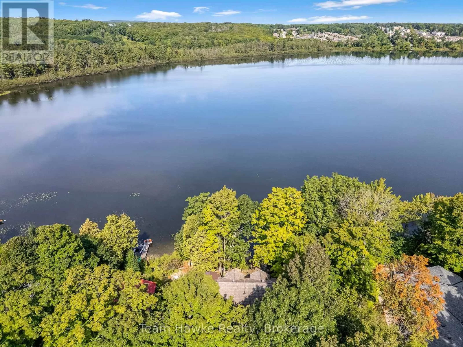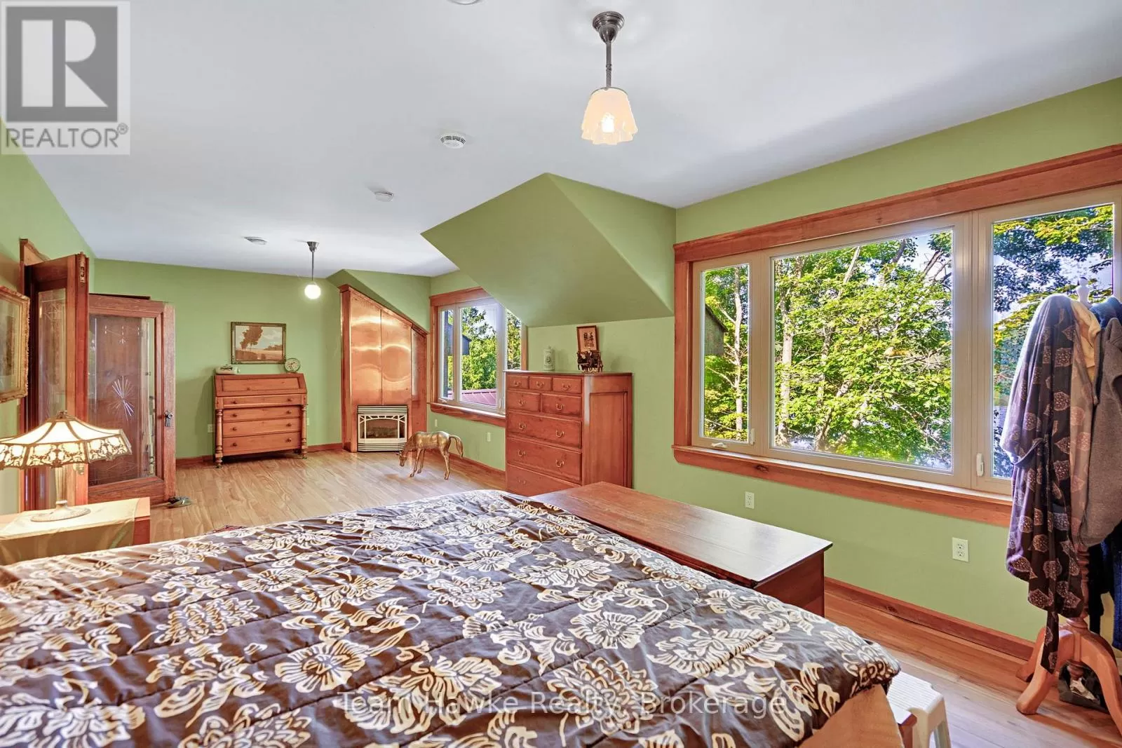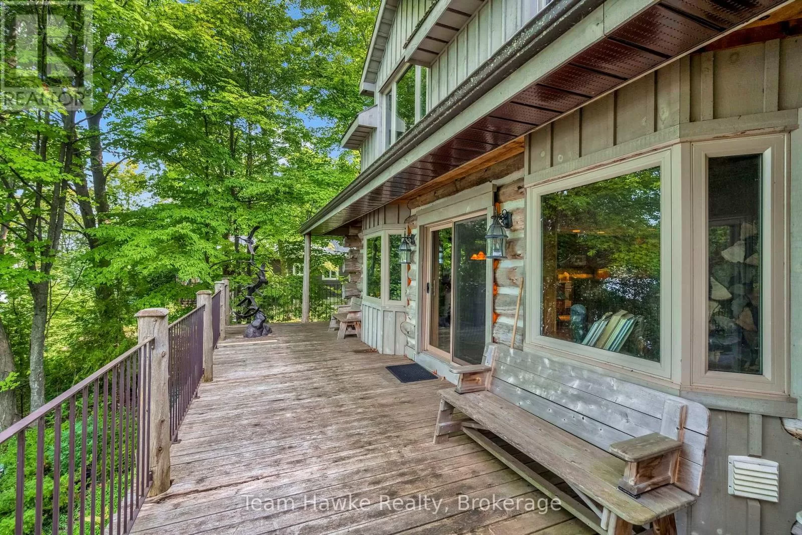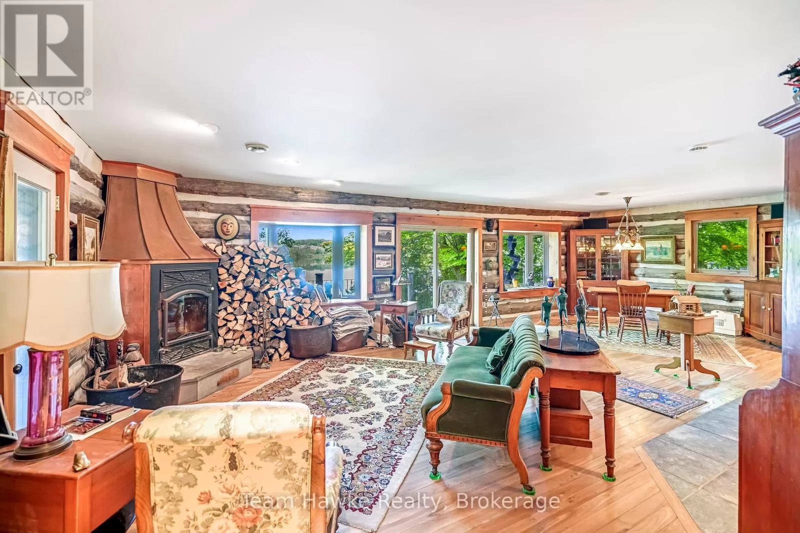 Cross Streets: Heritage Drive. ** Directions: Heritage Drive - Sumac Lane. One of only eleven waterfront properties on Sumac Lane, this stunning four-season log home, built in 2005, offers just under 74 feet of frontage on Little Lake. Tucked away on a privately maintained road, the home screams rustic charm, creating an ideal year-round residence or weekend retreat. Inside, the heart of the home is the large chefs kitchen, complete with a generous island and open to the main floor living and dining areas, perfect for entertaining family and friends. Beautiful cherry floors and cupboards complement the natural log construction, while three copper-surround fireplaces (one on each level, including in the primary bedroom) add warmth and character throughout. The spacious primary suite spans the full length of the home along the water side, offering breathtaking views. The walk-out basement features a large recreation room, sauna, and easy access to the outdoors. Enjoy the wrap-around porch, expansive back deck overlooking the water, and a fully screened-in sunroom off the main living room. Only 90 minutes from the GTA, this property offers a rare combination of privacy, comfort, and peaceful waterfront living that could either be your home away from home, or your full time residence. (id:27476)