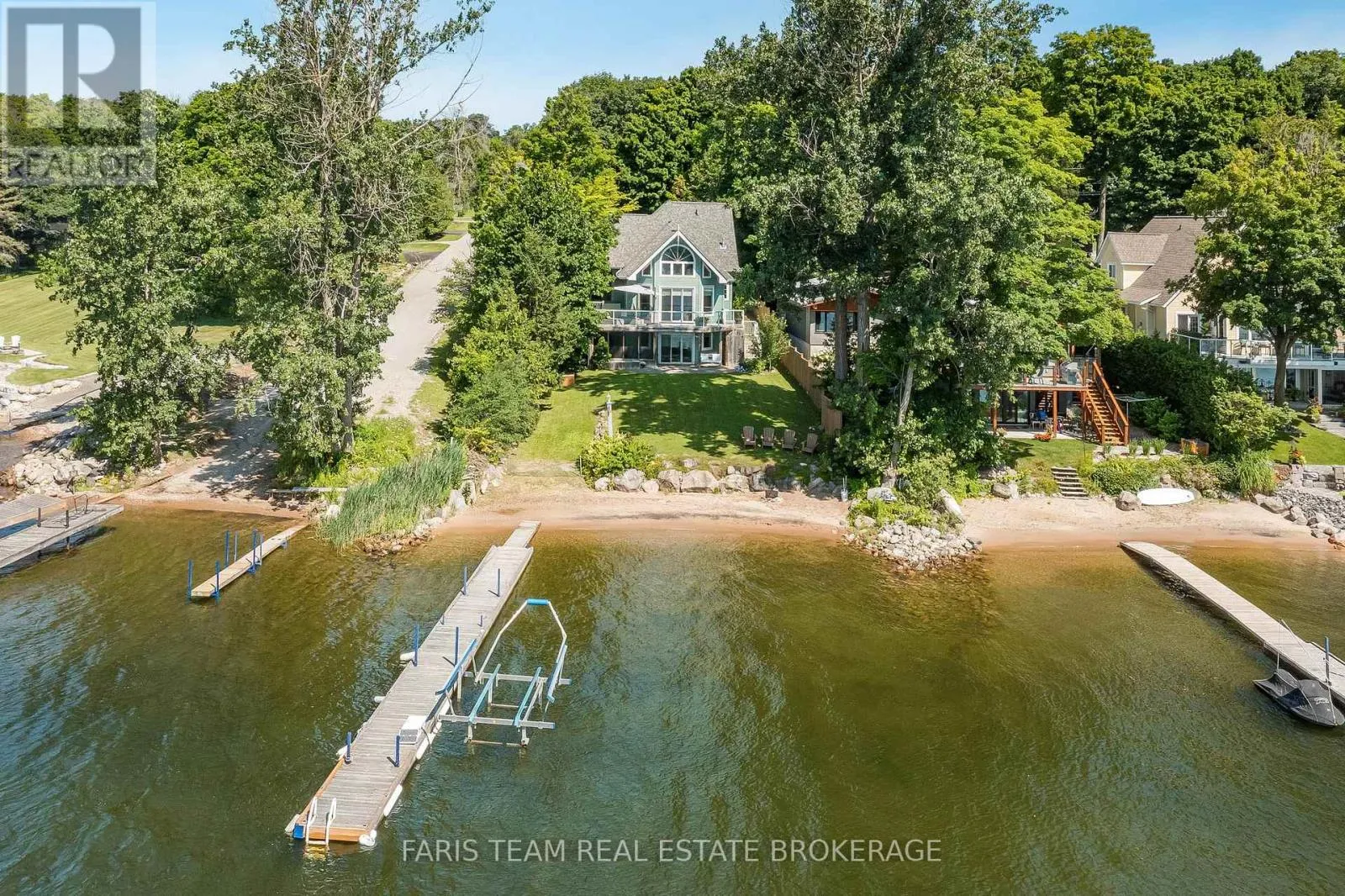 Edwards Ln/Puddicombe Rd Top Reasons You Will Love This Home: Set on a picturesque peninsula along the sheltered lee shore of Midland Bay, this exceptional custom-built waterfront home commands breathtaking 260-degree views of ever-changing lake and sky. Offering direct access to the water with a private dock, boat lift, sandy beach, and three integral garages, the property delivers a rare blend of luxury and lifestyle. Inside, recently painted interiors and newly installed engineered hardwood floors on both levels complement vaulted ceilings and an open-concept design where the kitchen, dining area, and living room with a gas fireplace flow seamlessly together and extend onto a wraparound deck ideal for entertaining. The upper level hosts a serene primary suite with a walk-in closet, an oversized spa-inspired ensuite, and expansive windows framing the water, alongside two additional bedrooms, a full bathroom with a separate toilet, built-in cabinetry, and a convenient laundry room. The fully finished walkout basement adds remarkable flexibility with two spacious guest rooms, a 3-piece bathroom, cold storage, and a large family room with a gas fireplace opening to a bricked patio and screened-in covered porch. Professionally landscaped grounds with mature trees, natural stone, lush lawns, and curated plantings, combined with the privacy of a quiet end-of-road setting, create a peaceful retreat to be enjoyed year-round. 3,550 fin.sq.ft. (id:27476)
