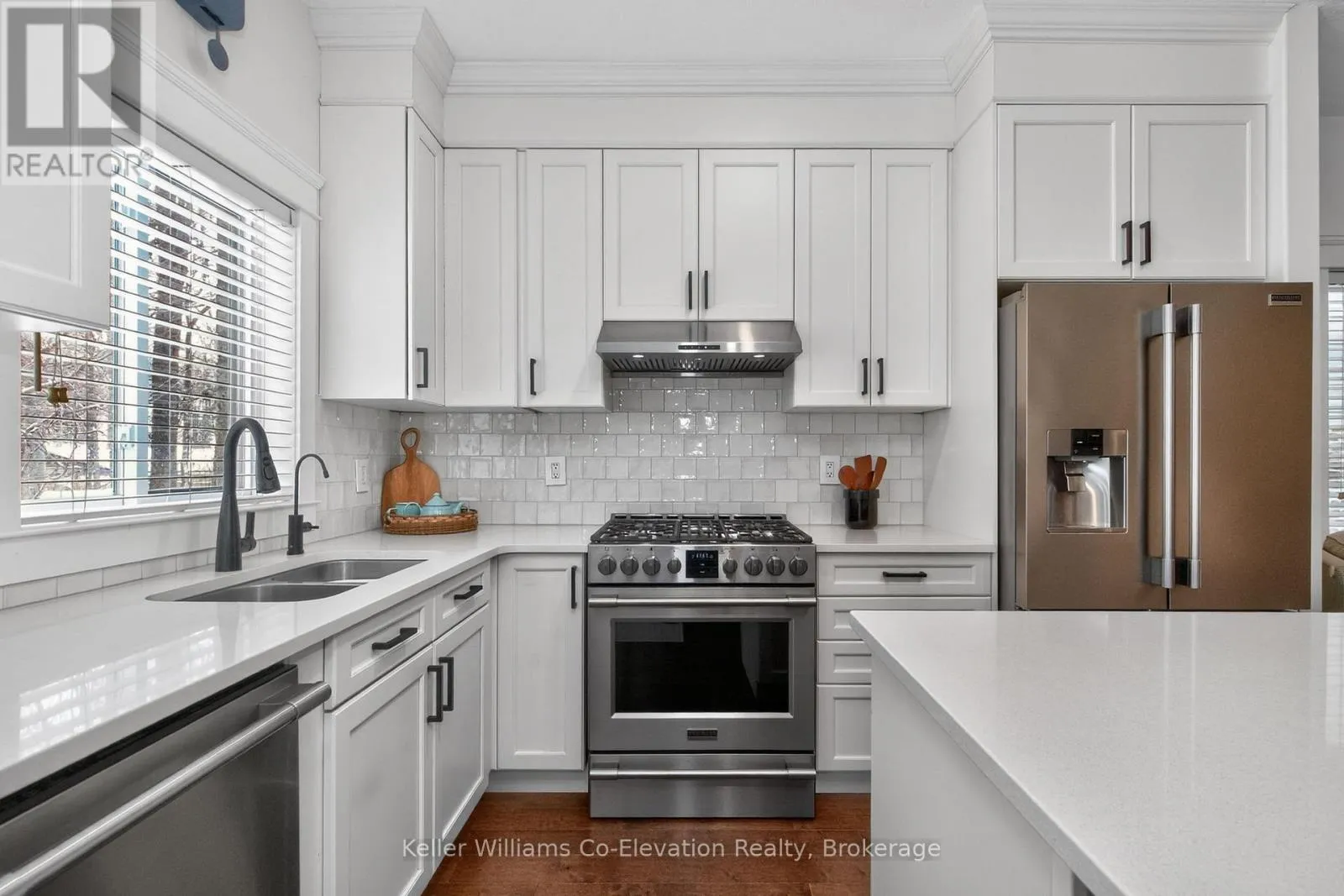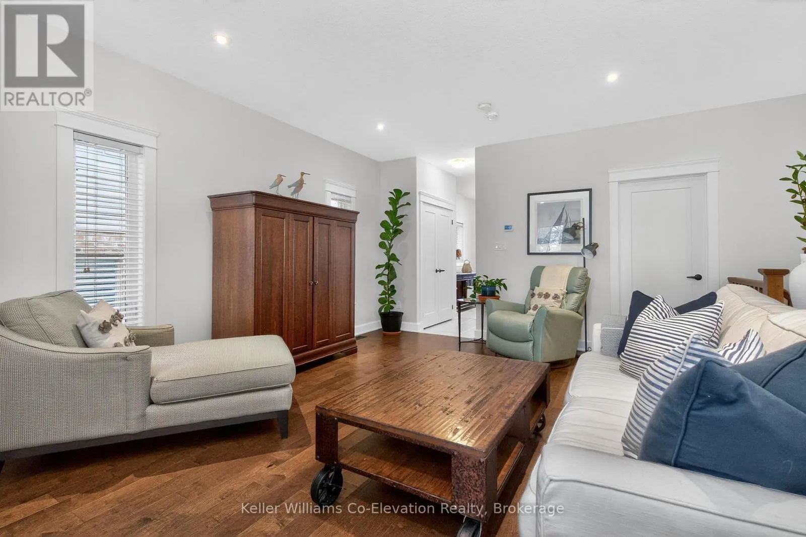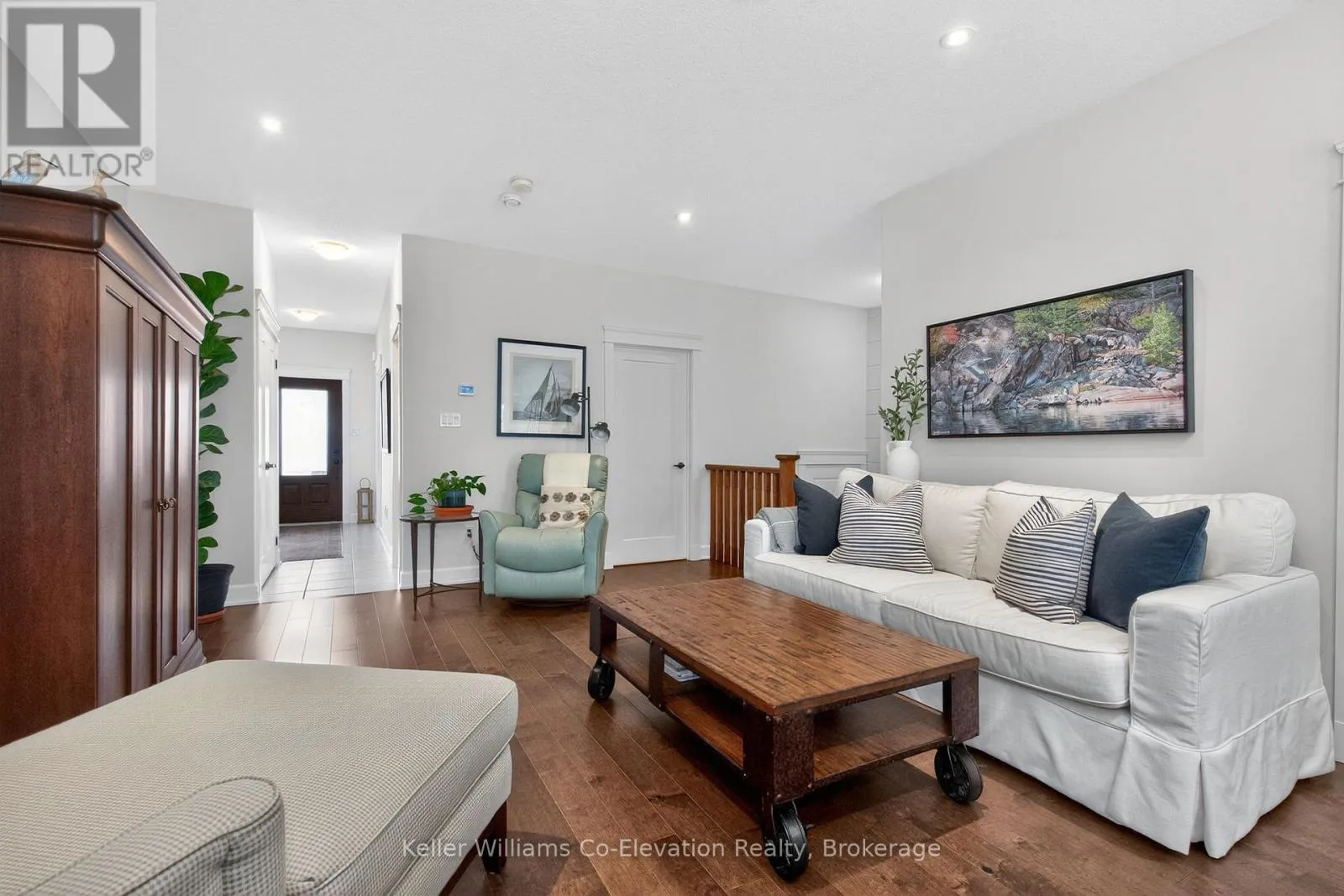 Cross Streets: Penetanguishene Rd/Hugel Ave. ** Directions: Hwy 93 to Hugel Ave to Penetanguishene Rd to Cook Dr. Over $75,000 in documented upgrades set this home apart. Welcome to 1046 Cook Drive in The Grove, a sought-after Craftsman-style neighbourhood in Midland's desirable west end. Built in 2016 by award-winning Devonleigh Homes, this one-owner, meticulously maintained home sits on a premium lot backing onto a forested buffer zone for added privacy. This home includes over $50,000 in builder upgrades plus $26,000+ in additional improvements, making it truly move-in ready and well above typical comparables. Interior features include 9-foot ceilings, upgraded engineered hardwood flooring, Craftsman trim and oak staircase details, upgraded door hardware, and pot lighting in the living room and kitchen. The kitchen offers tall cabinetry with crown moulding, Cambria quartz countertops and island, extended breakfast bar, new zellige tile backsplash, stainless steel hood fan, and upgraded garden doors leading to a beautiful stamped concrete patio. The primary bedroom includes a walk-in closet and upgraded ensuite with air-jet tub and porcelain tile. Main-floor laundry features new cabinetry (2025) and Maytag front-load washer and dryer. The landscaped yard includes perennial gardens, privacy fencing, leaf-guard gutters, updated outdoor lighting, and a large stamped concrete patio overlooking the treed backdrop. Additional highlights include Frigidaire Professional stainless steel appliances with gas range, Lennox central air, insulated and drywalled garage with inside entry, water softener (2023), Kinetico K5 reverse osmosis system (2024), custom soundproofing on adjoining walls, and a high, dry unfinished basement with oversized windows, gas fireplace rough-in, and roughed-in 3-piece bath. This 2-bedroom, 2-bath home offers easy main-floor living with no condo fees, walking distance to shopping, hospital, restaurants, and theatre, and close to trails, parks, beaches, and Georgian Bay. Pride of ownership is evident throughout. (id:27476)