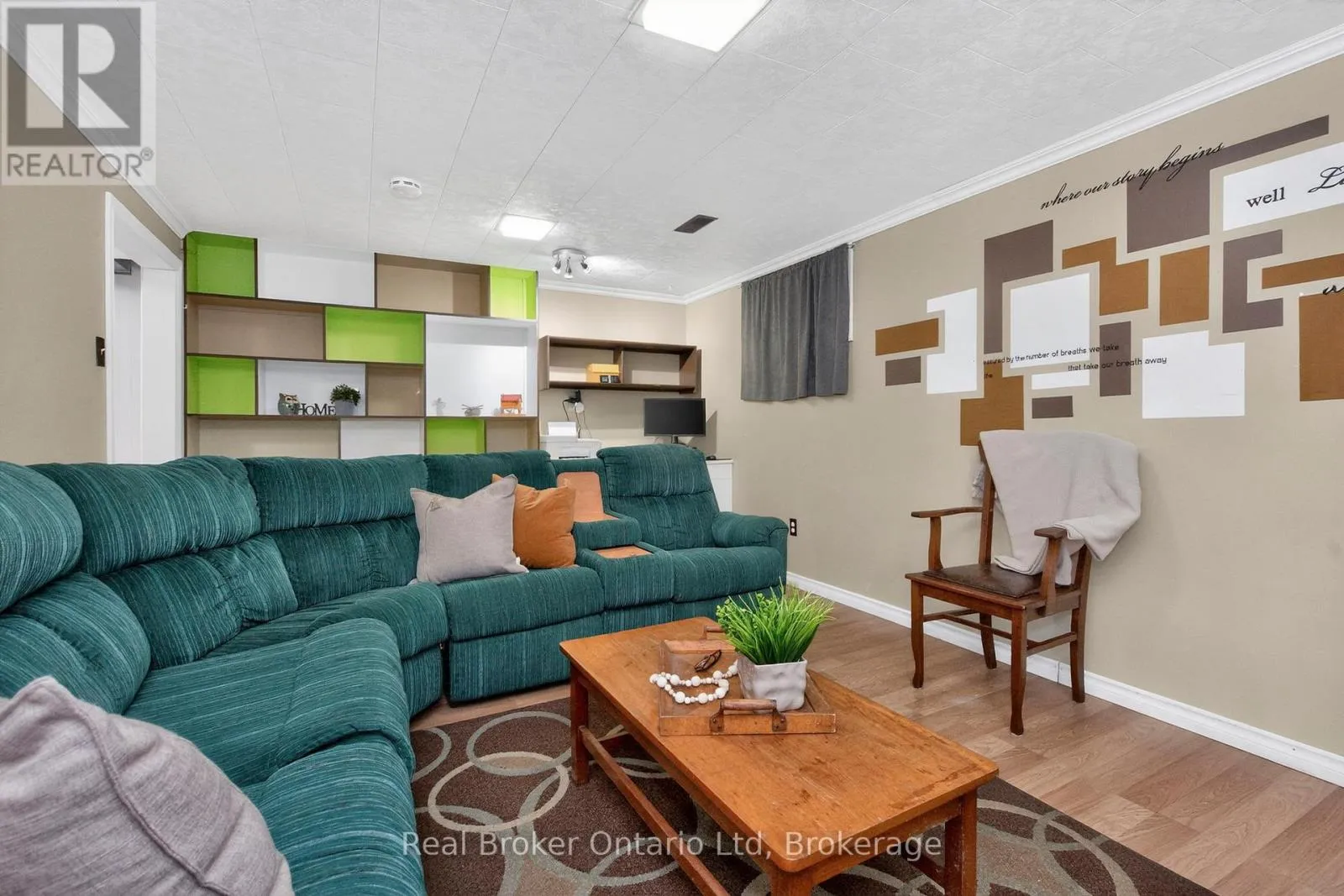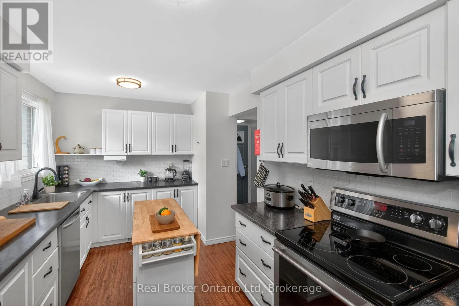 Cross Streets: Penetanguishene Rd/Hugel Ave. ** Directions: Hwy 93 (Penetanguishene Rd to Hugel Ave to Woodland Dr. Charming 2-Storey Family Home in a Fantastic Location! Welcome to this 2-storey family home offering great curb appeal and an unbeatable location directly across from a park and ball diamond-perfect for family fun and outdoor recreation. You'll love being just a short walk from Monsignor Castex, Bayview, and Georgian Bay District Secondary Schools, plus convenient access to shopping, the hospital, and medical centre-everything you need is right nearby. Step inside to find a welcoming space filled with natural light from updated windows and excellent flow for family living and entertaining. You will enjoy preparing meals in the lovely kitchen with stainless steel appliances and a portable island included. Walkout from the dining area to a large, durable, two-tier composite decking system including a large gazebo overlooking the private back yard. A new chain link fence will be installed by the seller in April across the back of the property. Upstairs you will find 3 bedrooms and a beautifully renovated full bath; and in the lower level a large rec room with cozy gas stove, a 2 piece bath, laundry, and plenty of storage space. The lovely stone walkway leads to the front door, while the oversized single attached garage with inside entry and a newer 12' wide door adds convenience and additional storage. The paved driveway easily accommodates parking for four vehicles. Enjoy the best of outdoor living, family comfort, and central convenience in this terrific property ready to welcome its next owners! (id:27476)