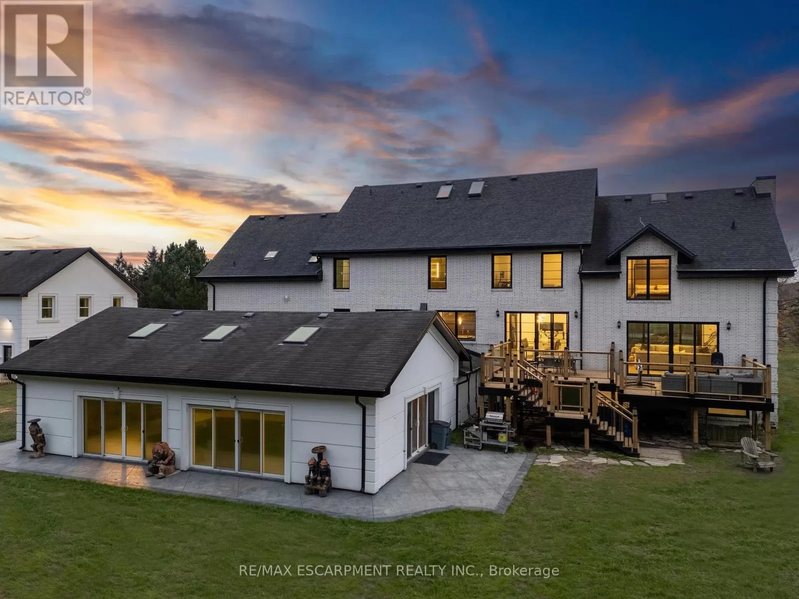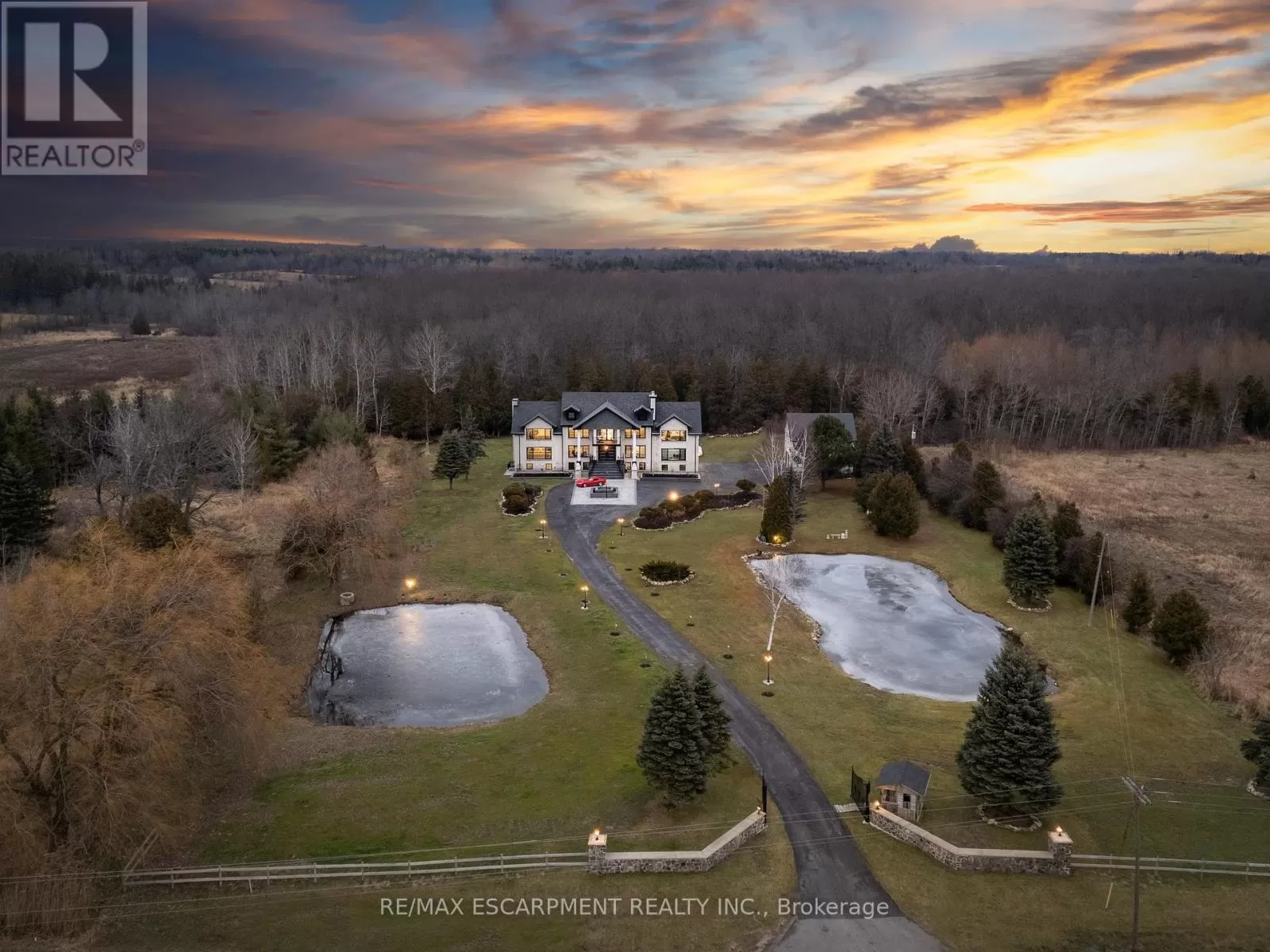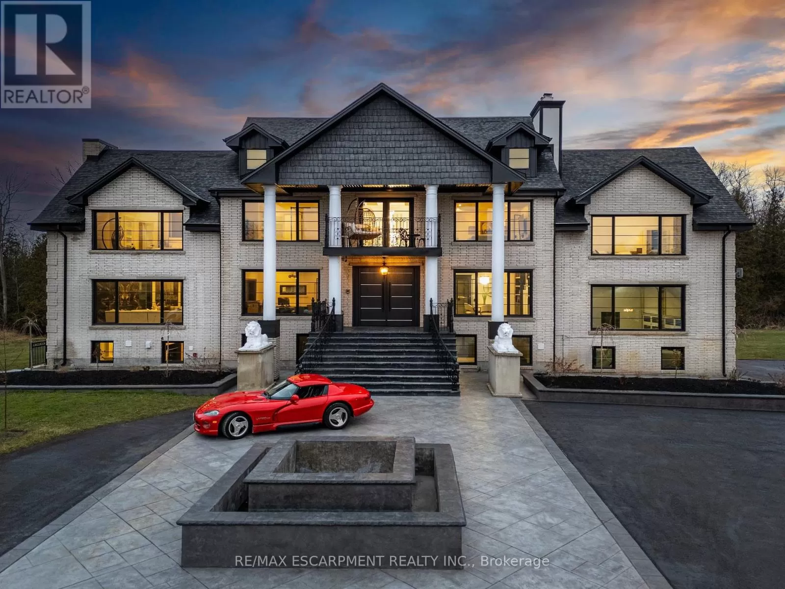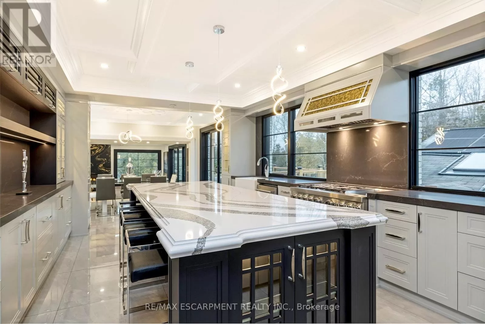 North of the 401, Guelph Line and 20 Side Road Step into a world of opulence and sophistication with this extraordinary estate, a true architectural masterpiece offering over 9,000 square feet of exquisite living space. Located in Campbellville, this 10-bedroom, 8-bathroom residence redefines luxury living with impeccable design, craftsmanship, and attention to detail. Crown moldings throughout the house, accentuating the timeless elegance of the interiors. The expansive living spaces feature soaring high ceilings, five custom fireplaces, and an abundance of natural light streaming through oversized windows, designed for the ultimate entertainer, this estate boasts four state-of-the-art kitchens, including a primary chef's kitchen with professional-grade appliances, custom cabinetry, and an oversized island. Whether hosting an intimate gathering or a grand soirée, this home offers unmatched versatility and style. The property includes a private guest house and a thoughtfully designed in-law suite, perfect for accommodating extended family or visitors in comfort and privacy. Outdoor living is equally impressive, with manicured grounds ideal for relaxation or entertainment. The8-car garage provides ample space for a car enthusiast's collection, while the home's multiple balconies and patios create seamless indoor and outdoor flow along side the massive indoor pool. UPPER LEVEL IS REFERRING TO THE GUEST HOUSE (2 BEDS, 1 BATH, 1 KITCHEN). LUXURY CERTIFIED. (id:27476)