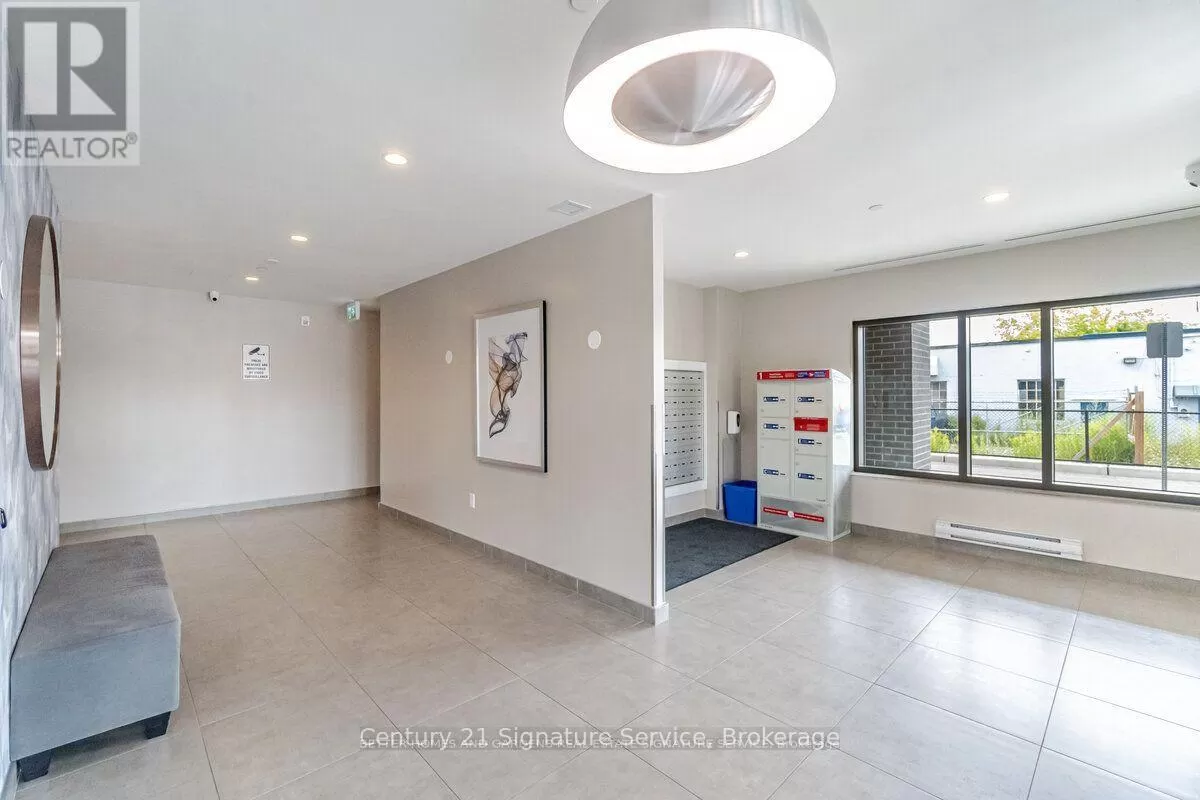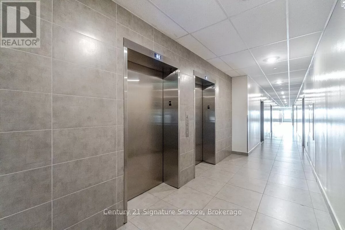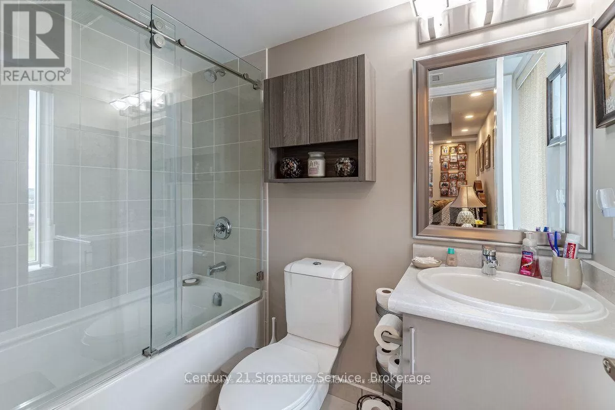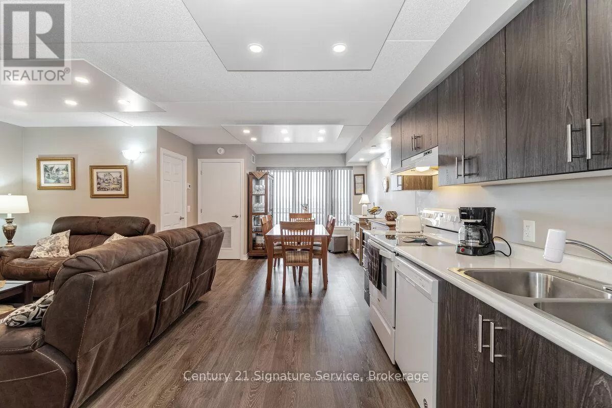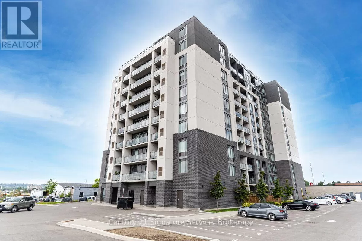 Main St / Thompson Rd this beautifully upgraded 2-bedroom + den, 2-bathroom corner unit offers 1,005 sq ft (+55 sq ft balcony) of sun-drenched space, with captivating northwest views of the Escarpment. Designed for both comfort and style, the open-concept layout features high-quality plank laminate flooring and cozy broadloom in the bedrooms. The modern kitchen is appointed with rich dark cabinetry, generous storage, and flows effortlessly into a bright living space?perfect for entertaining or relaxing. Step onto the spacious balcony to take in stunning sunsets and fresh air. The primary bedroom is a serene retreat, complete with a 4-piece ensuite and walk-in closet. Both bathrooms feature sleek tiles and tasteful finishes, with thoughtful upgrades throughout. Custom pot lights add warmth and charm. Enjoy premium building amenities, including a rooftop BBQ terrace, stylish party room, meeting space, guest suite, and ample visitor parking. Conveniently located with quick access to Hwy 401/407, just steps from Milton GO, and close to shopping, golf courses, Kelso, organic farms, and more. Includes one parking spot and one locker. (id:27476)