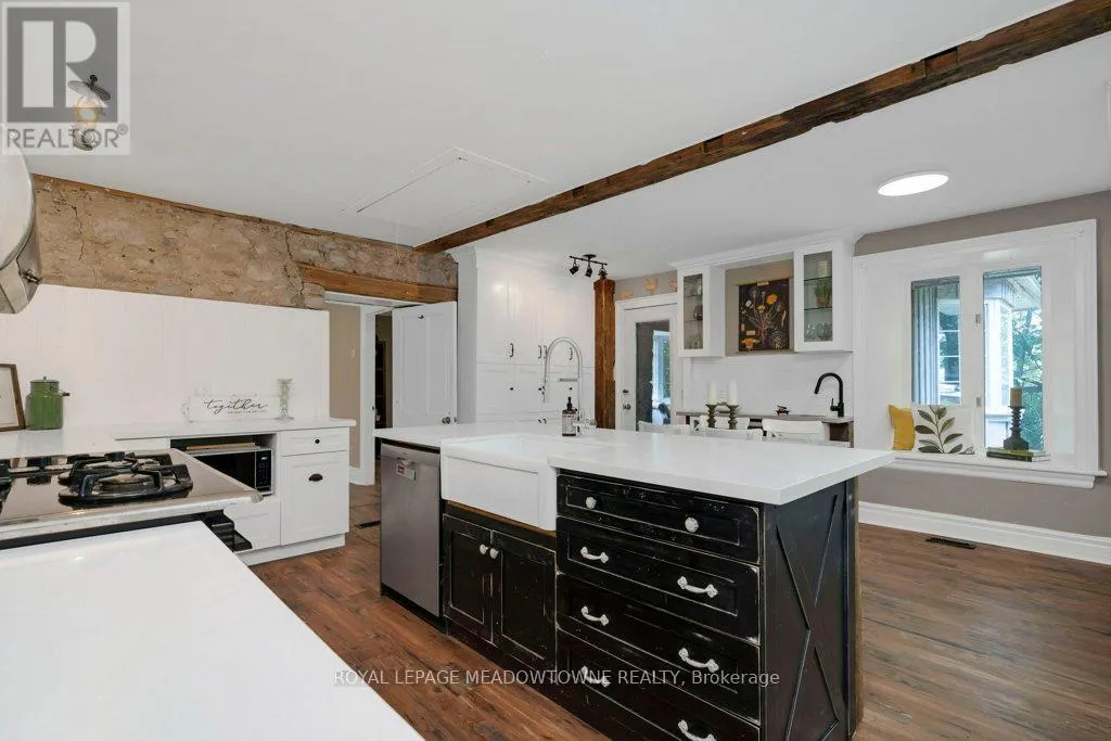 Cross Streets: 25 Side Road & Nassagaweya-Equesing Townline. ** Directions: North of Milton and South of Acton. Experience the timeless beauty of this majestic 1832 Century Stone Farmhouse, nestled on a private 10-acre setting for the ideal hobby farm. This treasured 3,442+ sq ft home seamlessly blends historic charm with thoughtful modern updates. You will be transported back in time with a warm, welcoming interior, soaring ceilings, open hearth wood-burning fireplaces, deep windowsills, and original details. The unique and versatile floor plan can accommodate extended family needs. The recently renovated kitchen showcases a striking stone wall with timber beam accents, stone countertops, hardwood flooring, a vintage-style Elmira Stove, and a centre island with breakfast bar. Separate family, living, and dining rooms provide ample space for both everyday living and special occasions. The formal dining room currently serves as a main-floor primary bedroom, complete with a walk-in closet/office. The 2nd dining area off the kitchen features oversized windows, a striking stone wall, and ample space for a harvest table, with a walkout to the garden. More conveniences include an enclosed sunroom, a mudroom with access to the 2 car garage, main-floor laundry, and a stately wood staircase to the bedrooms Outdoors, enjoy a pool area, views of a tranquil pond, a vegetable garden, storage & barn, and gently rolling open fields that are perfect for exploring and enjoying nature. An energy-efficient heat pump for heat and air conditioning (2019), R50 attic insulation, and updated asphalt shingles. Versatile outbuildings and an attached two-car garage offer ample space for cars, hobbies, toys, motorbike, outdoor gear and more. A generous driveway and laneway provide plenty of parking for cars, trucks, or campers. All this is located just minutes from town amenities, schools, churches, Blue Springs Golf Club, and the GO Train station offering the perfect blend of country living and Town convenience. (id:27476)