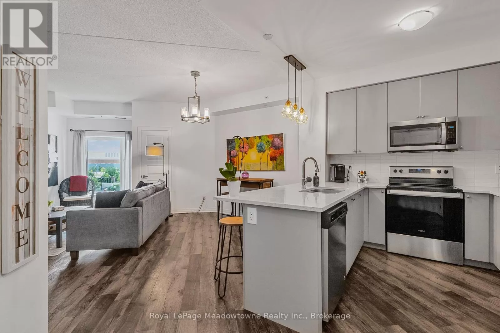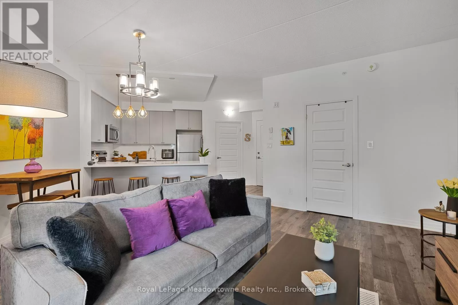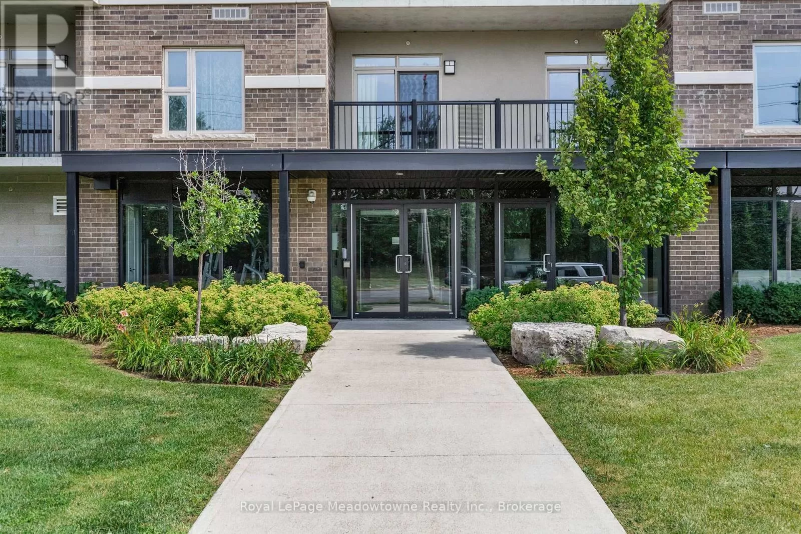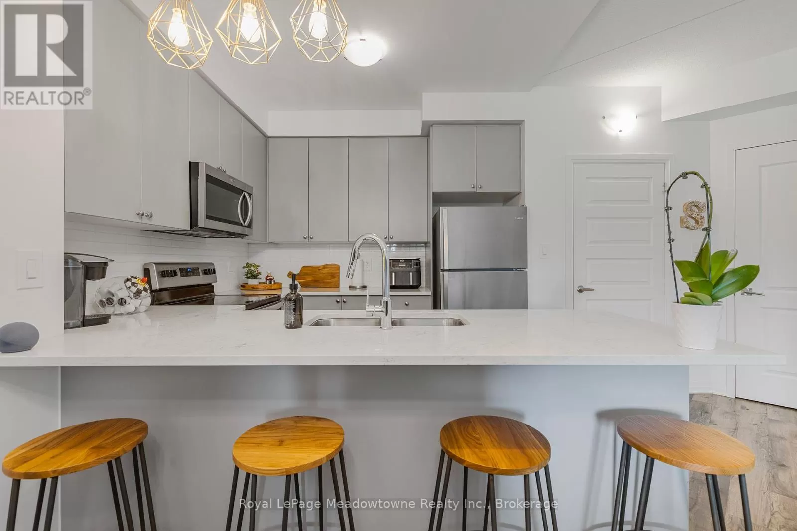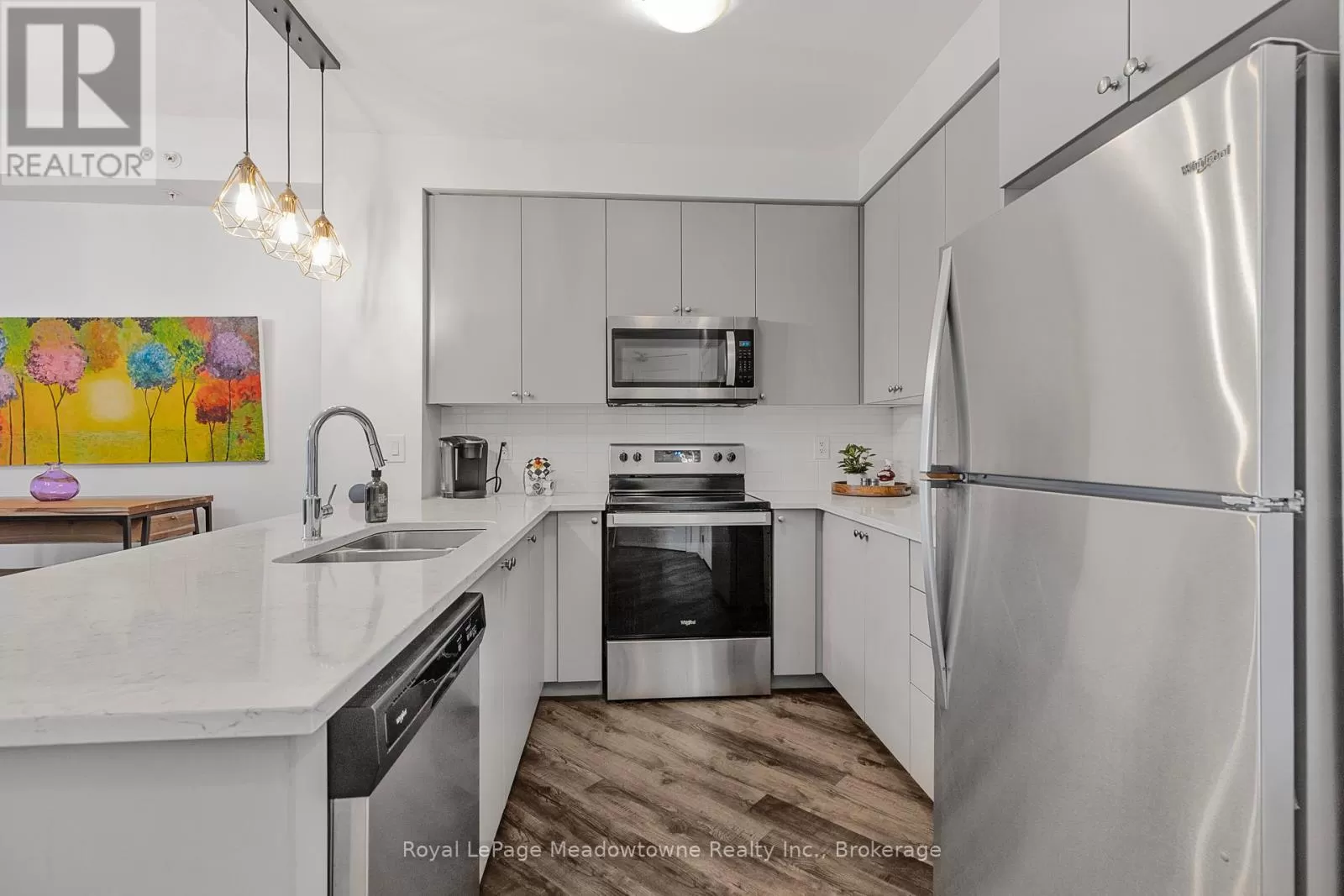 Derry and Farmstead Step into this beautifully designed one bedroom condo featuring a fantastic open floor plan andupscale finishes throughout. The spacious layout offers a seamless flow from the modernkitchen to the living area, ideal for both relaxing and entertaining. The kitchen is a chefs dreamwith Stainless Steel appliances, sleek countertops, backsplash, a HUGE pantry and high-endlight fixtures that add a sophisticated touch.The generously sized bedroom includes a large walk-in closet, while the bathroom offers amplestorage and elegant finishes. With abundant natural light, quality flooring, and thoughtful designelements, this condo combines comfort, functionality, and style.The unit is conveniently located close to schools, shopping the hospital and highway access.One underground parking spot, and 1 storage locker is included.Perfect for first time home buyers, downsizers or investors dont miss the chance to call thisstunning unit home! (id:27476)