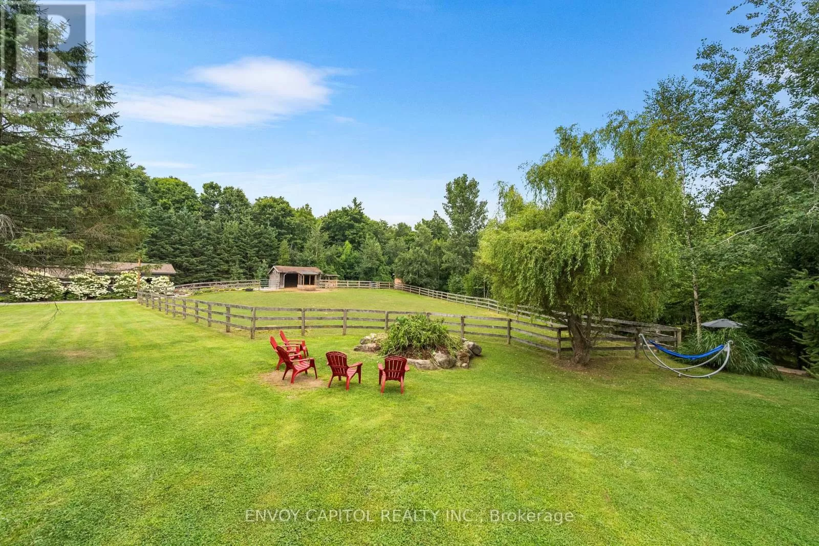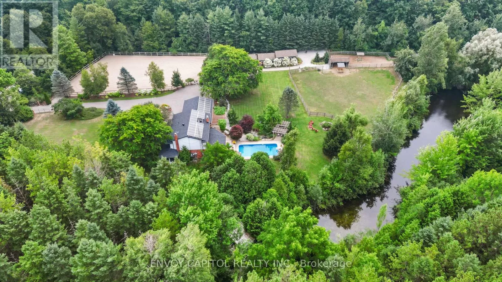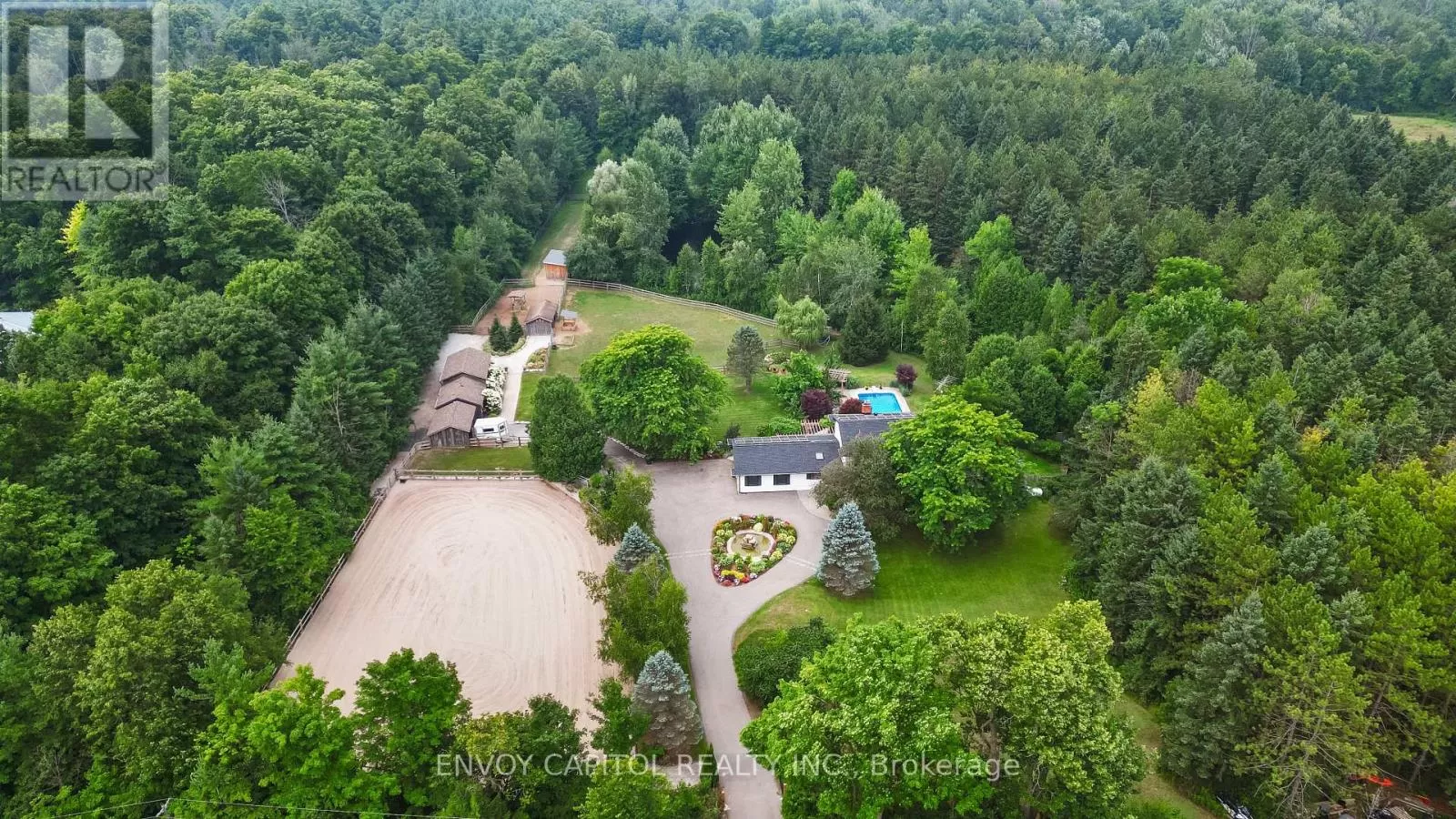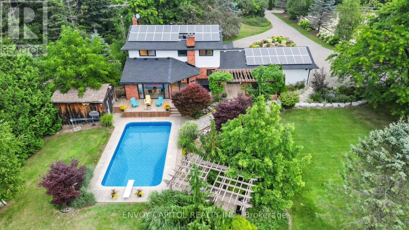 Cross Streets: Guelph Line/20th Sideroad. ** Directions: located between 15th and 20th sdrds. Bring your horses home! With 10 acres of professionally landscaped grounds, you and your horses will surely be spoiled here. No stone was left unturned when it came to updating this horse lovers paradise. Destinations abound around the property. From riding in your recently refreshed sand ring to relaxing by the pool on hot summer days, the option is yours. In the evening, strolling through the magical winding trails will lead you to the open air intimate fire pit. Following the trails further around the unspoiled natural pond, you'll reach another destination where you can cross over the beach and relax on your dock enjoying the serenity of the pond in Muskoka chairs. While dining alfresco under one of the 2 pergolas, sitting beside a babbling water feature stream or cozying up to a crackling wood chiminea will be the only decision you need to make. Inside the home you'll find an entertainer's delight. When it's time to fire up in the chef inspired eat-in kitchen, the Dacor cooktop makes the experience that much more enjoyable. Off the kitchen a dedicated dining area allows for a quiet space to enjoy your creation with family and friends. After which, head over to the family and living spaces where you can challenge your company on the included billiards table or easily convert to table tennis. Now to relax in front of your included large screen TV built into a gorgeous stone accent wall. The second storey sees a large primary retreat complete with an updated ensuite along with 3 more generously sized bedrooms and a conveniently updated 5-piece bathroom. Other updates not to be missed include a new pool liner (25), new roof decking and shingles (24), new attic insulation (24), new eavestrough/soffit and painting existing siding (23), new owned propane furnace (22), new windows/sliding doors (21). This feature-packed property also includes a microFIT (solar panels) generating approximately $6k to $8K of annual income (until 2030) and a direct to panel generator. (id:27476)