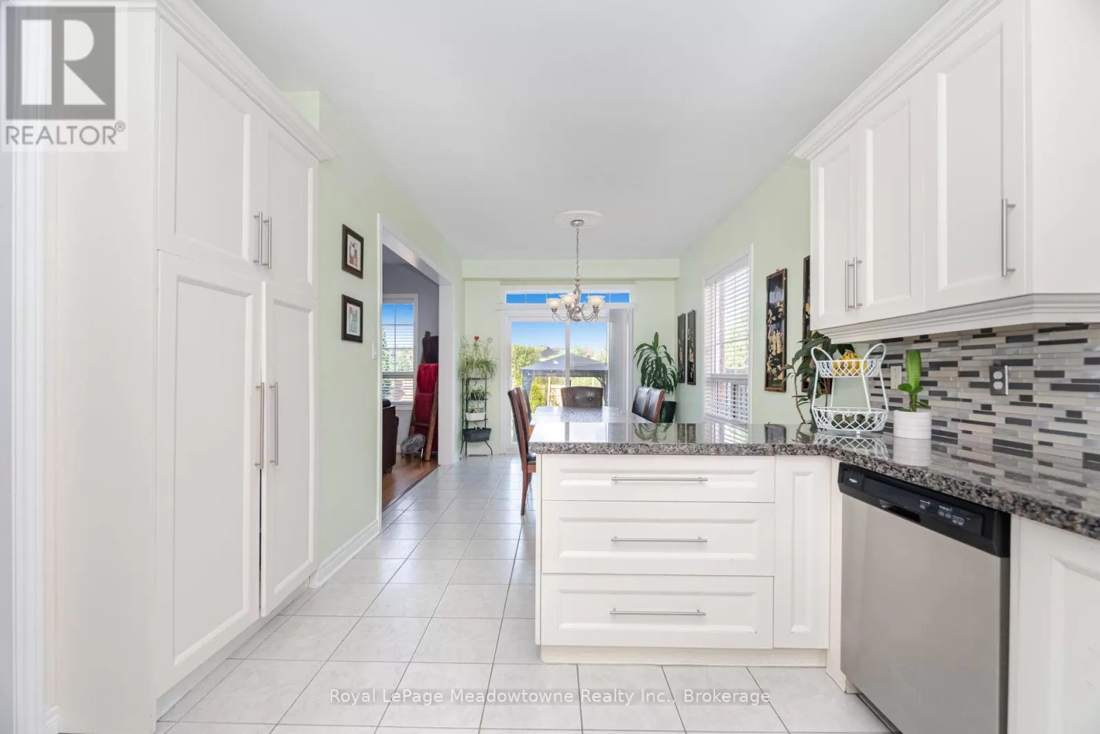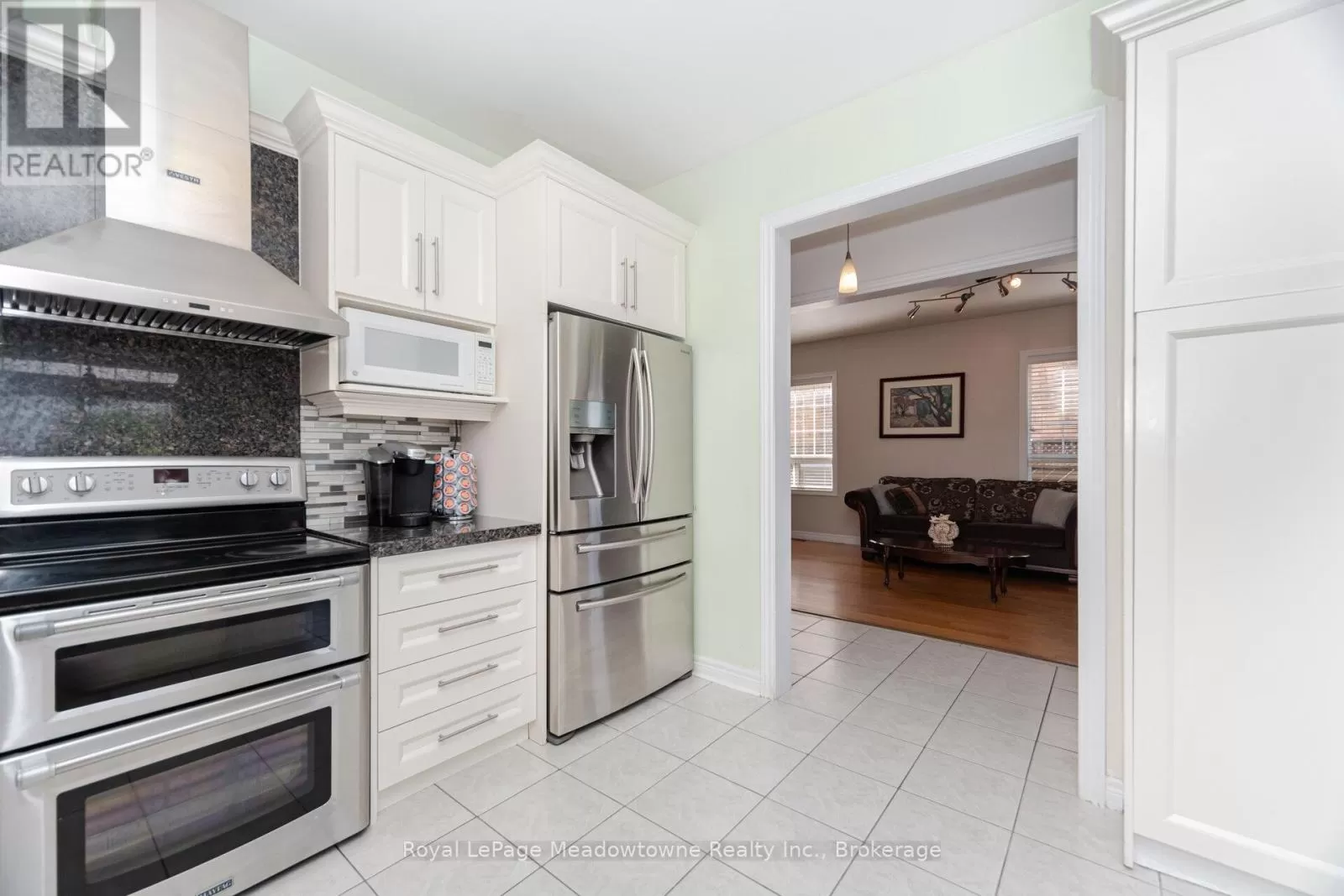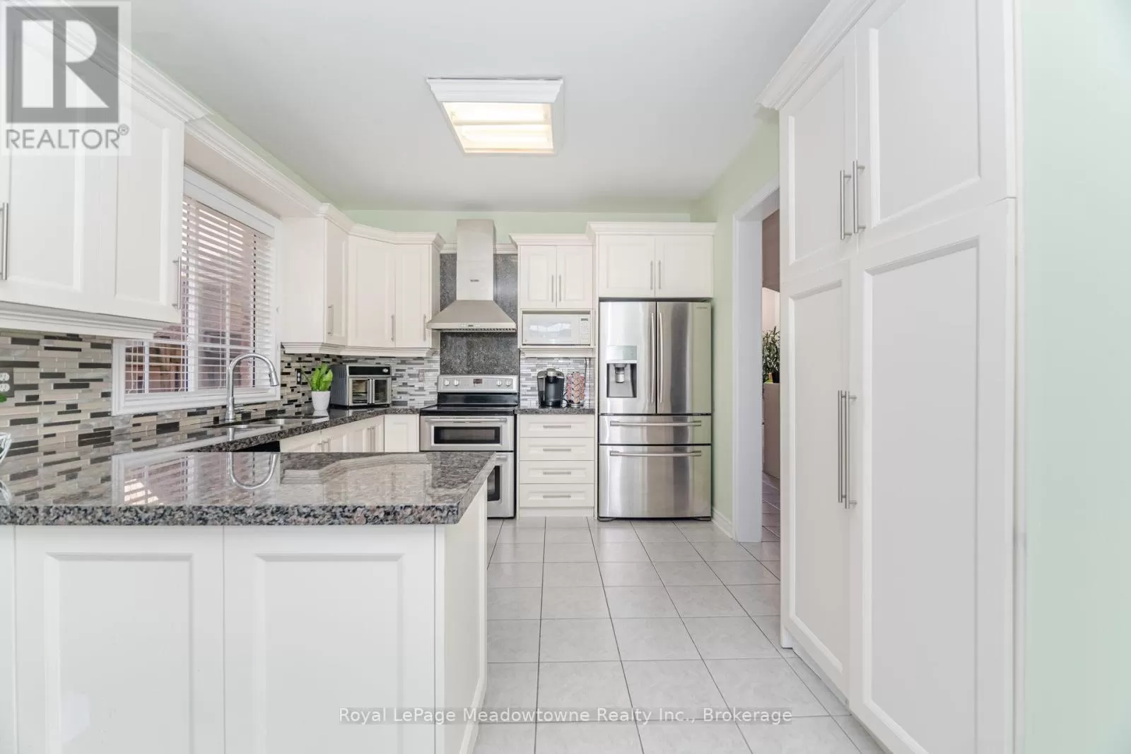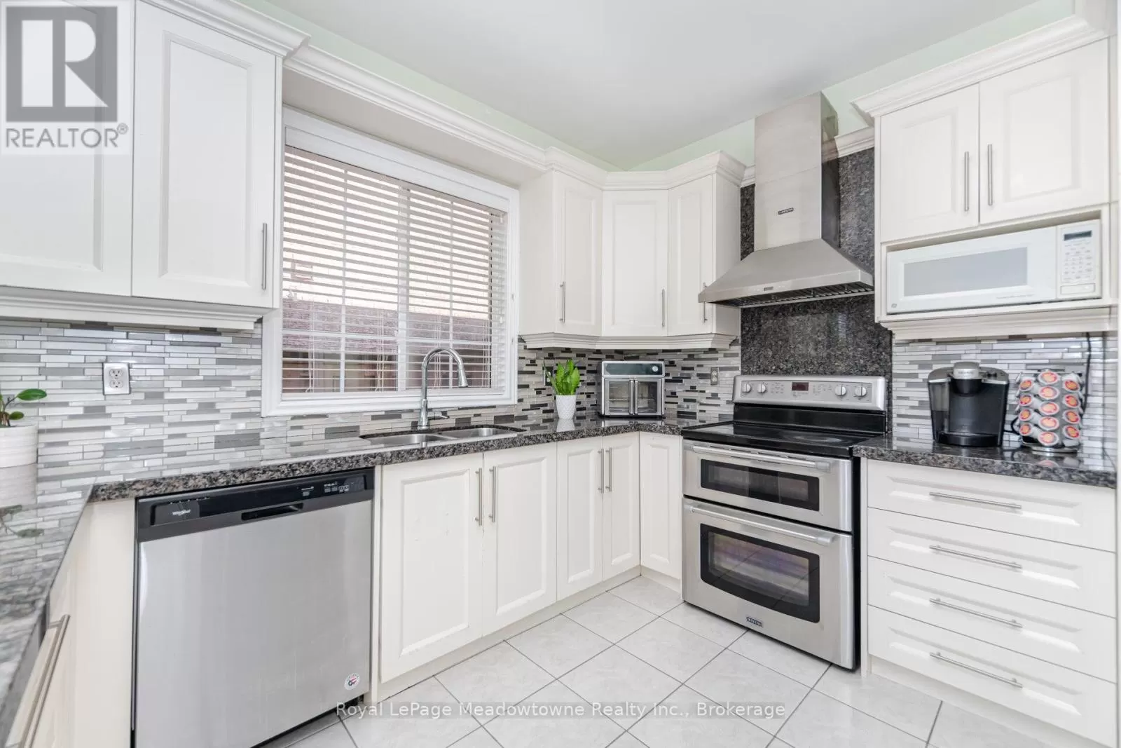 Cross Streets: Thompson and Main. ** Directions: Thompson/Sprucedale/Manley. Welcome to this stunning 4+2 bed, 4+1 bath detached home with a double car garage, located in highly desirable Dempsey neighbourhood. Backing onto a peaceful ravine, this Greenpark-built Westgate 6 model offers 2,640 sq ft plus finished basement, combining space, style, and privacy. Step into a bright and welcoming foyer with tiled flooring & generous coat closet. The open-concept living & dining rooms feature elegant hardwood floors and are flooded with natural light perfect for hosting or relaxing.The updated eat-in kitchen is the heart of the home, boasting crisp white cabinetry, dark granite countertops, stylish tile backsplash, & s/s appls including a new range hood. The spacious breakfast area offers a w/o to the backyard & overlooks the cozy family room, which features a gas fireplace, hardwood flooring & large picture windows showcasing views of the ravine.Upstairs, you'll find 4 generous bedrooms & 3 full bathrooms. The primary suite, located at the rear for maximum privacy, includes a w/I closet and 4-c ensuite with soaker tub, large vanity & separate shower. Bedrooms 2 & 3 share a convenient Jack & Jill bathroom, while bedroom 4 enjoys its own private ensuite & double closet.The finished basement offers incredible versatility use the space as additional bedrooms, a home office, gym, playroom or rec room. A 4-piece bathroom and laundry room are also located on this level.Enjoy your own private backyard oasis, fully fenced with mature gardens, greenery, & multiple seating areas, including a flagstone patio & stone patio ideal for dining or lounging. Ideally located close to all major amenities grocery stores, restaurants, theatres, shops & public transit and within walking distance to schools, parks, library, & arts centre. Easy access to Highway 401 & 407 makes commuting simple & convenient. Dont miss this rare opportunity to own a ravine-lot home in one of Miltons most sought-after communities. (id:27476)