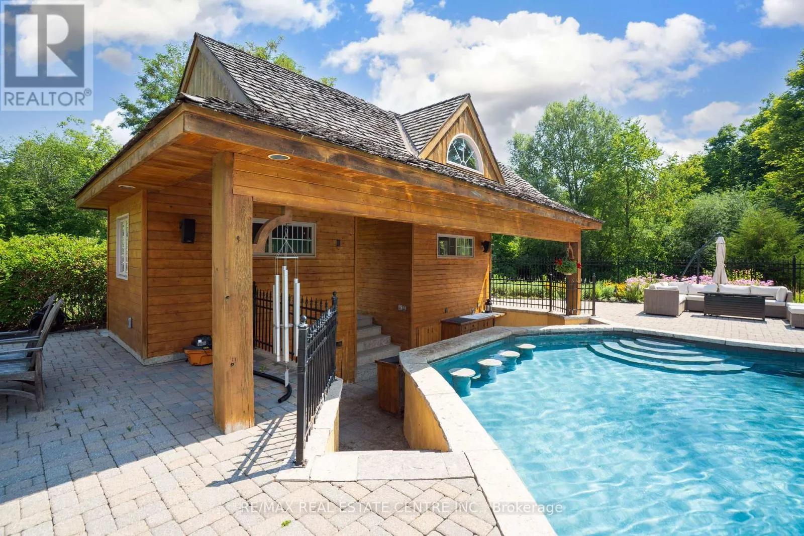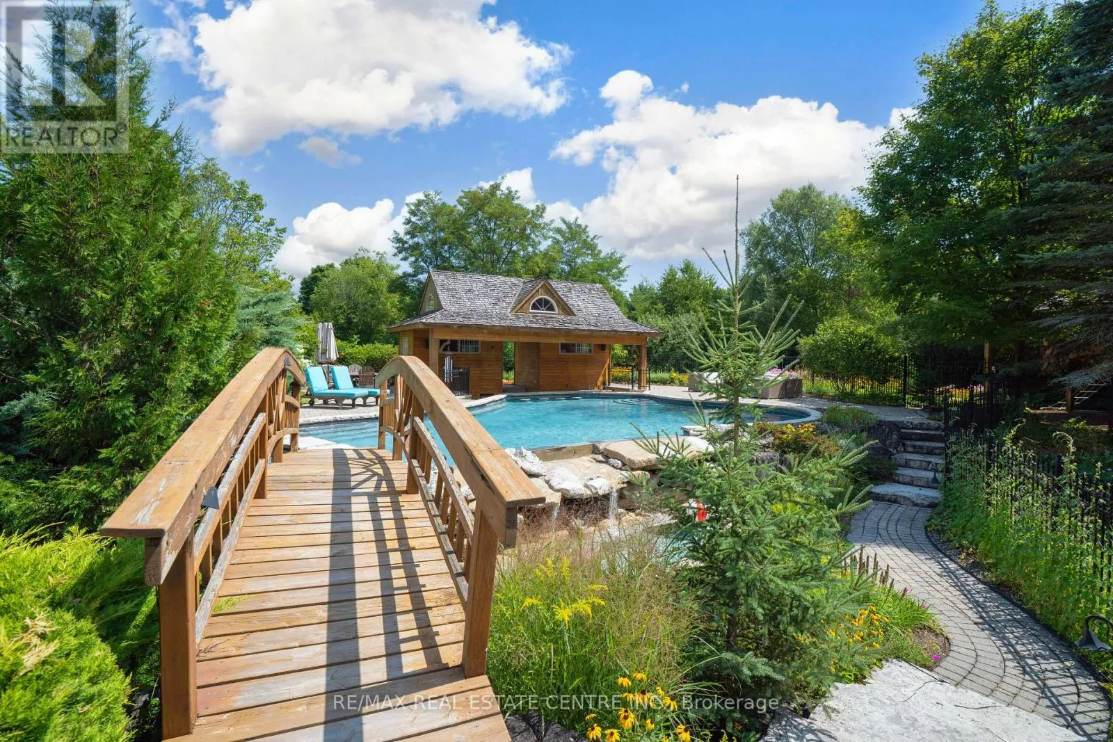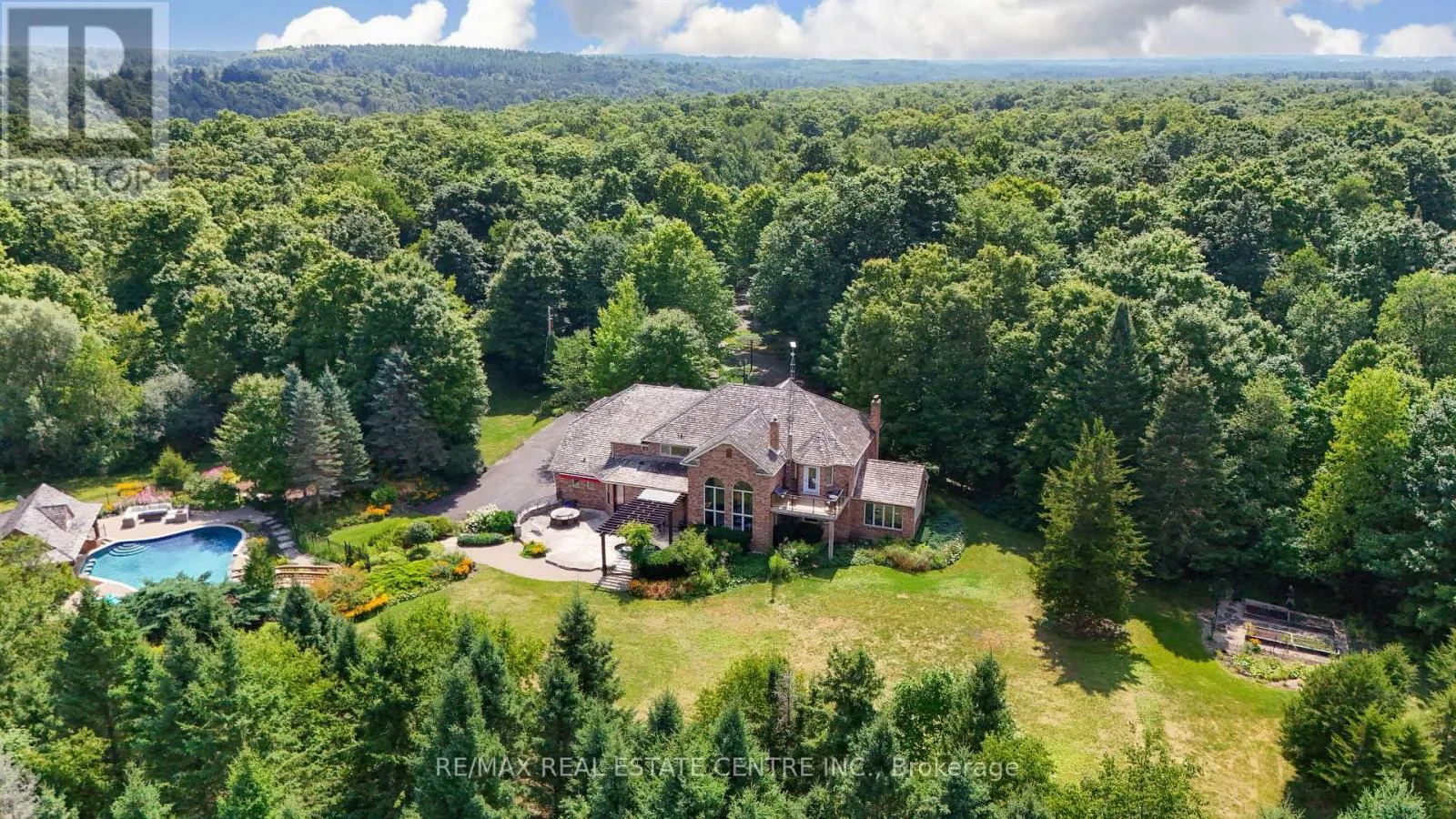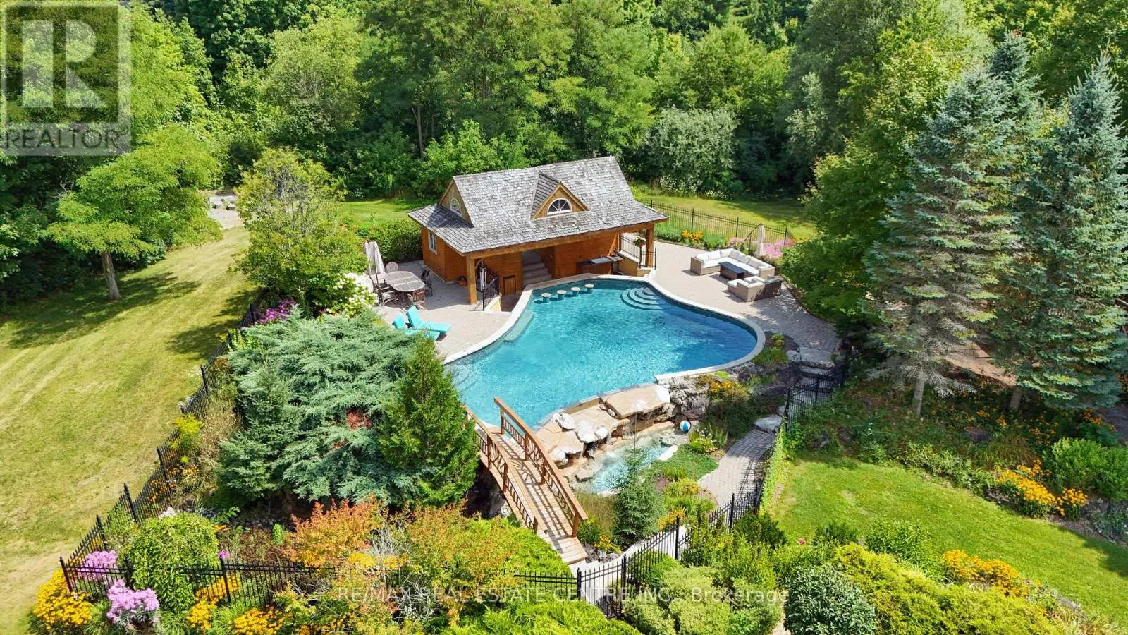 Cross Streets: 4th Line/30 Side Rd. ** Directions: Google maps. A Signature Estate in Nassagaweya. Set at the end of a long, tree-lined drive, this remarkable custom-built 4-bedroom, 7-bathroom residence delivers over 6,100 sq. ft. above grade plus approx 2,000 sq. ft. finished walk-out lower level. The grand two-storey foyer leads to a striking great room with floor-to-ceiling stone fireplace, a light-filled conservatory, private office, and a sunken living room. The chefs kitchen showcases premium appliances, live-edge granite surfaces, an oversized island, and a sunny breakfast nook, while the formal dining room offers a two-sided stone fireplace and custom cabinetry. A billiards lounge with lava rock bar, waffle ceiling, and bespoke built-ins adds to the main floors appeal. Upstairs, the primary suite features a spa-like ensuite and a custom walk-in closet, while three additional bedrooms each have their own designer baths. A secondary staircase provides direct access to the kitchen and laundry. The lower level is fully finished with a large recreation area, games room, and 2-piece bath. Outdoors, the resort-style grounds feature a lagoon-inspired saltwater pool with waterfall, wading area, swim-up bar, and custom hot tub. A cedar pool house with 2- piece bath, sunken outdoor kitchen, and stone patio BBQ space make entertaining effortless. The property also includes two fire pits, a playhouse, horseshoe pit, vast lawn areas, a detached garage with heated workshop, and parking for 50+ vehicles. All within minutes of Rockwood, and an easy commute to Guelph, Milton, the GTA, and Pearson Airport. A home that delivers unmatched luxury, privacy, and lifestyle. (id:27476)