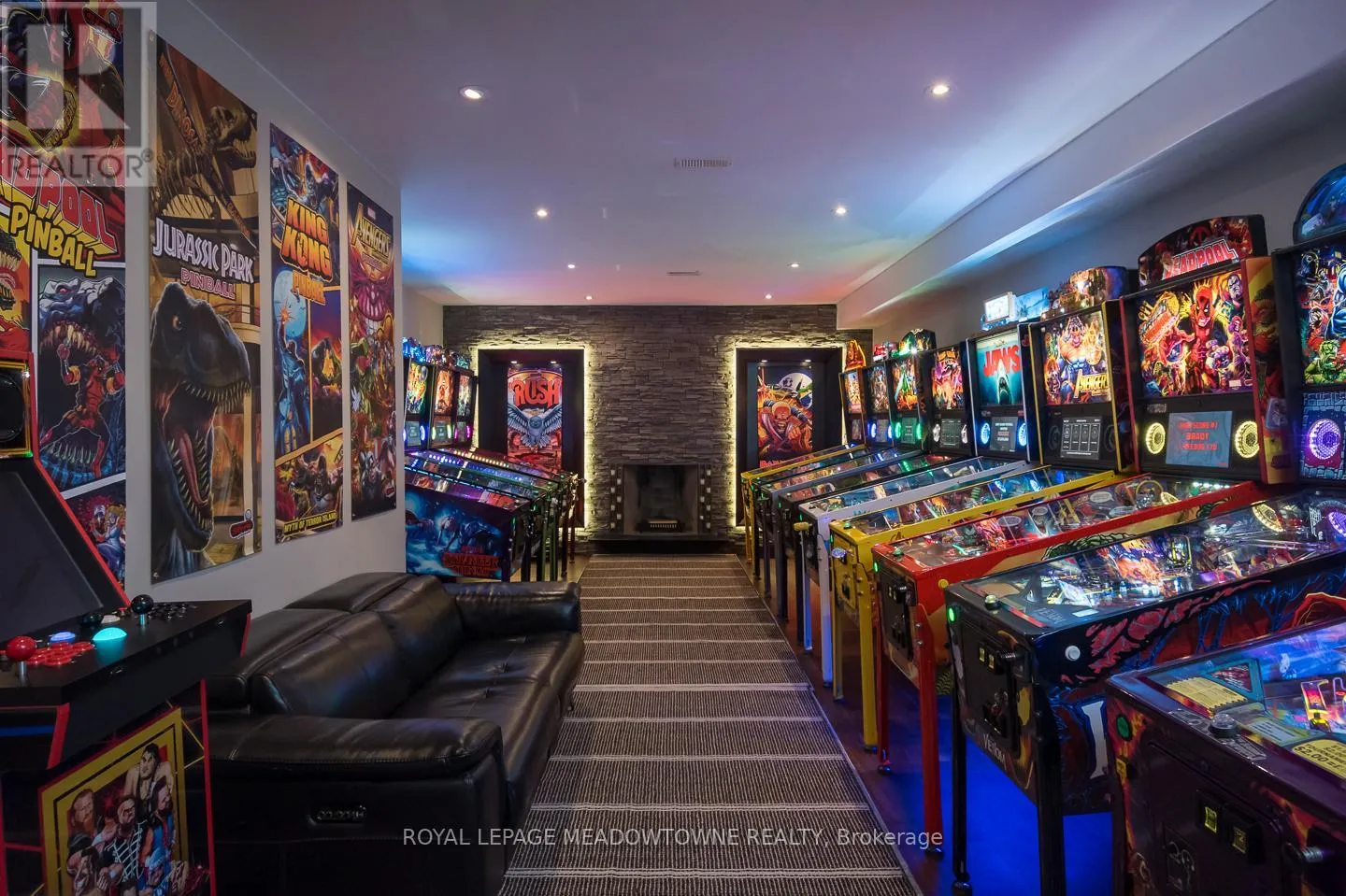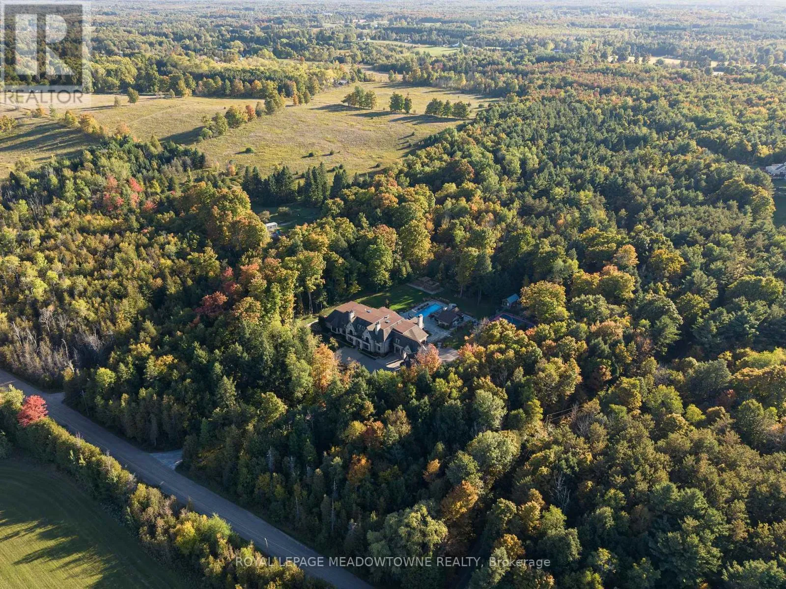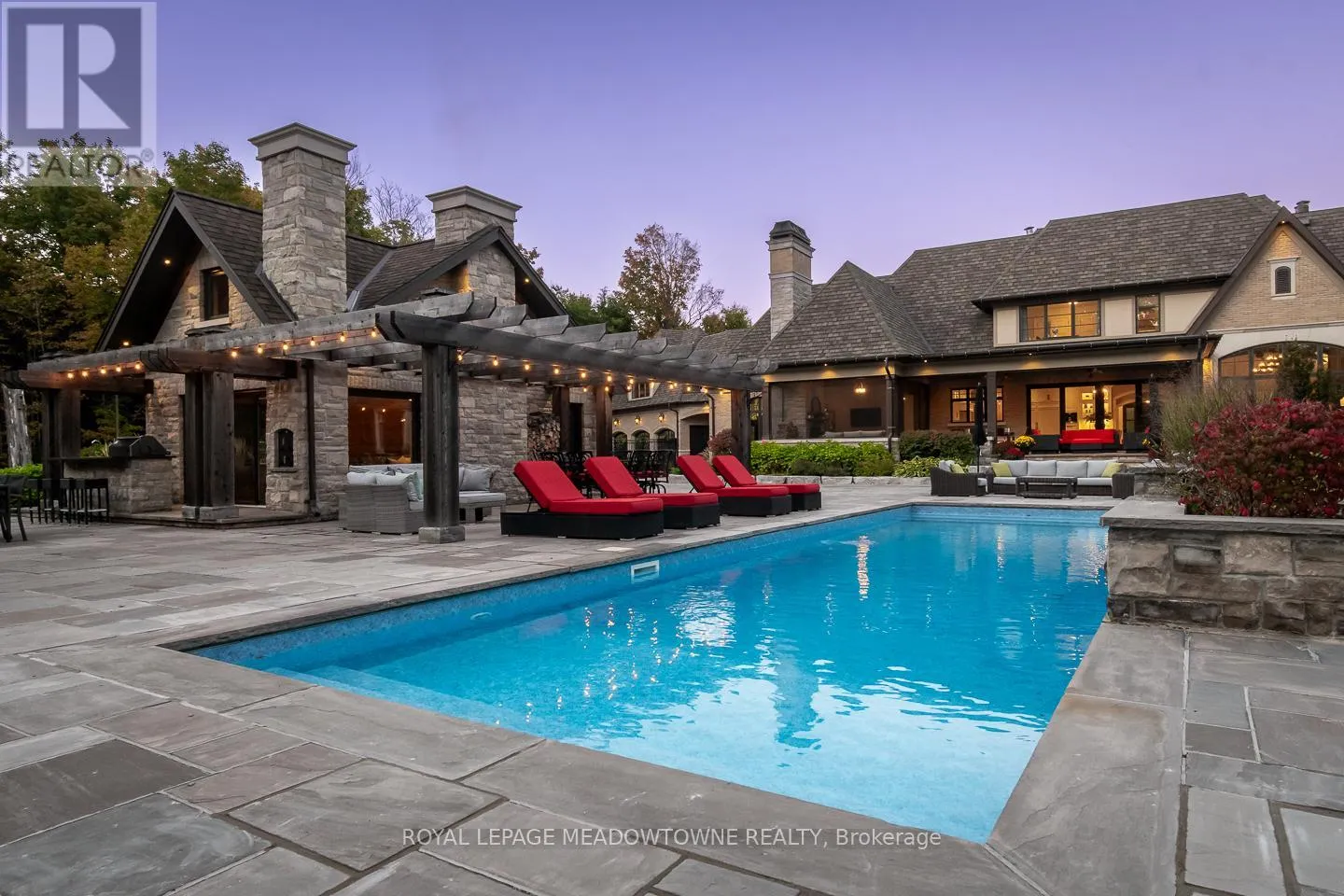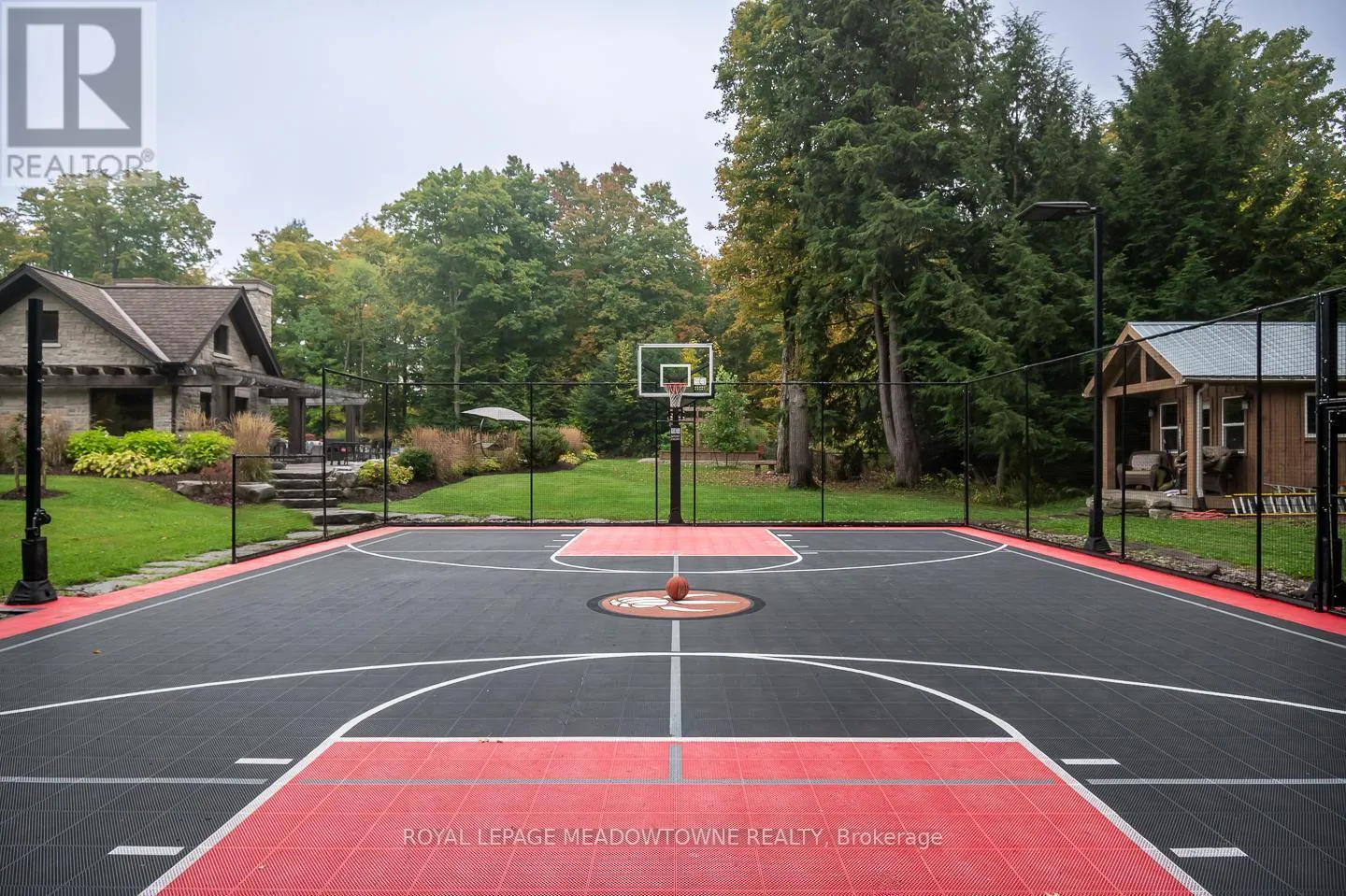 Cross Streets: 25 Side Road/Nassagaweya Esquesing Townline. ** Directions: Hwy 25 - 25 Side Rd - Nassagaweya Esquesing Townline. A forested 5-acre sanctuary where architectural brilliance meets resort-style living. This estate is a masterclass in design, indulgence, and lifestyle. With over 16,000 sq ft of finished space, it offers a rare blend of grandeur and warmth. The main floor primary wing is a retreat unto itself, featuring dual dressing rooms, library, spa-inspired ensuite, sauna, and walkout to a private deck with hot tub. Formal living and dining rooms, a vaulted family room, and chef's kitchen with butler's servery anchor the home's heart. Entertainment spaces include a bowling alley, golf simulator, cinema, arcade, spa room, bar and billiards lounge all connected by elevator across three levels. A separate nanny/in-law suite via breezeway offers seamless multi-generational living. Outdoors, discover a saltwater pool, pavilion, casita, pool house, pizza oven, fire pit, vegetable garden, and Raptors-inspired basketball court. Geothermal heating, smart home integration, and lush landscaping elevate every moment. This is more than a home, it's a legacy property, a lifestyle statement, and a rare opportunity to live expansively, with privacy, prestige, and purpose. (id:27476)