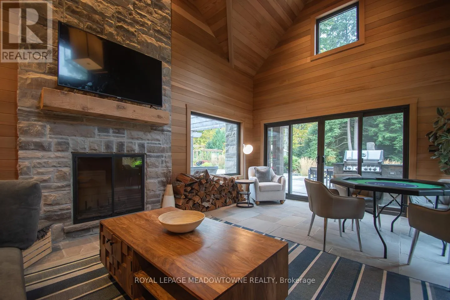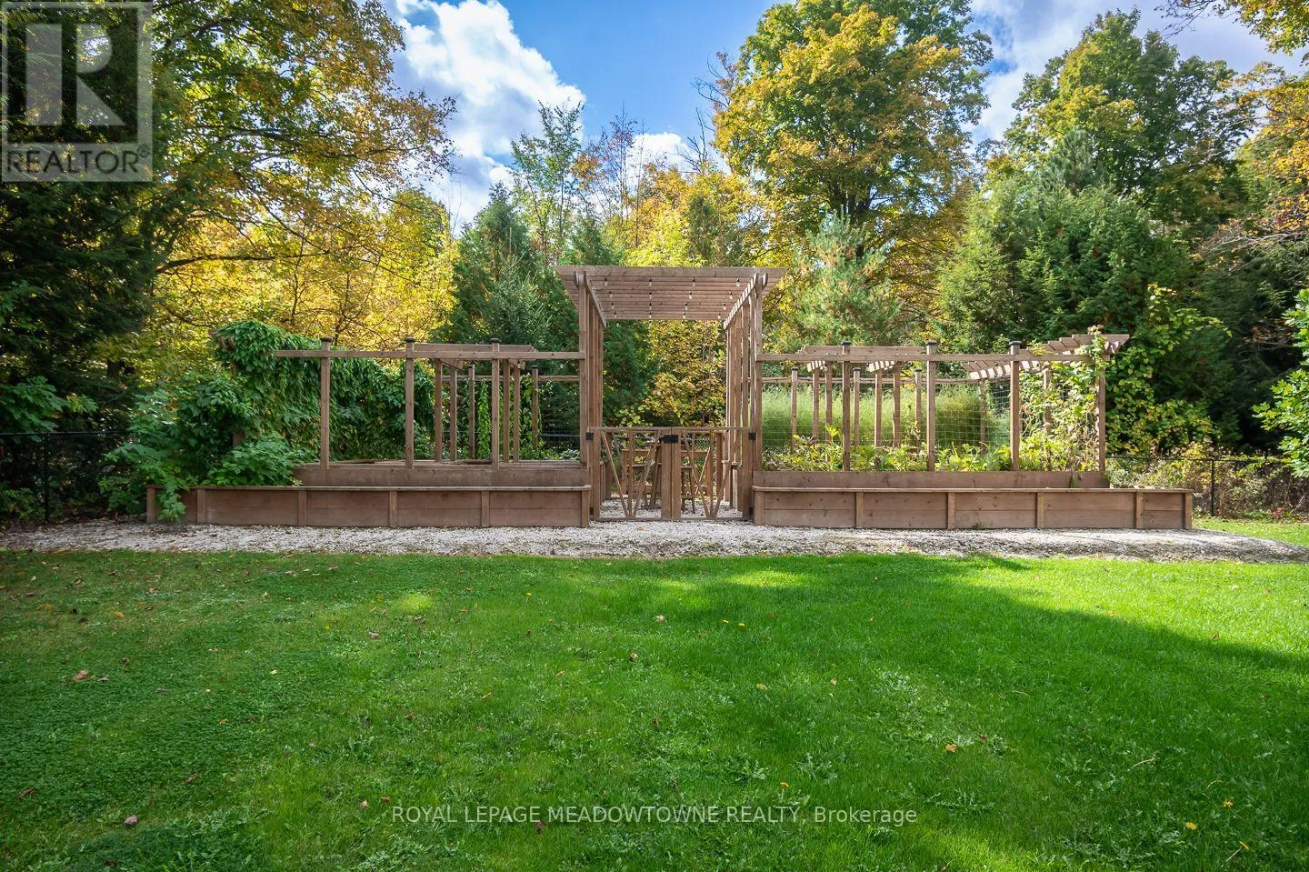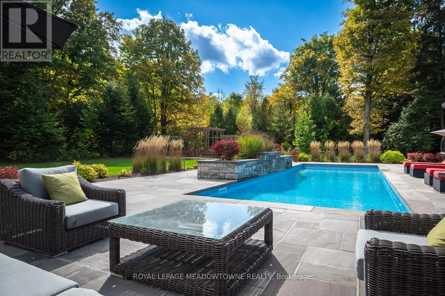 Cross Streets: 25 Side Road/Nassagaweya Esquesing Townline. ** Directions: Hwy 25 - 25 Side Rd - Nassagaweya Esquesing Townline. A forested 5-acre sanctuary where architectural brilliance meets resort-style living. This estate is a masterclass in design, indulgence, and lifestyle. With over 16,000 sq ft of finished space, it offers a rare blend of grandeur and warmth. The main floor primary wing is a retreat unto itself, featuring dual dressing rooms, library, spa-inspired ensuite, sauna, and walkout to a private deck with hot tub. Formal living and dining rooms, a vaulted family room, and chef's kitchen with butler's servery anchor the home's heart. Entertainment spaces include a bowling alley, golf simulator, cinema, arcade, spa room, bar and billiards lounge all connected by elevator across three levels. A separate nanny/in-law suite via breezeway offers seamless multi-generational living. Outdoors, discover a saltwater pool, pavilion, casita, pool house, pizza oven, fire pit, vegetable garden, and Raptors-inspired basketball court. Geothermal heating, smart home integration, and lush landscaping elevate every moment. This is more than a home, it's a legacy property, a lifestyle statement, and a rare opportunity to live expansively, with privacy, prestige, and purpose. (id:27476)