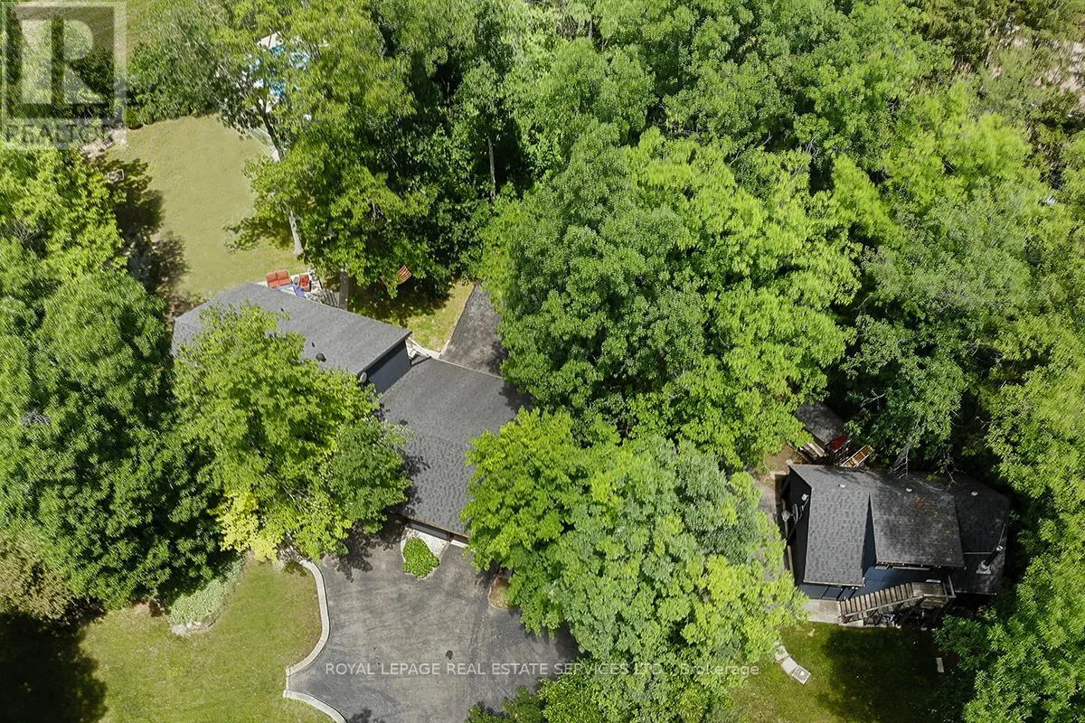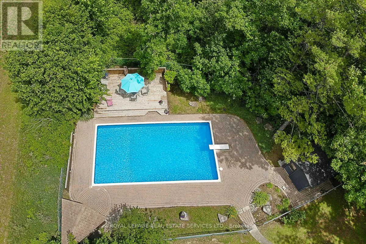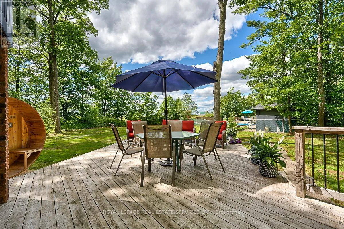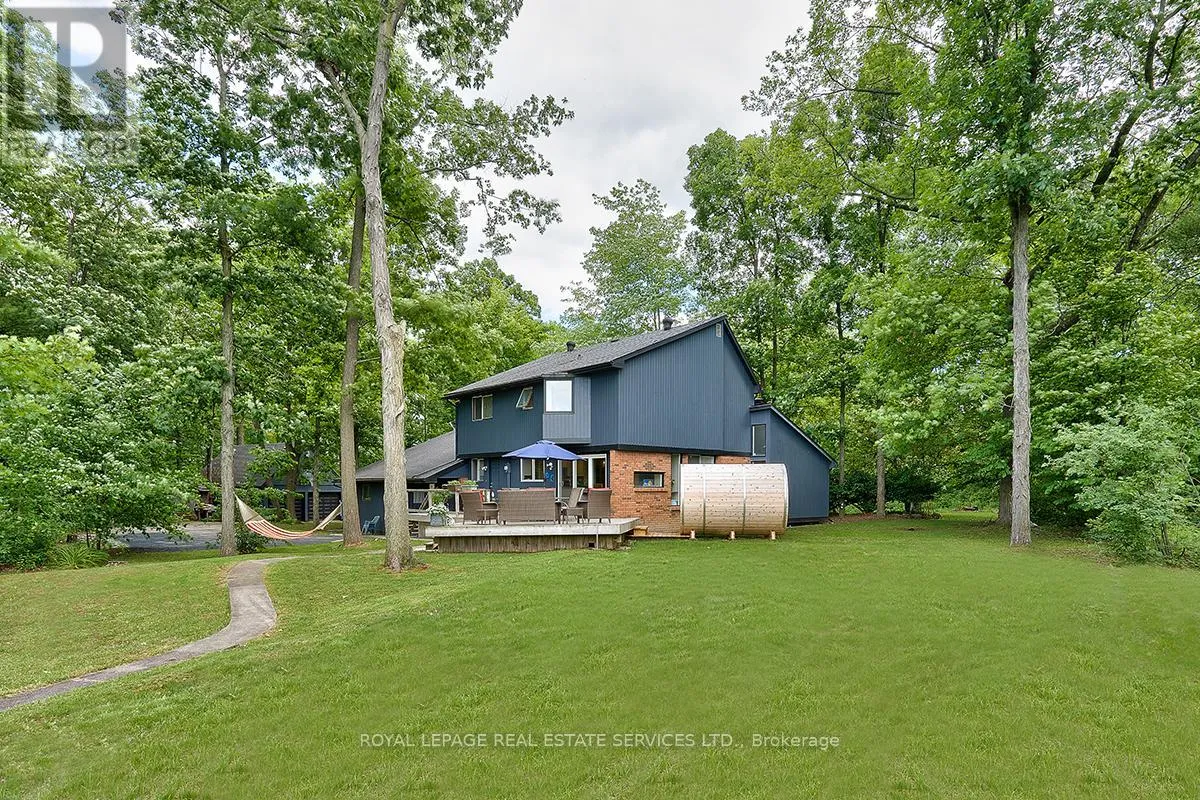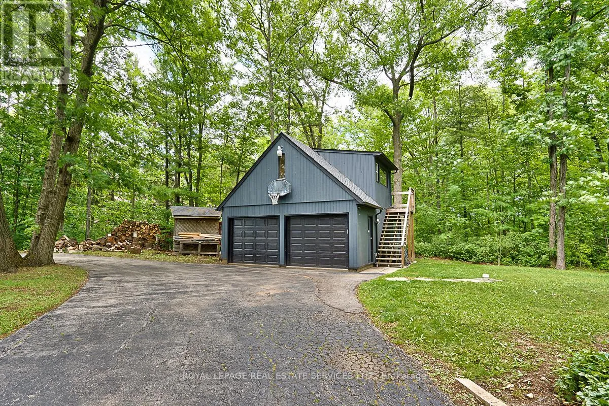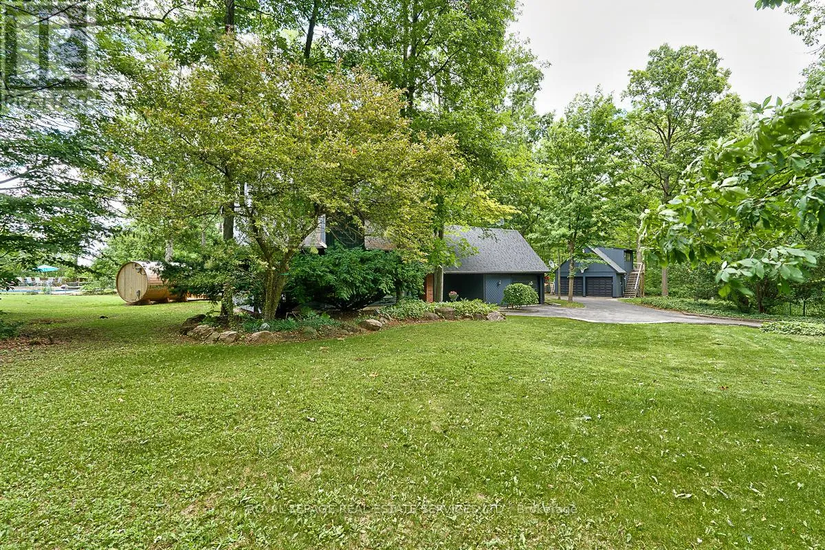 Cross Streets: Tremaine Road and No. 1 Side Road. ** Directions: Tremaine Road (north of the #407) to No. 1 Side Road. ESCAPE TO YOUR OWN PRIVATE OASIS ON ALMOST FOUR ACRES IN MILTON! Surrounded by nature and mature trees, this rare symmetrical property offers the perfect blend of privacy and convenience. Designed for family fun and entertaining, the backyard is a true playground - featuring an expansive deck, 18' inground pool with an interlock surround, sun deck, pool house, hammock, and even a cedar barrel-style outdoor sauna for year-round relaxation. Inside, the main level offers a sunken living room centered around a rustic stone woodburning fireplace, formal dining room, powder room, laundry room, and a beautifully updated kitchen with a coffered ceiling, breakfast bar, Corian counters, designer backsplash, stainless steel appliances, and bright breakfast area with walkout to the deck. Upstairs, the spacious primary bedroom offers hardwood flooring, skylight, and a spa-inspired four-piece ensuite with freestanding tub. Two additional bedrooms and a four-piece main bath complete this level. The finished basement is made for family time and features oversized windows, Berber broadloom, family room with woodburning fireplace, games room with bar, office nook, workshop, and plenty of storage. Highlights include open-riser staircases with wrought iron pickets, energy-efficient geothermal heating and cooling, 200-amp service, municipal water, updated shingles (2015), low annual taxes ($3,861), single garage, carport, and a detached two-car garage with loft fitness room. Plus, the upper level can be expanded to add approximately 2,000 square feet of living space as your family grows! All the joys of cottage living with the ease of city life - just 3 minutes to Hwy 407, 10 minutes to the QEW, and 5 minutes to shopping. Enjoy the tranquility of country living with the convenience of city amenities just minutes away! (id:27476)