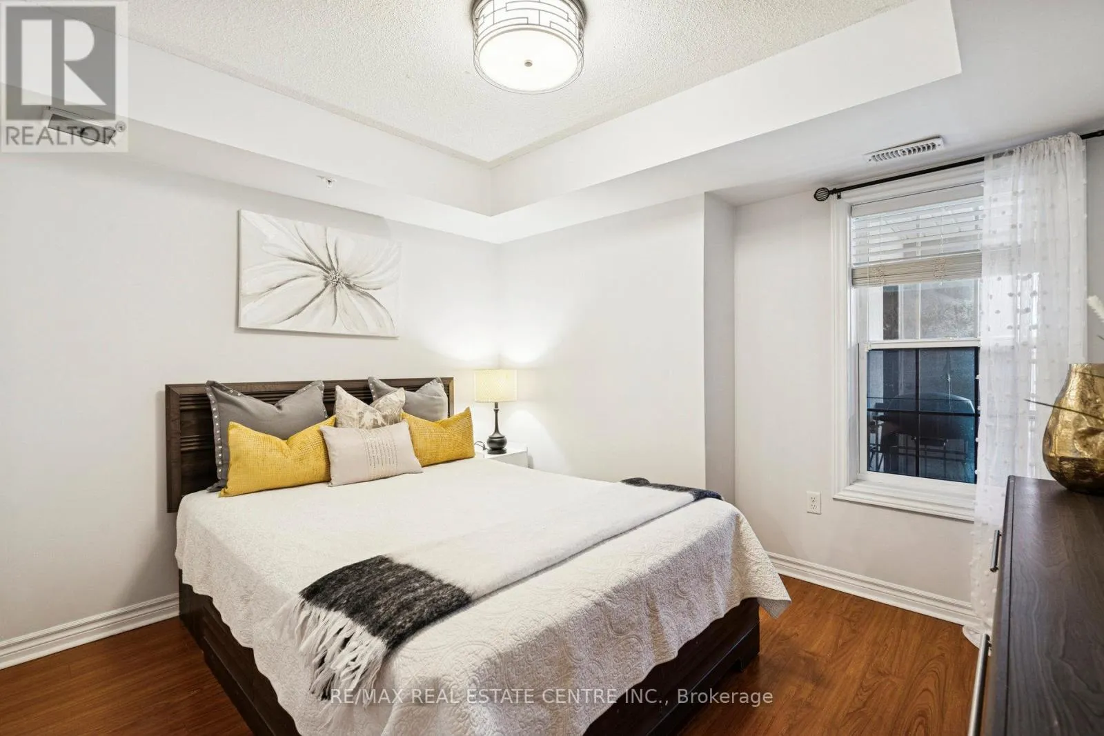 Cross Streets: Main & James Snow. ** Directions: Main St to Sinclair. Welcome to Bristol on Main - where comfort meets convenience. This beautiful top-floor one-bedroom plus den condo feels open and airy with its cathedral ceilings and no-carpet, easy-care laminate floors. The kitchen is bright and practical, with stainless steel appliances, a breakfast bar, and plenty of space for cooking and storage. The living and dining area flows nicely to a large balcony - perfect for a quiet morning coffee. You'll love having a large primary bedroom, a separate den that's ideal for a home office/baby room, and your own in-suite laundry. There's also a storage locker for your extras. Located on the quiet side of the building, close to the elevator, this home is in an excellent school district and offers quick access to the 401, GO Station, Art Centre, Community Recreation, Library, Cineplex, Grocery stores and nearby shops. A perfect spot for anyone looking for peace, practicality, and a great location - all in one. (id:27476)