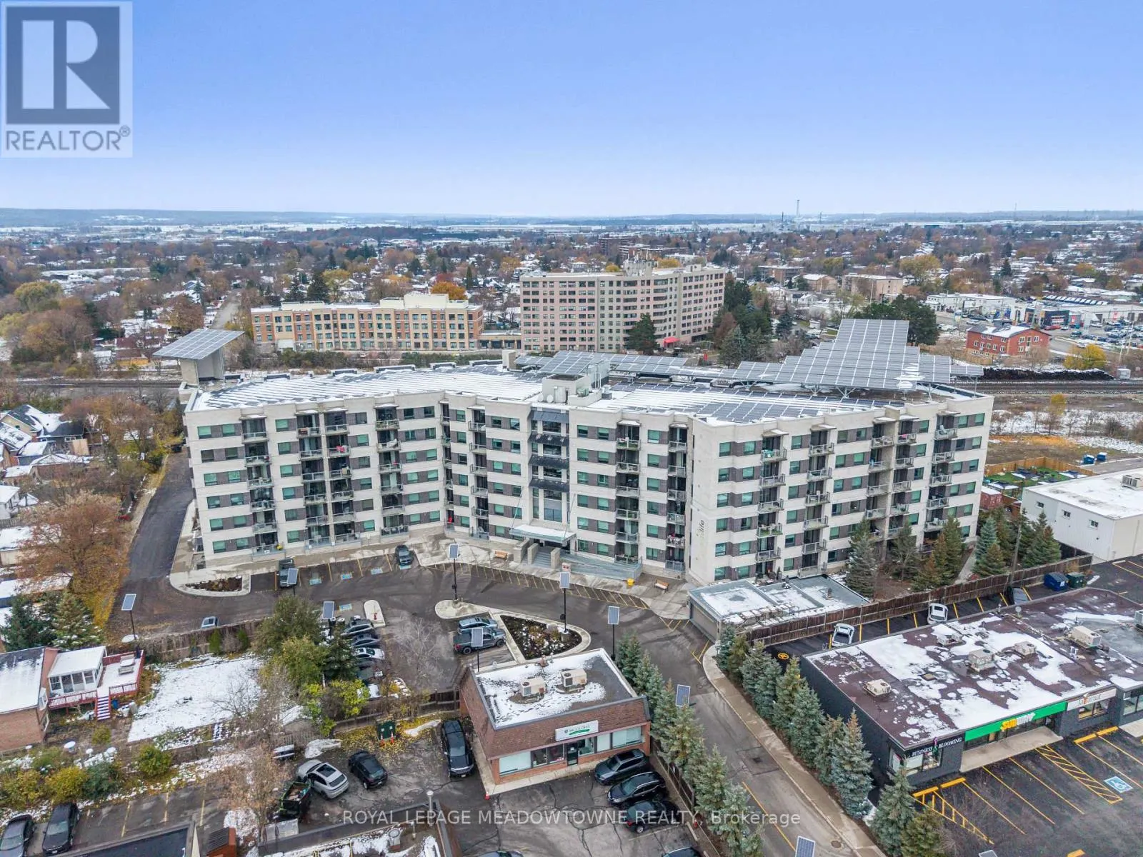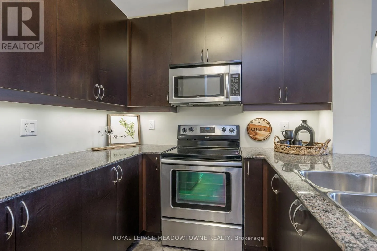 Cross Streets: Ontario & Main. ** Directions: Ontario St & Main St E. Welcome to GreenLife Downtown Milton! This impressive 2-bedroom, 2-bathroom condo offers 1,005 sq. ft. of comfortable living space in one of Milton's most desirable locations. Enjoy the benefits of a geothermal heating and cooling system, helping to keep utility costs low year-round. An open entryway welcomes you into the unit, featuring a large front closet and additional storage in the laundry/mechanical room. The kitchen is designed for both style and function, offering a large breakfast bar peninsula with pendant lighting and seating for four, stainless steel appliances, granite countertops, and plenty of cabinet space. The open-concept living and dining area is finished with laminate flooring and provides a walk-out to the south-facing balcony, where you can take in views of downtown Milton's Main Street. The spacious primary bedroom features cozy broadloom flooring, two large closets, and a private 4-piece ensuite complete with an oversized granite topped vanity, under-mount sink, separate shower, and deep soaker jetted tub. The second bedroom is generous in size with broadloom flooring and a large closet. A second full 4-piece bathroom includes a modern vanity with granite countertop and a tub/shower combo. This unit also includes one underground parking space and a storage locker for your convenience. This great building offers excellent amenities such as a fitness centre, party room, games room, and plenty of visitor parking. Perfectly located just steps from transit, shops, restaurants, and all that downtown Milton has to offer - this is urban living at its finest. (id:27476)
