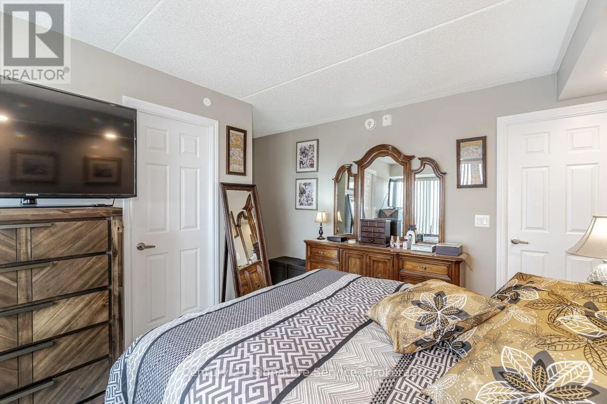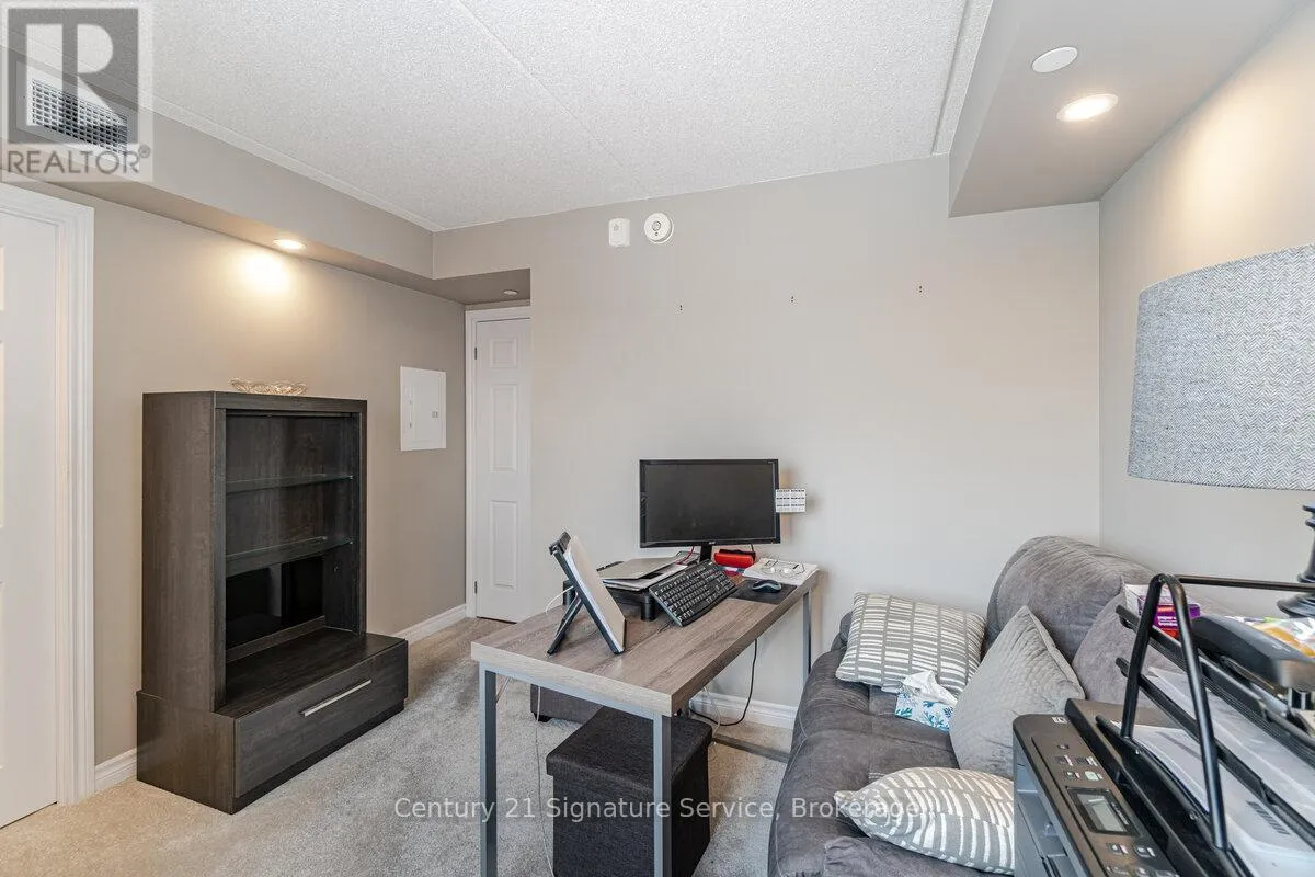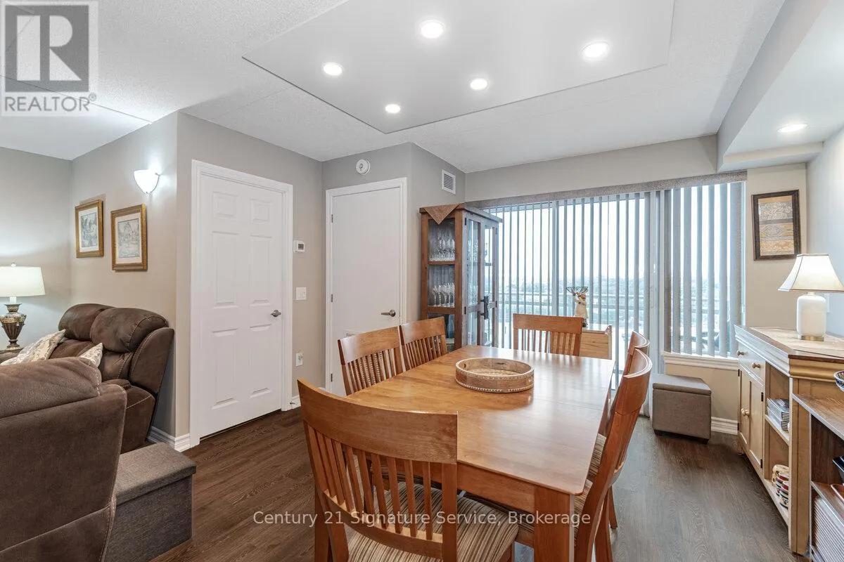 Main St / Thompson Rd this beautifully upgraded 2-bedroom + den, 2-bathroom corner unit offers 1,005 sq ft (+55 sq ft balcony) of sun-drenched space, with captivating northwest views of the Escarpment. Designed for both comfort and style, the open-concept layout features high-quality plank laminate flooring and cozy broadloom in the bedrooms. The modern kitchen is appointed with rich dark cabinetry, generous storage, and flows effortlessly into a bright living space?perfect for entertaining or relaxing. Step onto the spacious balcony to take in stunning sunsets and fresh air. The primary bedroom is a serene retreat, complete with a 4-piece ensuite and walk-in closet. Both bathrooms feature sleek tiles and tasteful finishes, with thoughtful upgrades throughout. Custom pot lights add warmth and charm. Enjoy premium building amenities, including a rooftop BBQ terrace, stylish party room, meeting space, guest suite, and ample visitor parking. Conveniently located with quick access to Hwy 401/407, just steps from Milton GO, and close to shopping, golf courses, Kelso, organic farms, and more. Includes one parking spot and one locker. (id:27476)
