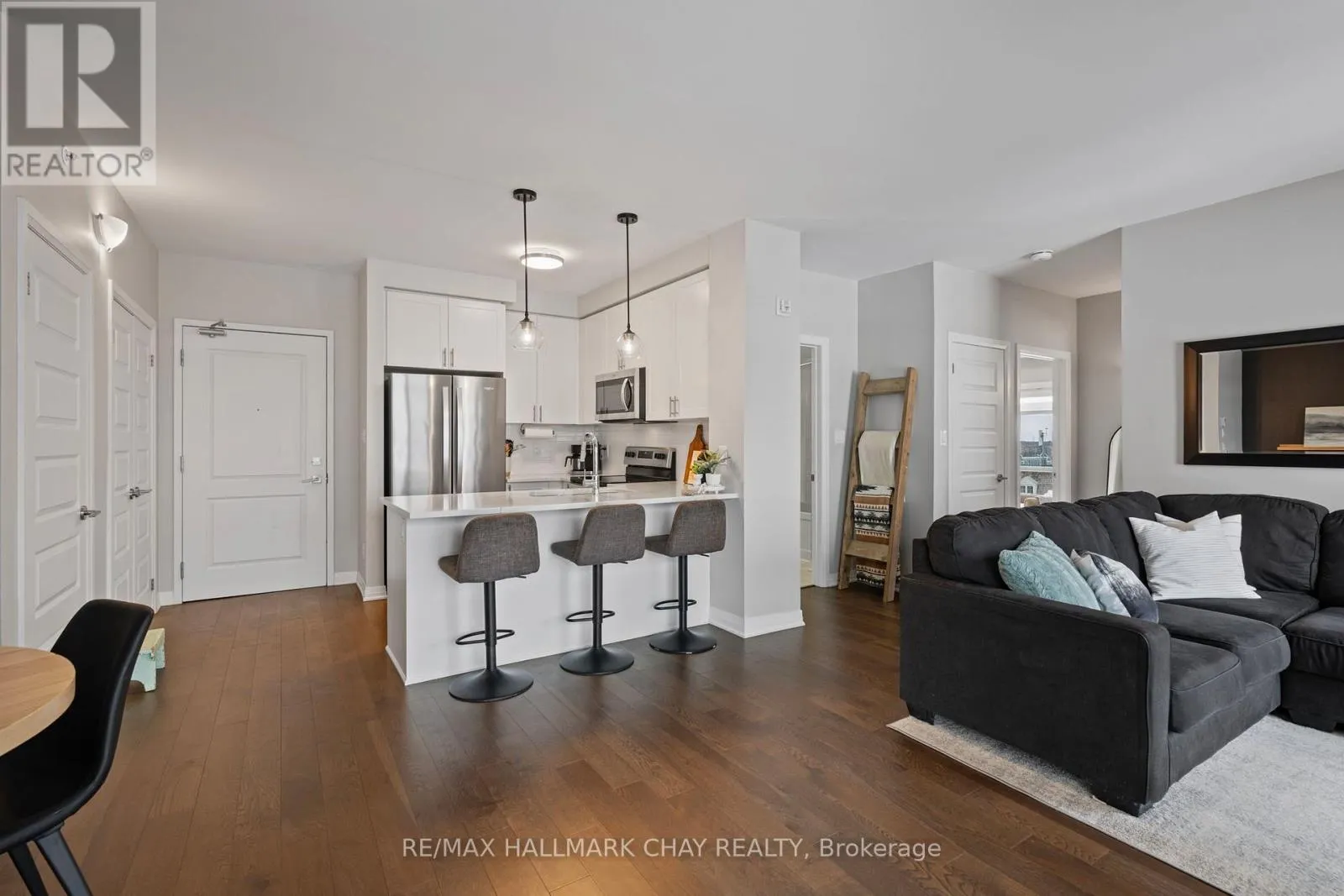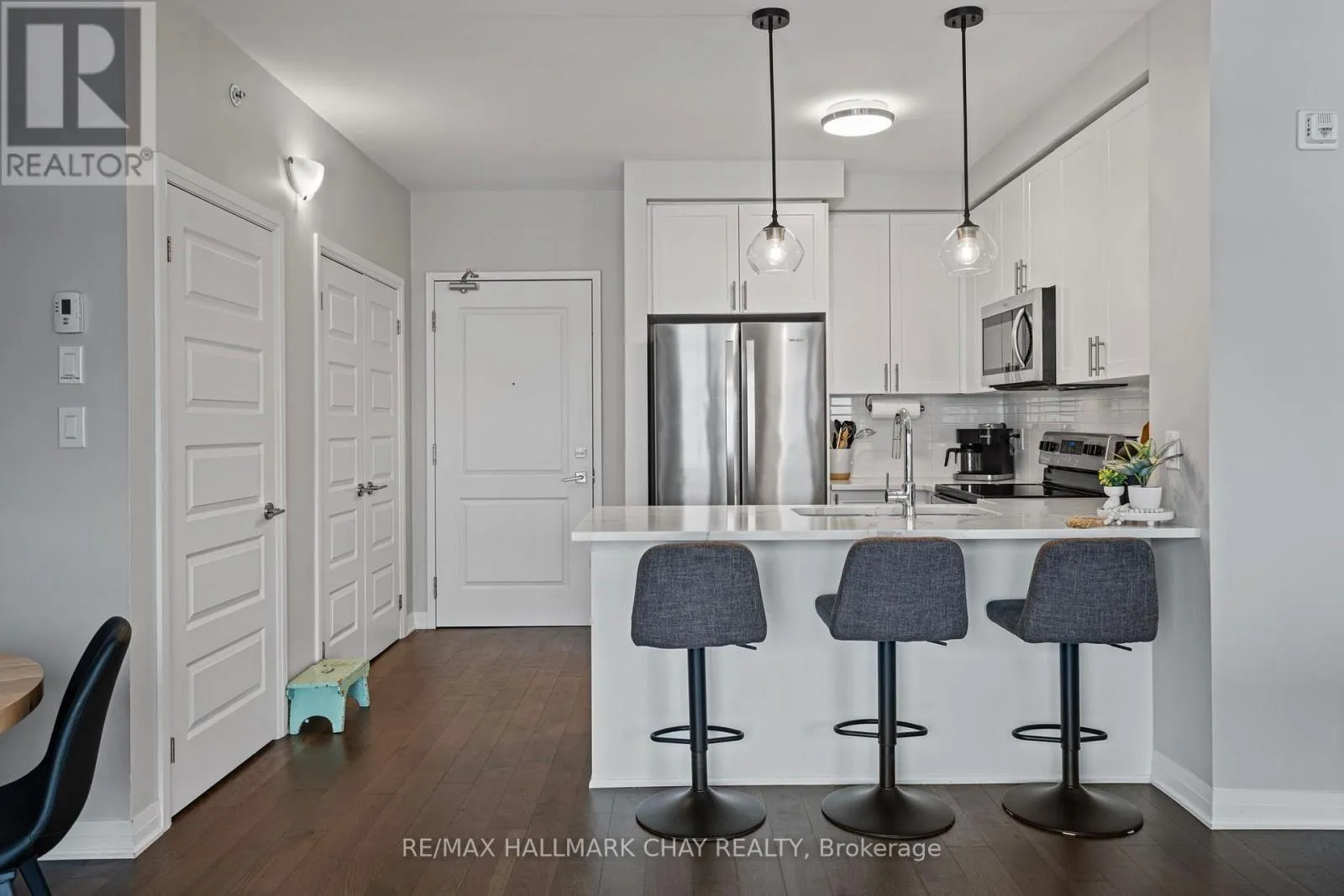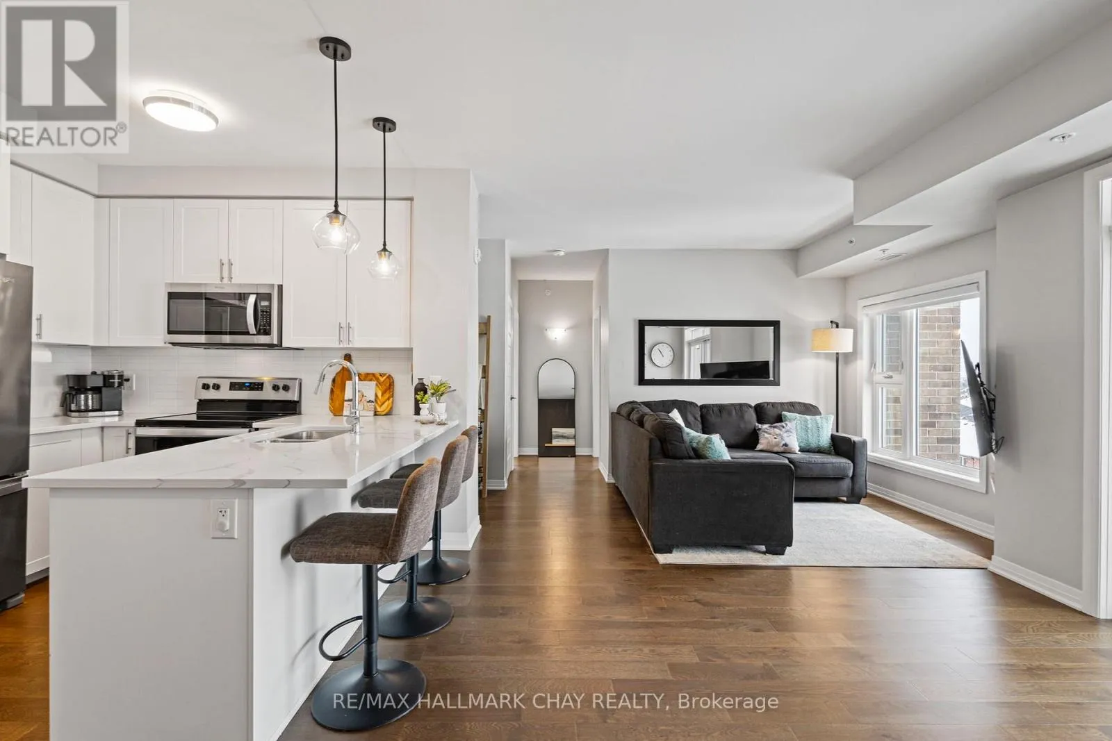 Cross Streets: Derry & Farmstead. ** Directions: Derry Road to Farmstead Dr. Welcome to this stunning corner penthouse unit in one of Milton's newest and most desirable buildings. Ideally located just steps from Milton District Hospital and within walking distance to restaurants, schools, and everyday amenities, this home offers exceptional convenience, privacy, and quiet living. The bright open-concept layout is filled with natural light from expansive windows, enhanced by the premium corner positioning with minimal neighbouring exposure and beautiful open views. The modern white kitchen features quartz countertops, sleek cabinetry, and stainless steel appliances, flowing seamlessly into the spacious living and dining areas. Step out onto your private balcony to enjoy elevated views and peaceful outdoor space. A rare oversized tandem underground parking space accommodating two vehicles adds tremendous value. Ideal for first-time buyers, down-sizers, or investors seeking comfort, style, and a prime location. Thousands spent on upgrades including hardwood floors, quartz counters, stainless steel appliances, and 2-car parking. Amenities include visitor parking, gym, car wash, dog park, and electric BBQs permitted. (id:27476)