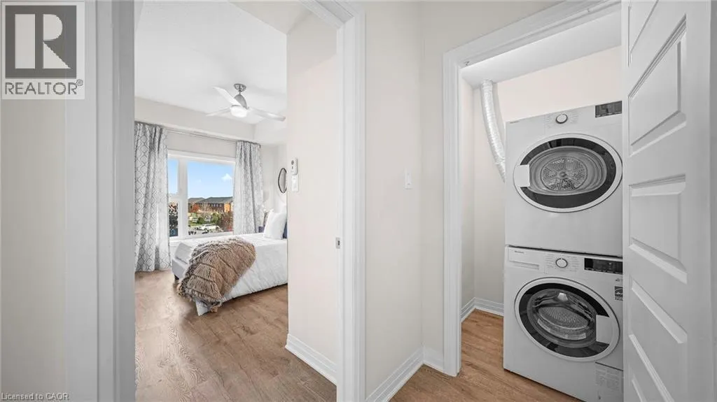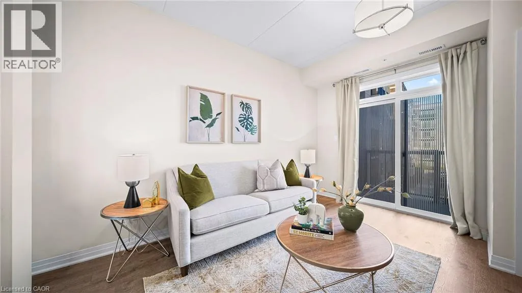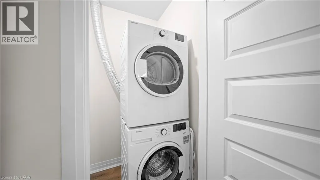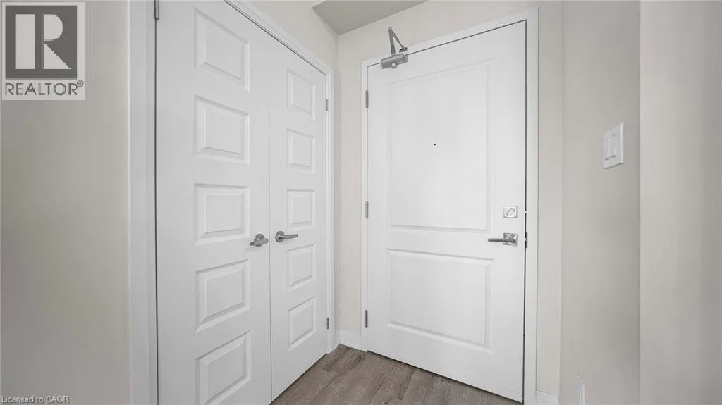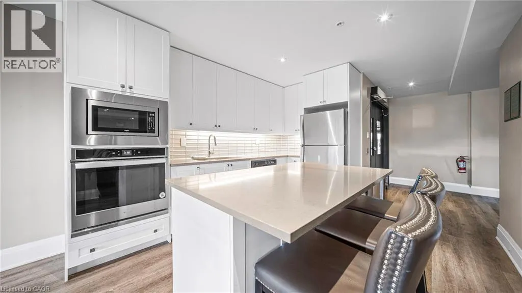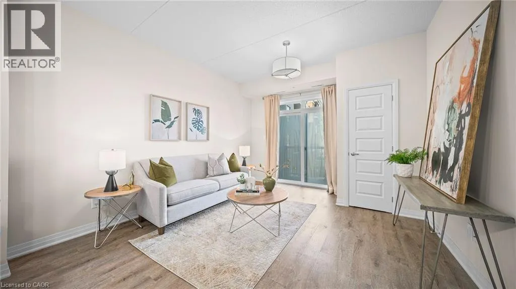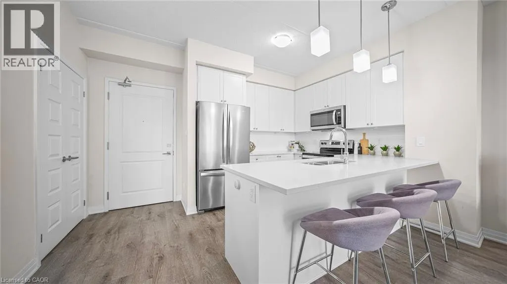 Derry and Bronte Welcome to this stylish and refined 1-bedroom, 1-bath suite in Miltonâs brand-new boutique condominium by 6 Ten. This condo features an open-concept layout enhanced by 9 ft ceilings and LVP flooring throughout. The modern eat-in kitchen is appointed with quartz countertops, stainless steel appliances, and a convenient breakfast bar. The unit offers generous living space with excellent closet storage, in-suite laundry, an open balcony, parking, and a locker. Building amenities include a fitness centre, party/media room, and a fenced dog park. Ideally situated in the heart of Milton, youâre just moments from shopping, major highways, golf courses, and scenic parks. (id:27476)