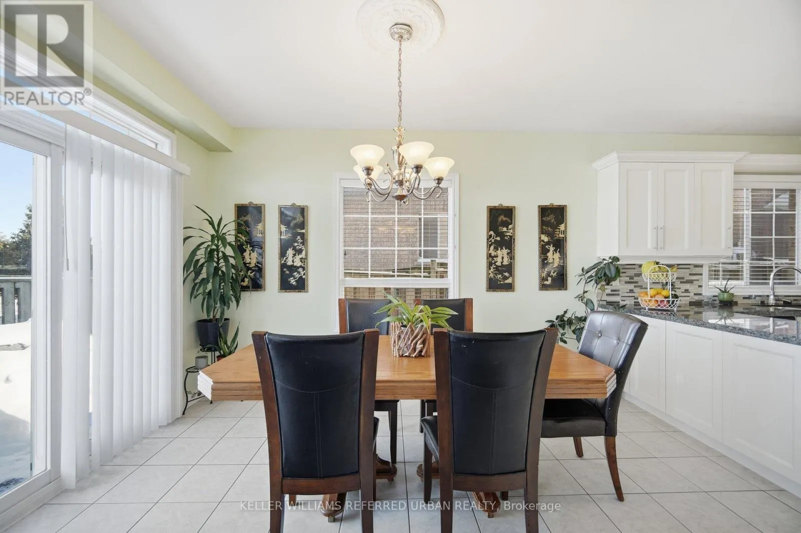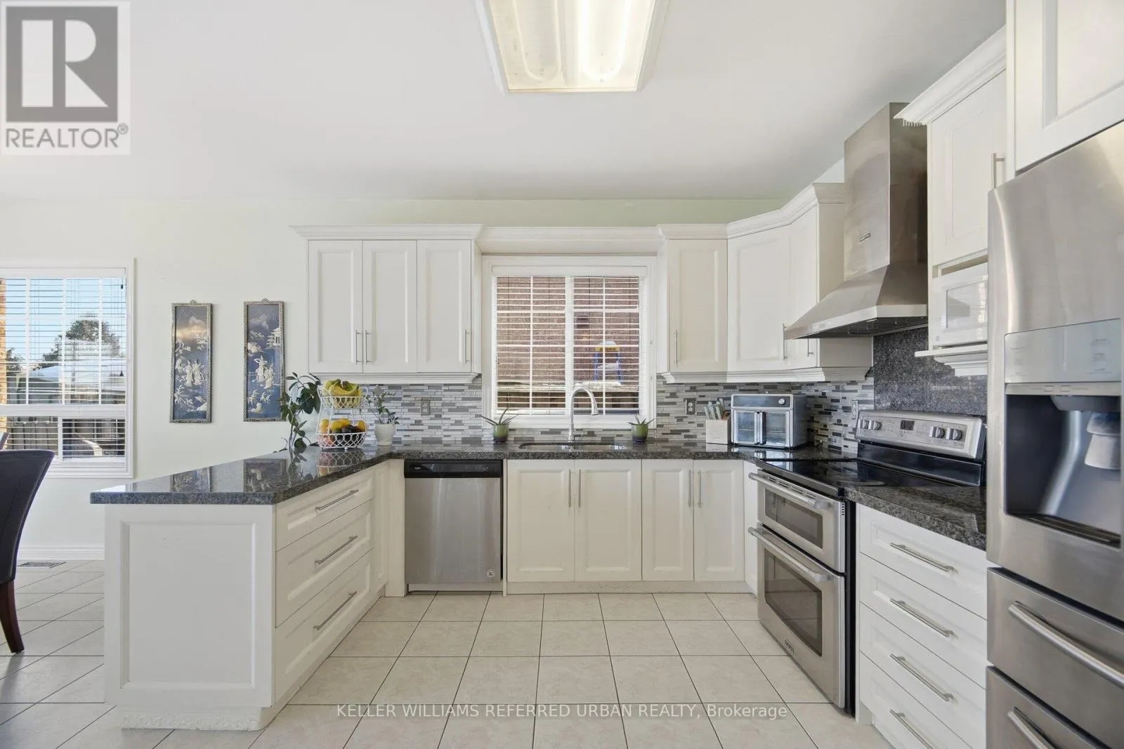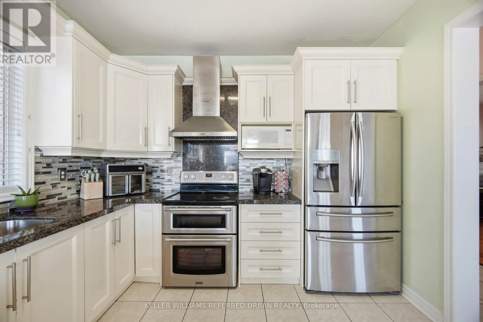 Thompson and Main Welcome to this beautifully appointed 4-bedroom, 5-bathroom detached residence with a double-car garage, ideally located in Milton's highly desirable Dempsey neighbourhood and backing onto full privacy in the form of a tranquil ravine. A bright, double-height foyer leads you to the main level, which features an open-concept living and dining area enhanced by elegant hardwood flooring and an abundance of natural light. At the heart of the home is the updated eat-in kitchen, showcasing crisp white cabinetry, dark granite countertops, a stylish backsplash, and quality appliances. The spacious breakfast area offers a walkout to the backyard and overlooks the inviting family room, complete with hardwood floors, a cozy fireplace, and large picture windows framing ravine views. The upper level offers four generously sized bedrooms and three full bathrooms. The private primary retreat, tucked away at the rear of the home, features a walk-in closet and 4-piece ensuite with a soaker tub, large vanity, and separate shower. Bedrooms two and three share a well-designed Jack-and-Jill bathroom, while the fourth bedroom enjoys its own private ensuite and double. The finished basement adds exceptional versatility with a large recreation area, full bath, and two bedrooms. Step outside to a private yard that's fully fenced, thoughtfully landscaped with mature gardens, lush greenery, and multiple seating areas, including a flagstone patio. Ideally located close to grocery stores, restaurants, theatres, shopping, and public transit, and within walking distance to schools, parks, the library, and the arts centre. Easy access to Highways 401 and 407 ensures effortless commuting. (id:27476)