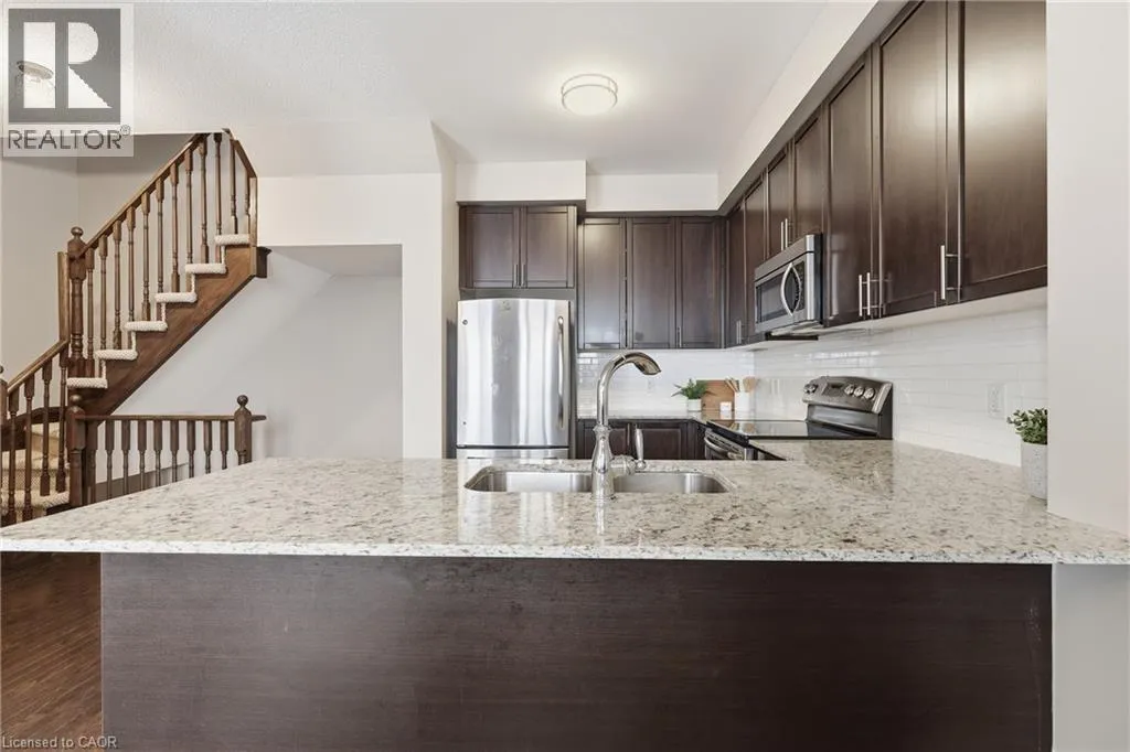 Main & James Snow Parkway Welcome to 165 Hampshire Way #134 in Milton, a beautiful freehold 3 storey townhome offering a functional and elegant layout in a highly family friendly neighbourhood. The main level features a spacious foyer with convenient garage access and laundry. Upstairs, the bright open concept kitchen is filled with natural light and overlooks both the living and dining areas, creating an ideal space for everyday living and entertaining. A 2 piece powder room and private balcony complete this level, adding comfort and convenience for guests. The upper floor offers two generously sized bedrooms, a 4 piece main bathroom, and a primary retreat featuring two spacious closets and a private 4 piece ensuite. Located just minutes from Highway 401, transit, schools, parks, and everyday amenities, this home delivers style, practicality, and an excellent location. A fantastic opportunity you do not want to miss. (id:27476)