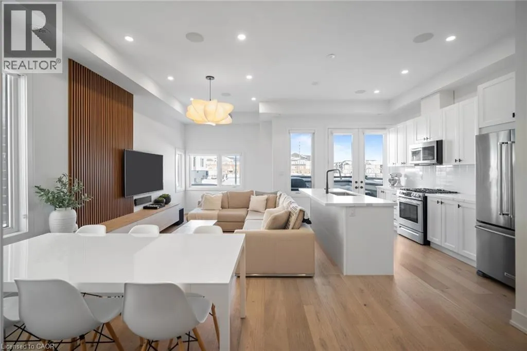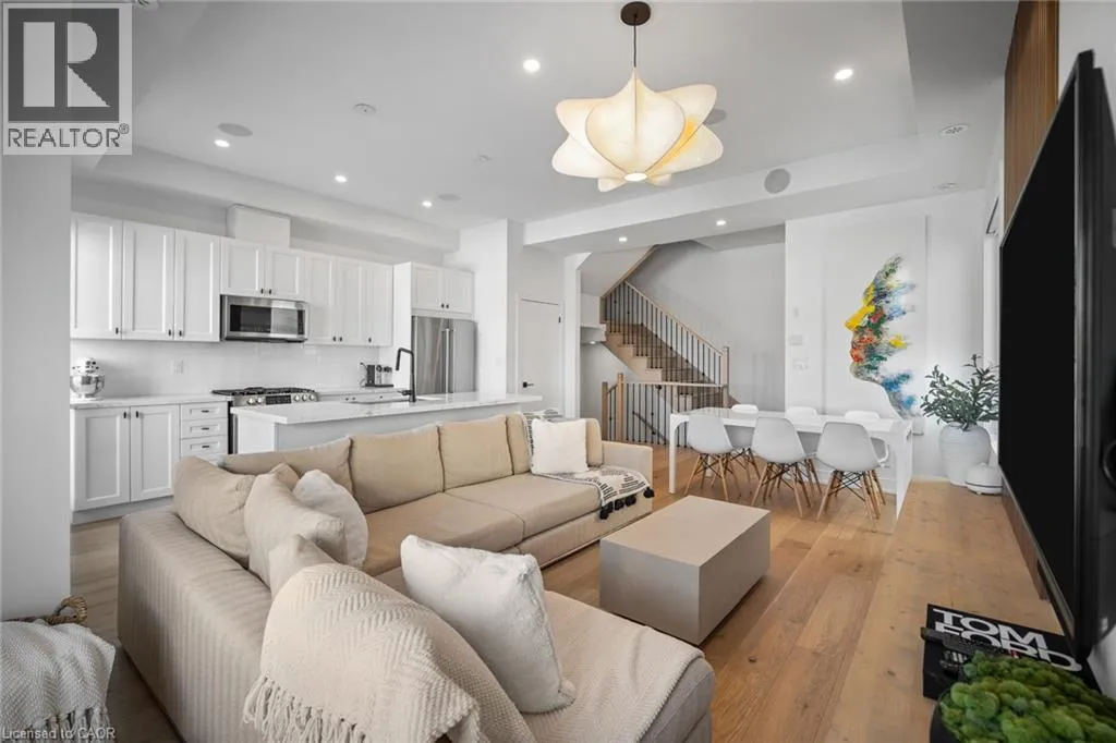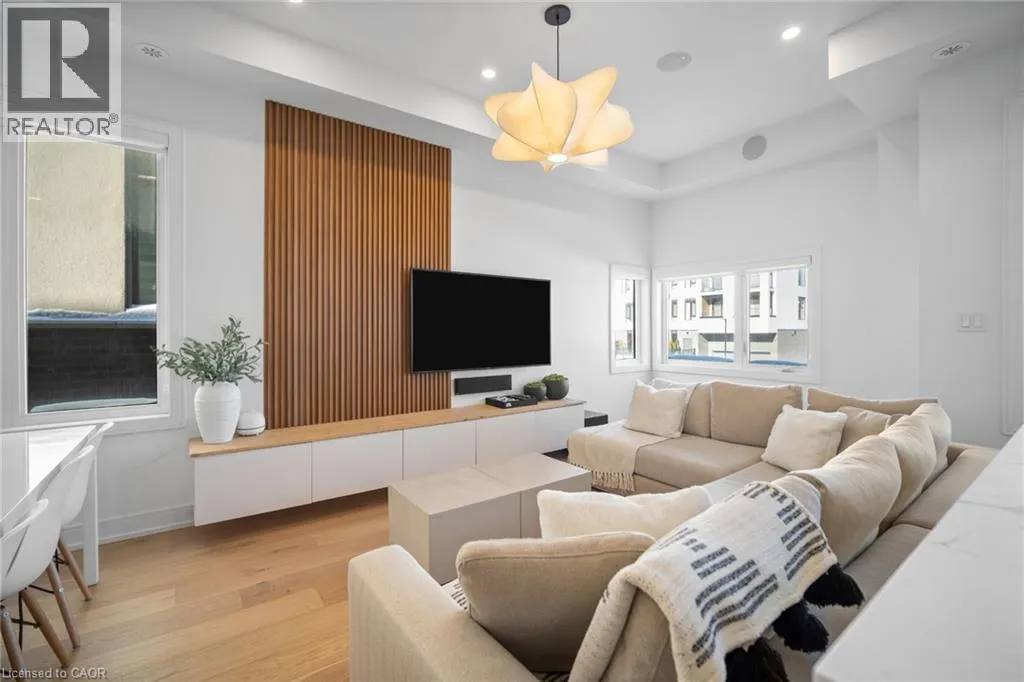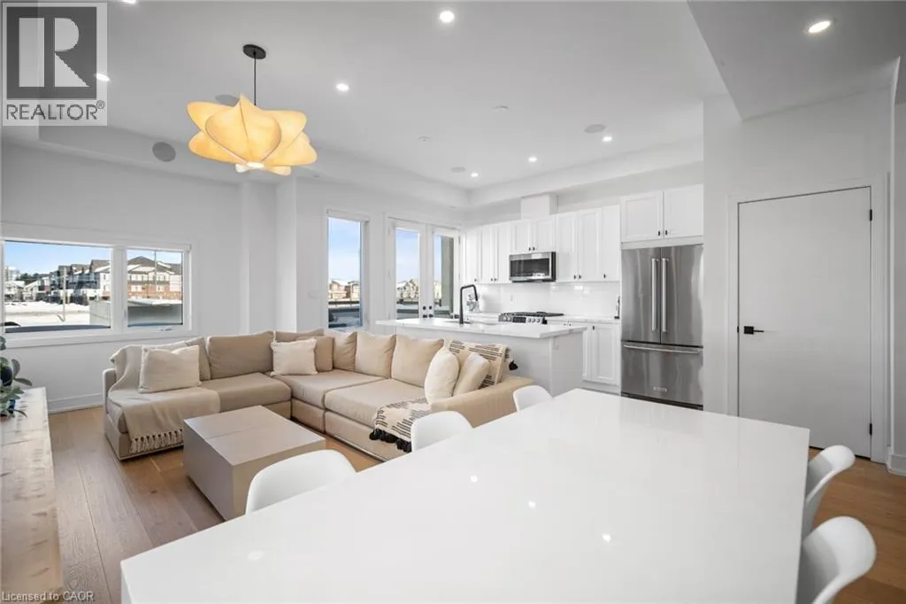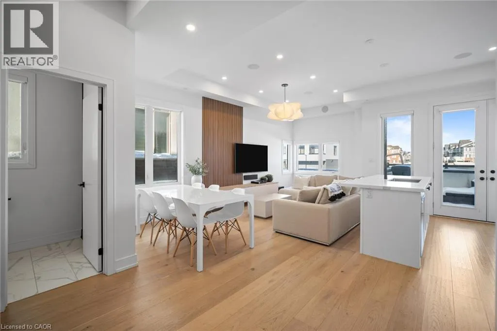 Freehold end-unit townhouse offering three stories of pristine living. This sun-drenched home features wide-plank hardwood flooring throughout and an open-concept layout designed for both comfort and style. Soaring 10-ft ceilings on the main level enhance the sense of space, while thoughtful details include custom built-in closets in every bedroom, main floor built in speakers and designer lighting throughout. This home offers three spacious bedrooms and three well-appointed bathrooms. Enjoy seamless indoor-outdoor living with a large private balcony, complete with a gas line for summer BBQs and entertaining. A truly move-in-ready residence that blends simplicity, function, and beauty in one exceptional package. (id:27476)