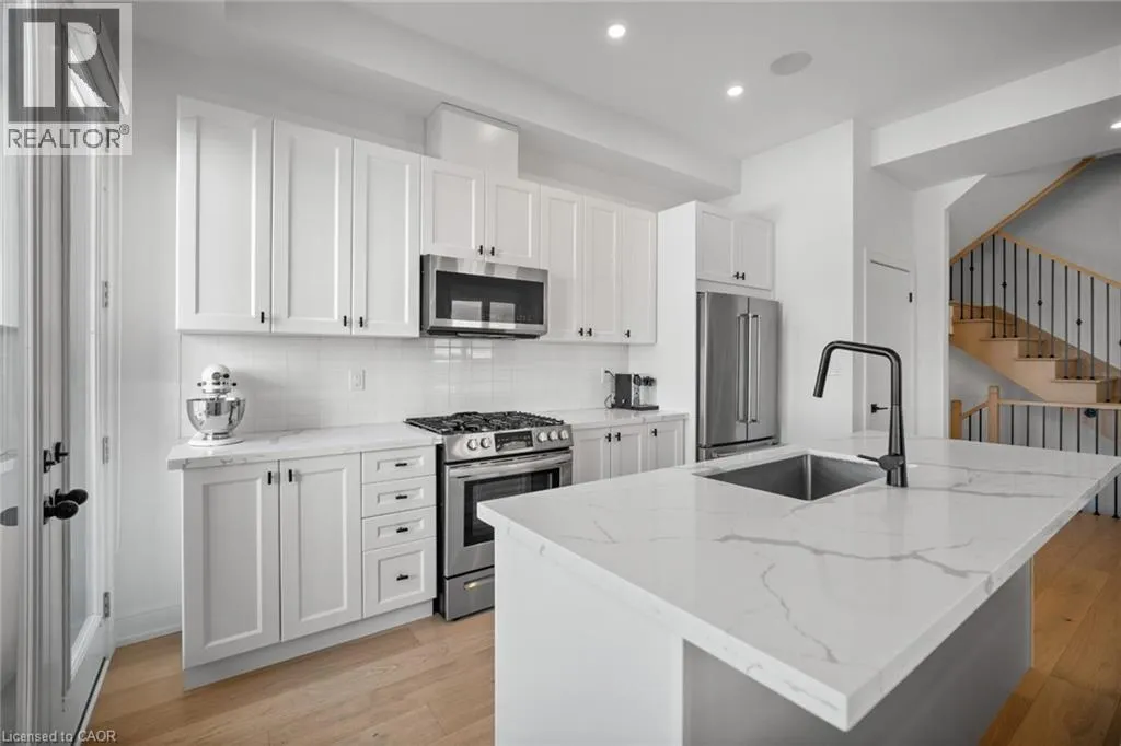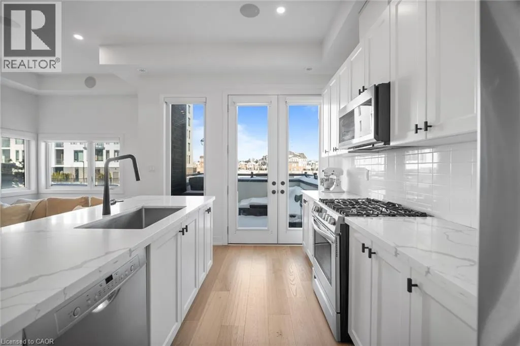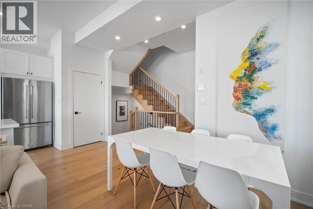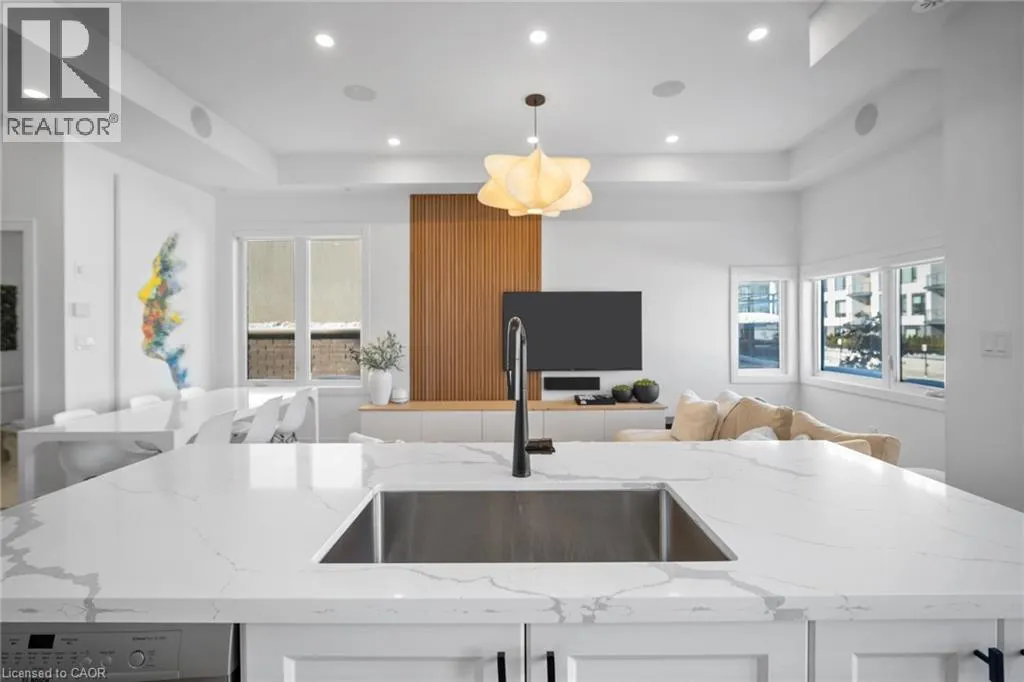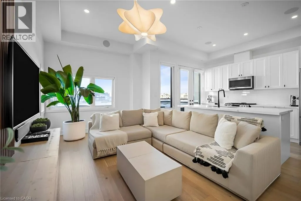 Freehold end-unit townhouse offering three stories of pristine living. This sun-drenched home features wide-plank hardwood flooring throughout and an open-concept layout designed for both comfort and style. Soaring 10-ft ceilings on the main level enhance the sense of space, while thoughtful details include custom built-in closets in every bedroom, main floor built in speakers and designer lighting throughout. This home offers three spacious bedrooms and three well-appointed bathrooms. Enjoy seamless indoor-outdoor living with a large private balcony, complete with a gas line for summer BBQs and entertaining. A truly move-in-ready residence that blends simplicity, function, and beauty in one exceptional package. (id:27476)