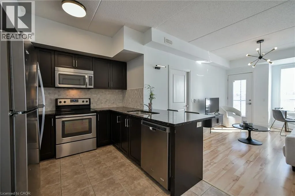 Enjoy upscale living in this beautiful 2-bedroom condo with serene pond views. Offering over 800 sq ft of well-designed living space, this unit features a functional layout with 9-ft ceilings, extended-height kitchen cabinetry, stainless steel appliances, and granite countertops. Large windows flood the space with natural light and showcase sunny southern exposure. Step out onto your private balcony to enjoy your morning coffee while taking in peaceful nature views. Conveniently located just minutes from major highways and steps to schools, parks, and walking trails. Extras include: underground parking close to the entrance, stainless steel fridge, stove, dishwasher, washer and dryer, electric light fixtures,curtains. Garbage room is conveniently located near the unit, and a locker is directly across from the unit. (id:27476)
