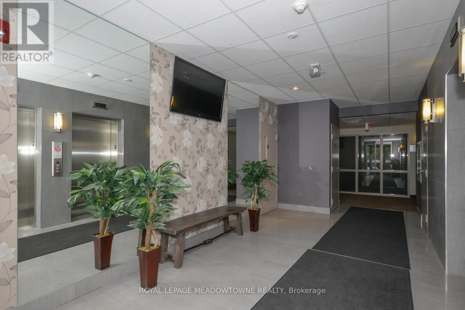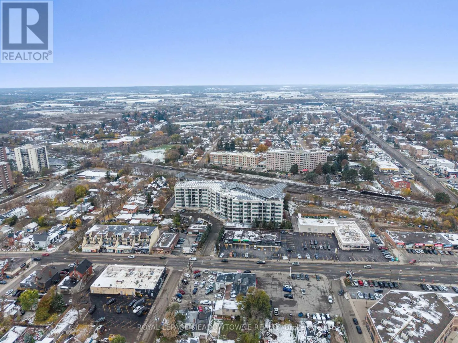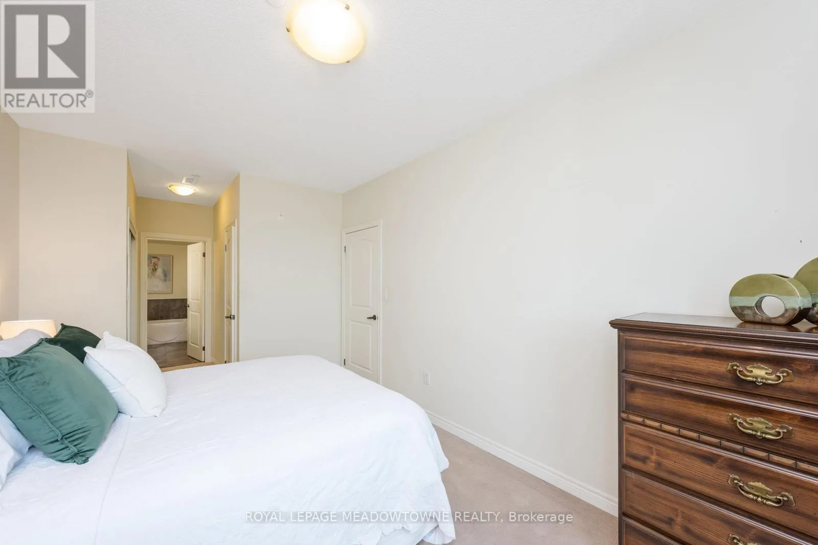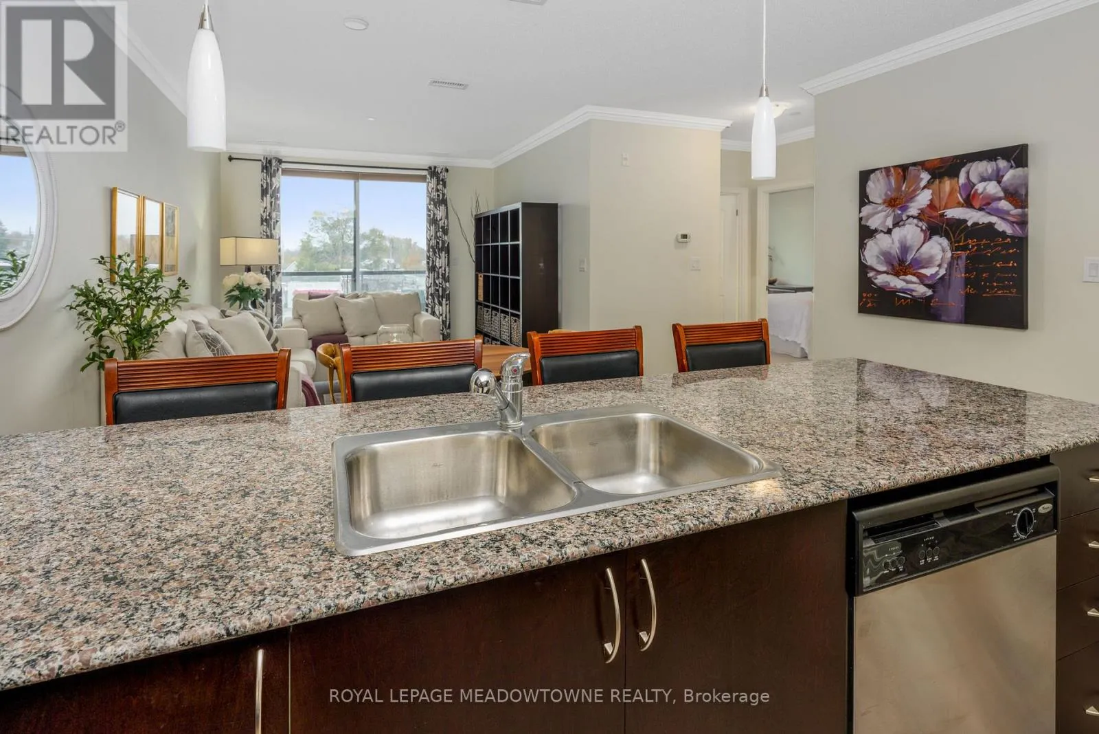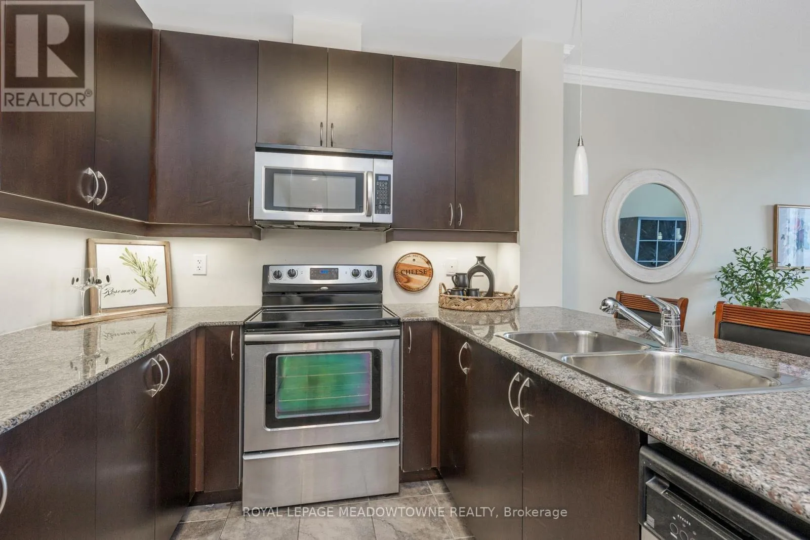 Cross Streets: Ontario & Main. ** Directions: . Comfort meets convenience in the heart of Milton. This beautifully maintained 2-bedroom, 2-bathroom suite offers 1,005 sq. ft. of thoughtfully designed living space in one of downtown's most sought-after communities. Enjoy energy-efficient geothermal heating and cooling, keeping utility costs manageable year-round. A welcoming foyer with a large front closet and additional storage in the laundry/mechanical room sets the tone for the functional layout. The stylish kitchen features a breakfast bar peninsula with pendant lighting and seating for four, stainless steel appliances, granite countertops, and ample cabinetry - perfect for both everyday living and entertaining. The open-concept living and dining area is finished with laminate flooring and walks out to a private south-facing balcony overlooking Main Street, offering charming downtown views. The spacious primary retreat includes broadloom flooring, two large closets, and a private 4-piece ensuite complete with a granite-topped vanity, under-mount sink, separate shower, and deep soaker jetted tub. The second bedroom is well-sized with broadloom flooring and a generous closet, complemented by a second full 4-piece bathroom featuring a granite vanity and tub/shower combination. This unit includes one underground parking space and a storage locker. Residents enjoy access to exceptional amenities including a fitness centre, party room, games room, and ample visitor parking - all just steps from transit, shops, restaurants, and everything downtown Milton has to offer. Urban convenience and comfortable living, all in one place. (id:27476)