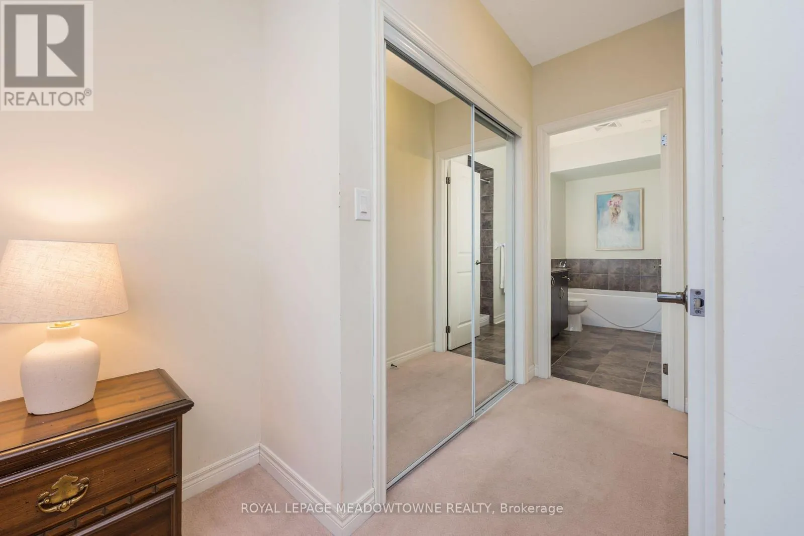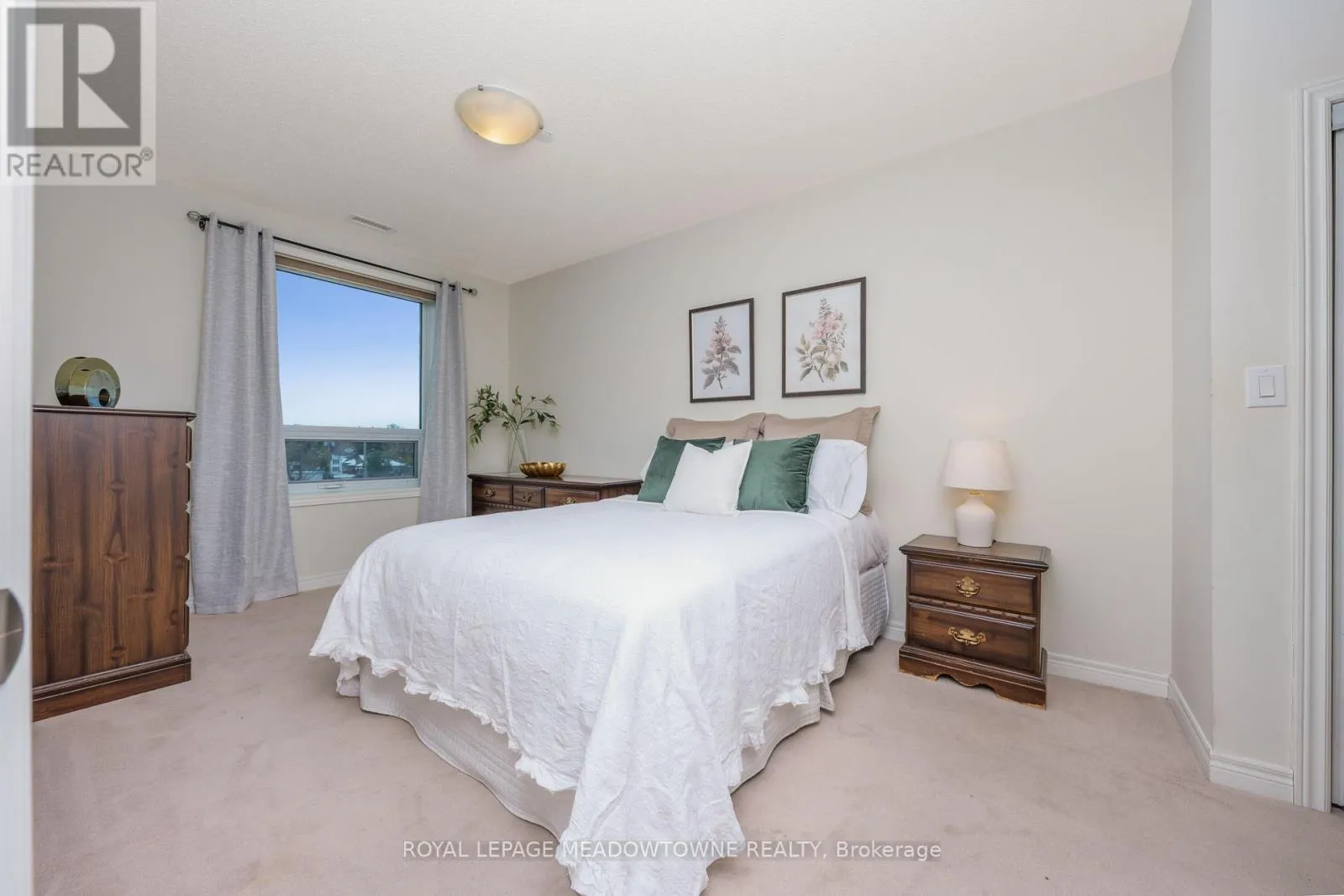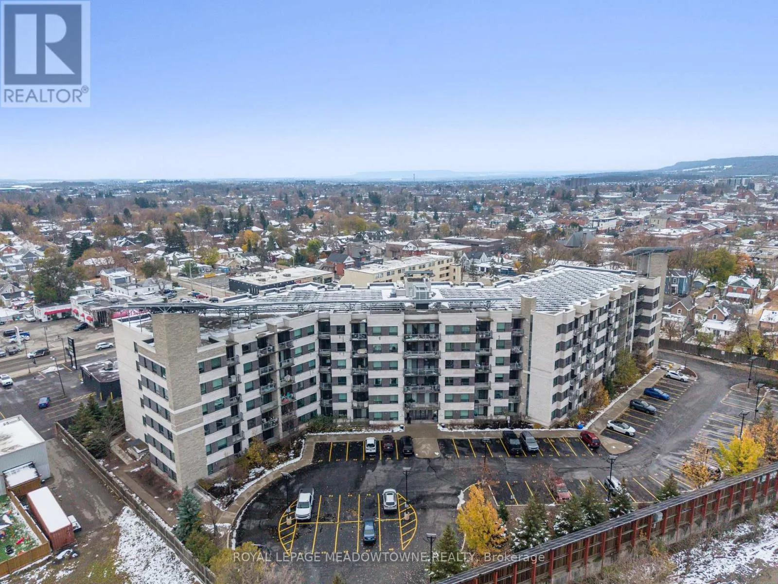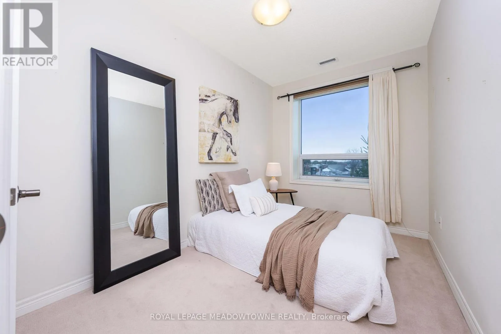 Cross Streets: Ontario & Main. ** Directions: . Comfort meets convenience in the heart of Milton. This beautifully maintained 2-bedroom, 2-bathroom suite offers 1,005 sq. ft. of thoughtfully designed living space in one of downtown's most sought-after communities. Enjoy energy-efficient geothermal heating and cooling, keeping utility costs manageable year-round. A welcoming foyer with a large front closet and additional storage in the laundry/mechanical room sets the tone for the functional layout. The stylish kitchen features a breakfast bar peninsula with pendant lighting and seating for four, stainless steel appliances, granite countertops, and ample cabinetry - perfect for both everyday living and entertaining. The open-concept living and dining area is finished with laminate flooring and walks out to a private south-facing balcony overlooking Main Street, offering charming downtown views. The spacious primary retreat includes broadloom flooring, two large closets, and a private 4-piece ensuite complete with a granite-topped vanity, under-mount sink, separate shower, and deep soaker jetted tub. The second bedroom is well-sized with broadloom flooring and a generous closet, complemented by a second full 4-piece bathroom featuring a granite vanity and tub/shower combination. This unit includes one underground parking space and a storage locker. Residents enjoy access to exceptional amenities including a fitness centre, party room, games room, and ample visitor parking - all just steps from transit, shops, restaurants, and everything downtown Milton has to offer. Urban convenience and comfortable living, all in one place. (id:27476)