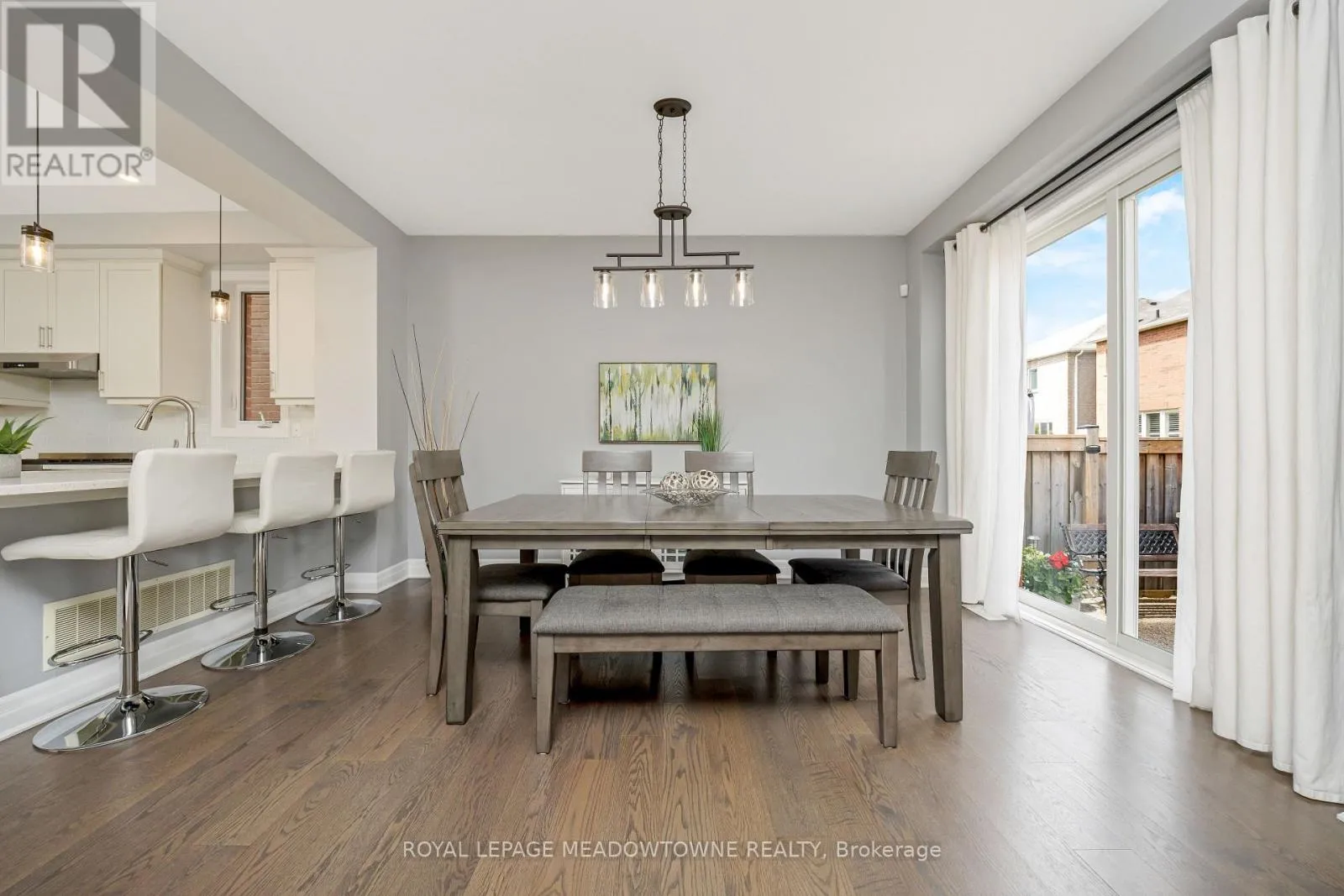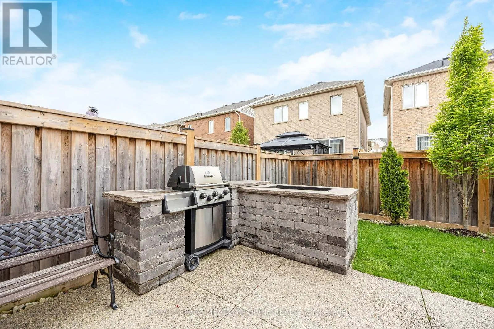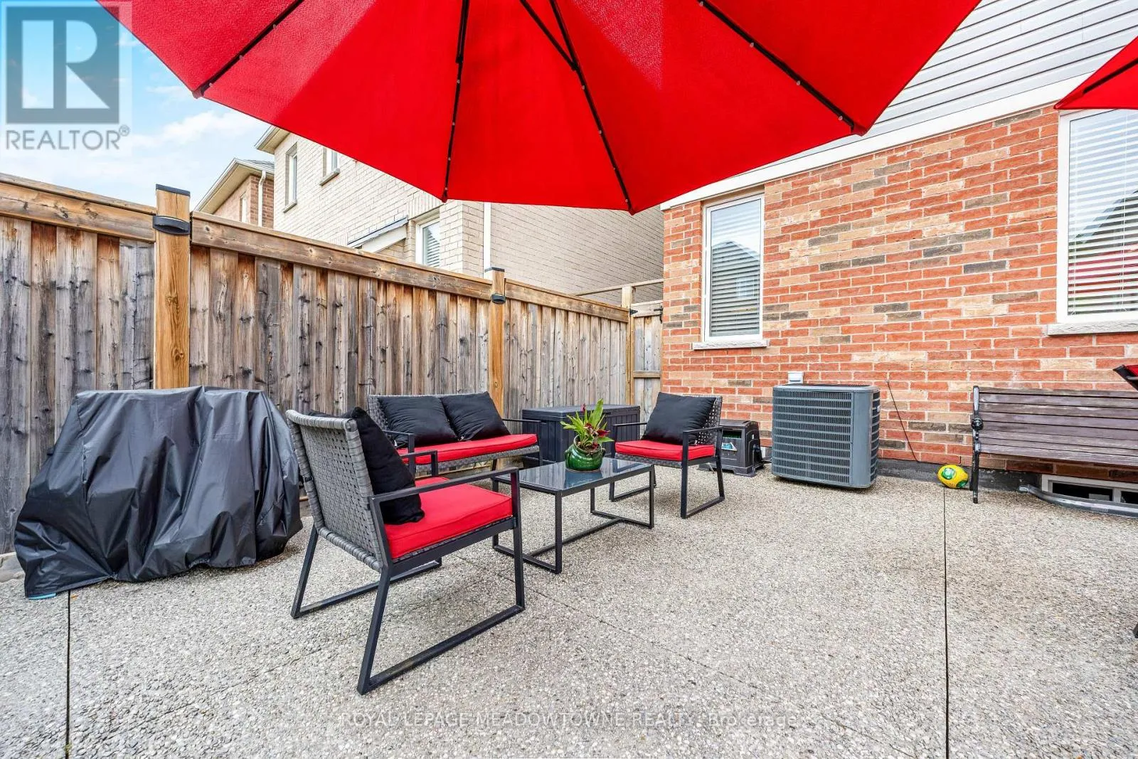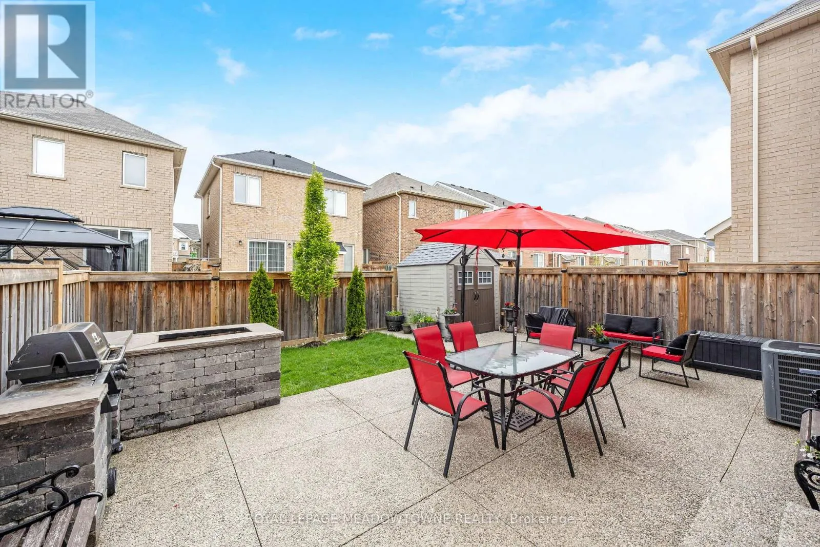 Brittania/Farmstead This lovely home is a Mattamy-built Nobleton model offering nearly 1,800 sq ft above grade plus approximately 700 sq ft of finished basement space, set on a quiet, low-traffic crescent in Milton where kids can ride bikes and walk to local schools. Aggregate concrete walkway and extended side patio lead to a backyard designed for gathering, featuring an integrated BBQ, fire pit cooking area, and low-maintenance vinyl shed. Main floor with 9 ft ceilings and spacious front entry. Open layout connects kitchen, dining, and family room. Kitchen includes centre island with built-in microwave, upgraded countertops and backsplash, pot lights, and gas stove. Breakfast bar overlooks main living space. Hardwood stairs with iron pickets from main to second floor. Upstairs laundry for added convenience. Primary bedroom with walk-in closet and ensuite featuring glass shower. Secondary bedroom with private balcony for added privacy. Finished basement features fireplace and built-in bar area, ideal for movie nights, home office, or entertaining. A well-designed home combining layout, functionality, and outdoor living in a family-friendly setting. (id:27476)