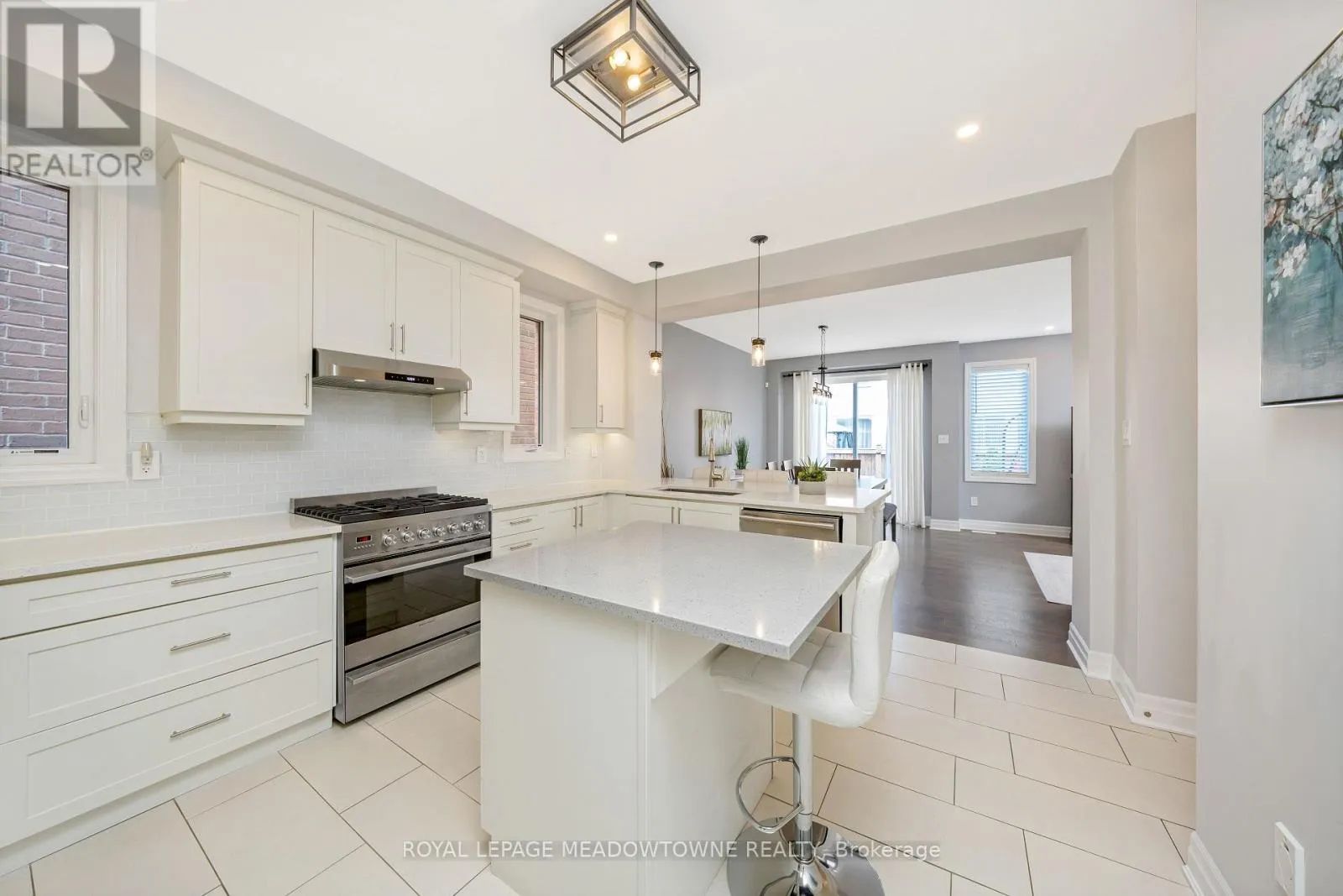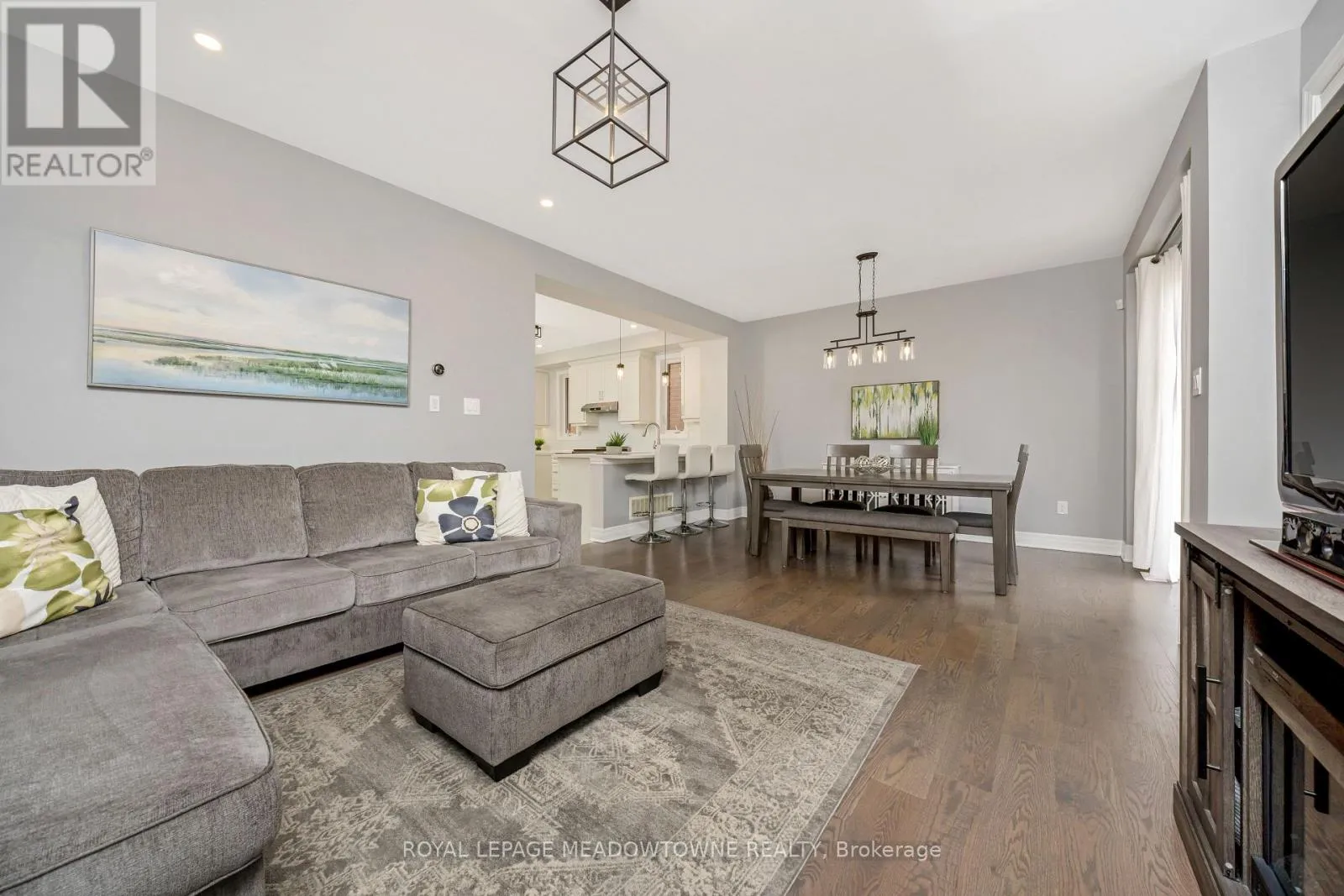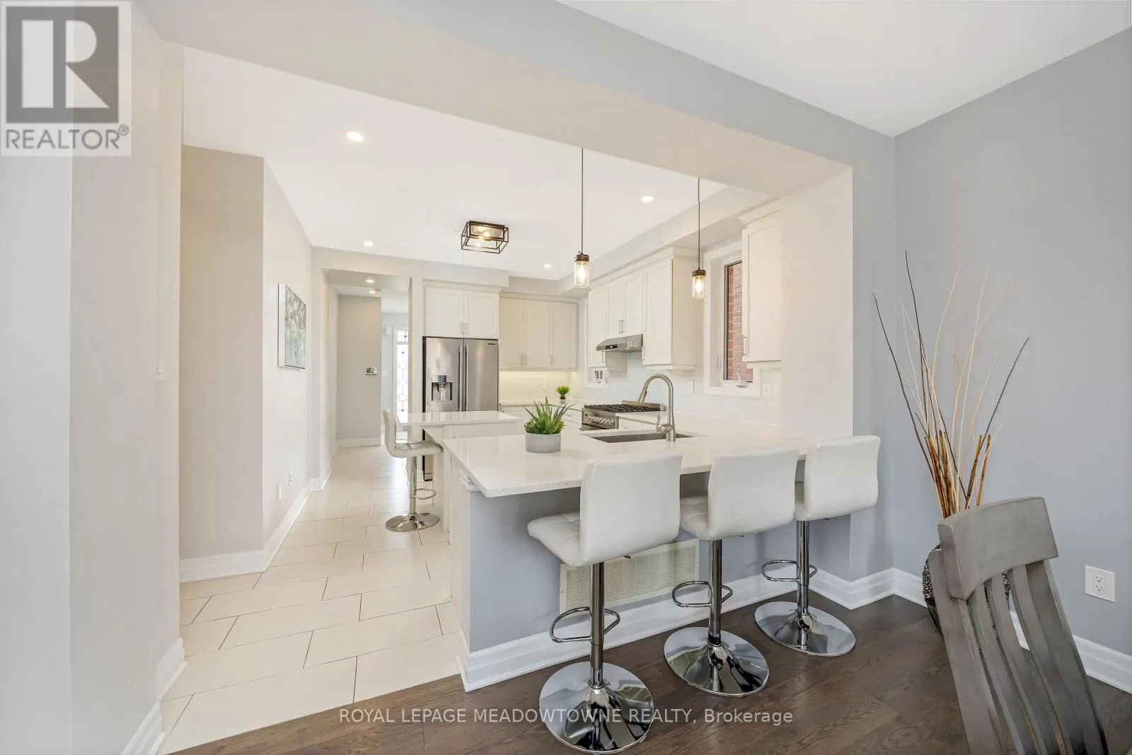 Brittania/Farmstead This lovely home is a Mattamy-built Nobleton model offering nearly 1,800 sq ft above grade plus approximately 700 sq ft of finished basement space, set on a quiet, low-traffic crescent in Milton where kids can ride bikes and walk to local schools. Aggregate concrete walkway and extended side patio lead to a backyard designed for gathering, featuring an integrated BBQ, fire pit cooking area, and low-maintenance vinyl shed. Main floor with 9 ft ceilings and spacious front entry. Open layout connects kitchen, dining, and family room. Kitchen includes centre island with built-in microwave, upgraded countertops and backsplash, pot lights, and gas stove. Breakfast bar overlooks main living space. Hardwood stairs with iron pickets from main to second floor. Upstairs laundry for added convenience. Primary bedroom with walk-in closet and ensuite featuring glass shower. Secondary bedroom with private balcony for added privacy. Finished basement features fireplace and built-in bar area, ideal for movie nights, home office, or entertaining. A well-designed home combining layout, functionality, and outdoor living in a family-friendly setting. (id:27476)