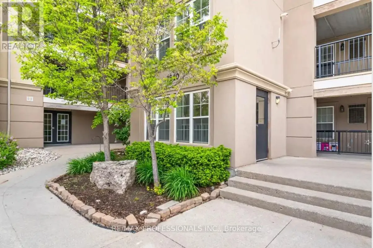 Cross Streets: East. ** Directions: Main St E & James Snow Parkway. Welcome to Bristol on Main Condominiums! Ground floor unit facing park with a park view. Walk out patio from kitchen. BBQ allowed. Breakfast style countertop. This is a well-established mid-rise condo community located in the Dempsey neighbourhood of Milton. Built by Sutherland Development and completed around 2012, amenities include: A Gym, The buildings share a central rec centre where residents enjoy access to a party/social room with kitchen and fireplace, fitness/exercise room and visitor parking. Den can be used as a second bedroom and is currently being used as one. An extra surface parking spot is available at no extra cost from management.Plenty of visitor parking. Minutes to HWY 401, transit at your door step. * NOTE * Unit is wheelchair accessible, wide doors on main level units. (id:27476)