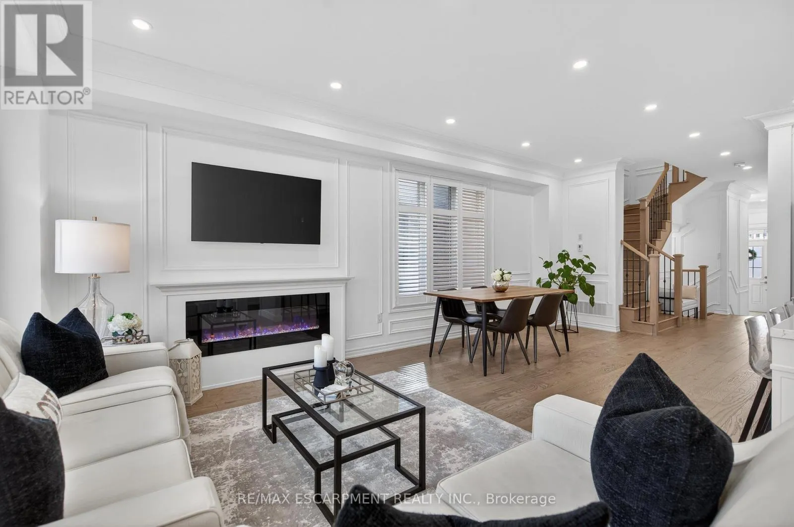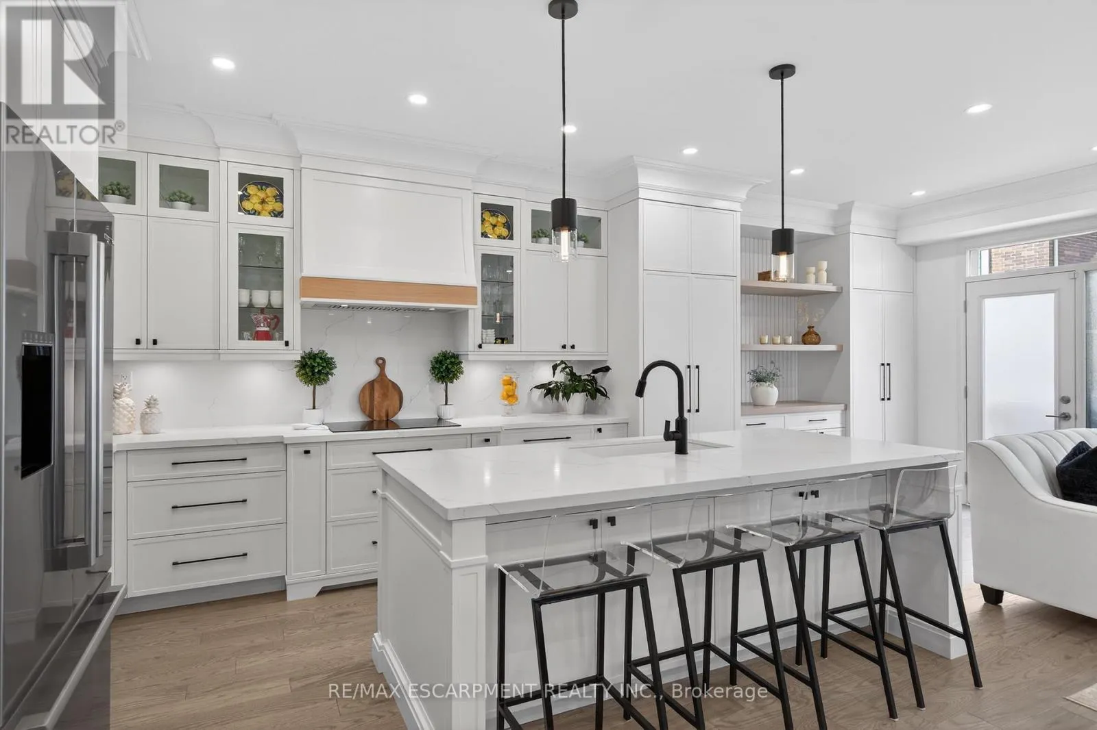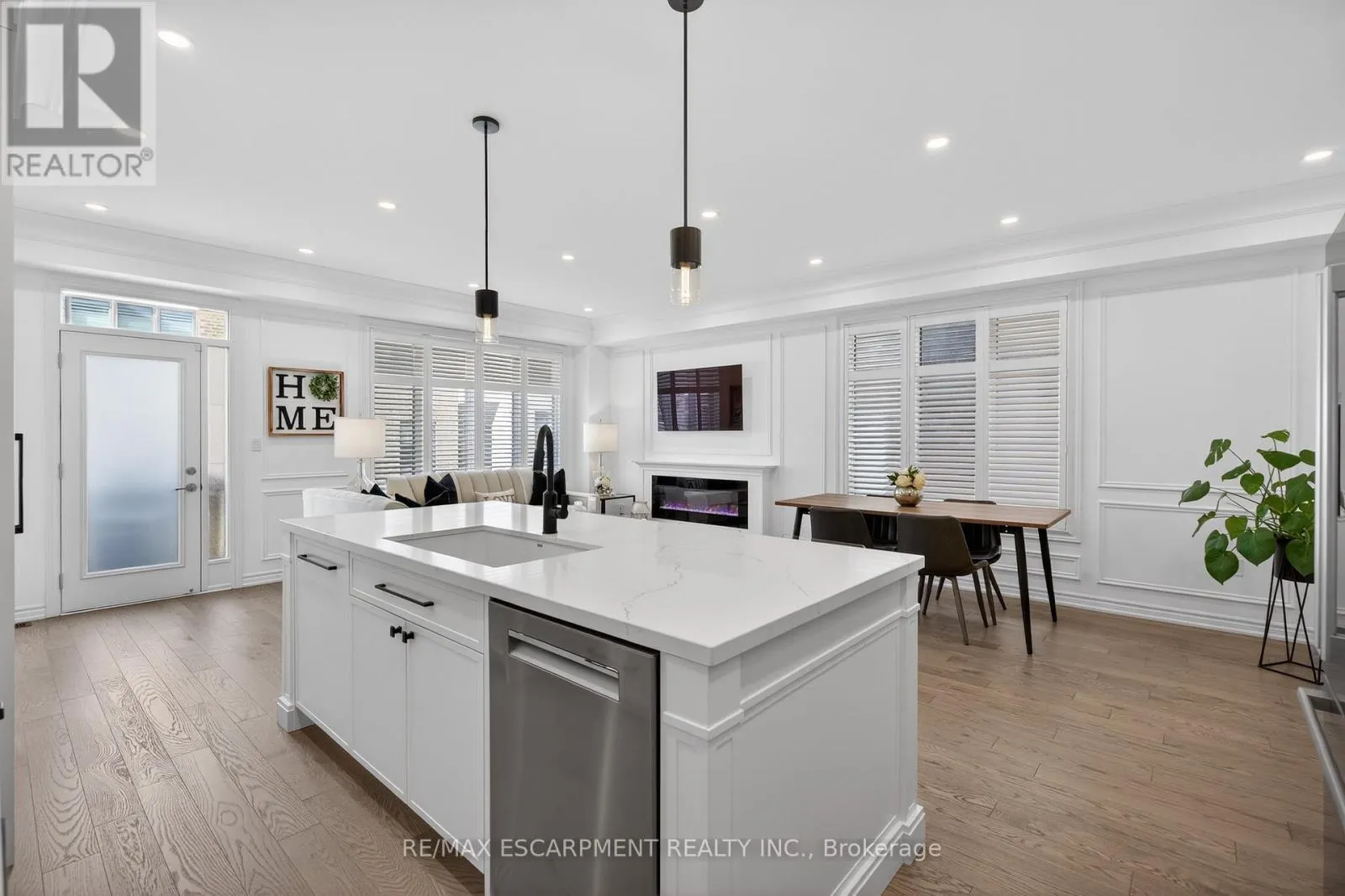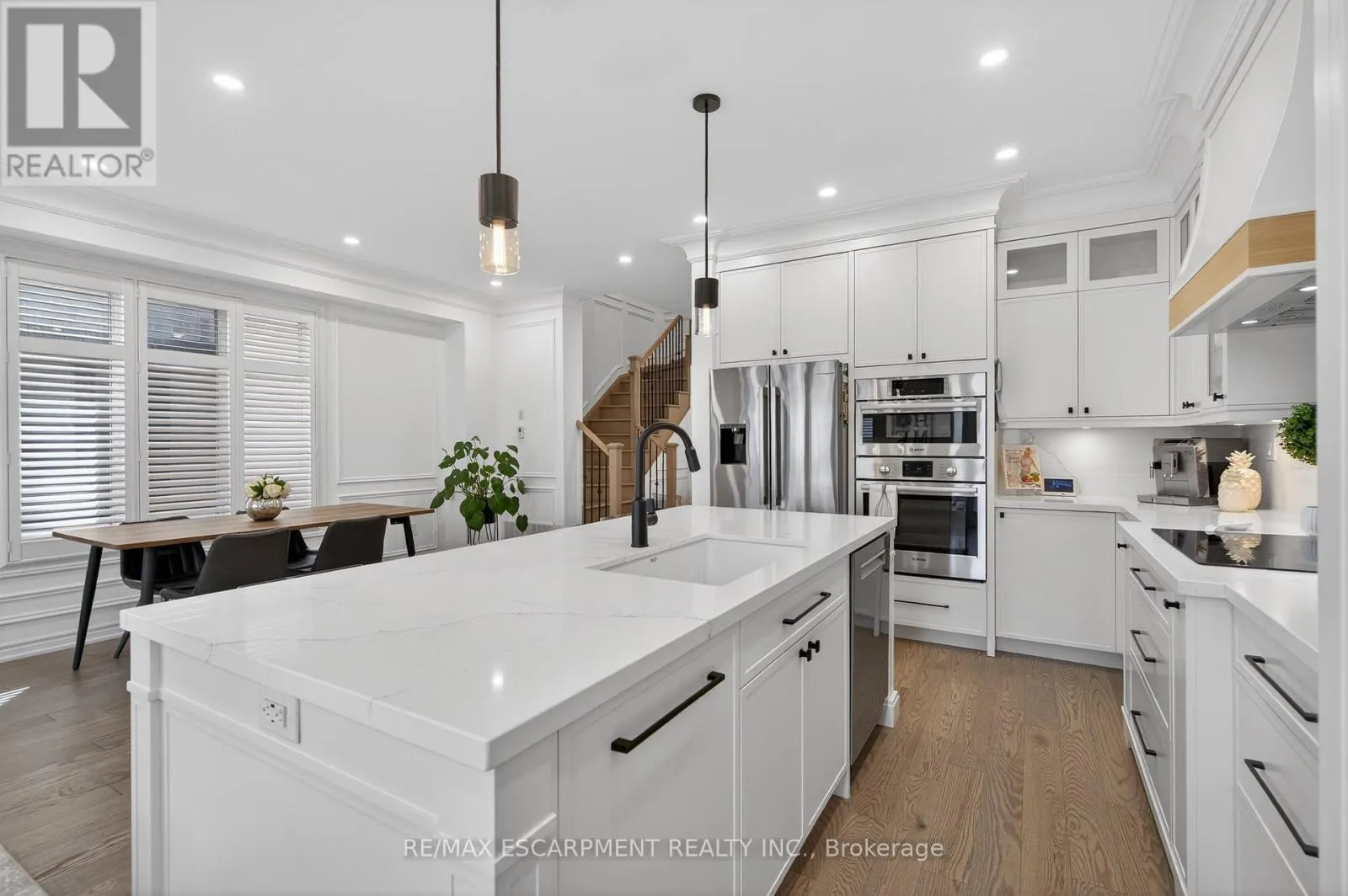 Cross Streets: Tremaine Rd/Bergamot Ave. ** Directions: Tremaine Rd N to Bergamot Ave to Watercress Way to Celandine Terr. Welcome to this gorgeous, one-of-a-kind 4-bedroom end-unit townhome, ideally located on a quiet street in the highly sought-after South West Walkers community. Thoughtfully designed and meticulously maintained, this home showcases upscale finishes and a functional, modern layout perfect for families and entertainers alike. Main Level Open-concept layout with smooth ceilings, elegant crown moulding, and custom wainscoting, Upgraded engineered hardwood flooring and California shutters throughout , Pot lights and an electric fireplace add a ambiance to the spacious living area, Renovated Chef inspired kitchen featuring a full wall of sleek cabinetry with glass inserts, Large pantry and quartz countertops, Generous island with breakfast bar, Under-cabinet lighting, stylish backsplash, and built-in stainless steel appliances, elegant oak staircase with iron pickets leads to upper level, Four generously sized bedrooms including a Luxurious primary retreat complete with walk-in closet and spa-like ensuite, featuring a glass shower, soaker tub, and double sinks, upper level laundry, main bath has double sinks, Located minutes from top-rated schools, Walker Park, scenic trails, Hwy 401 & 407, Milton Sports Centre, Sherwood Community Centre, Milton District Hospital, Rattlesnake Point Golf Club, and so much more. Don't miss your chance to own this exceptional home in a vibrant, family-friendly neighbourhood! (id:27476)