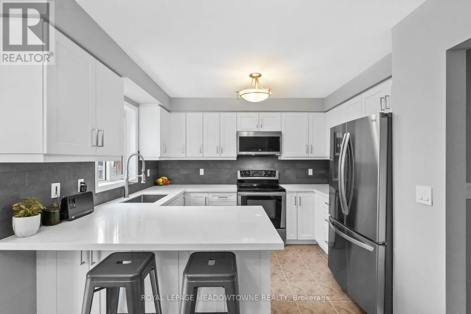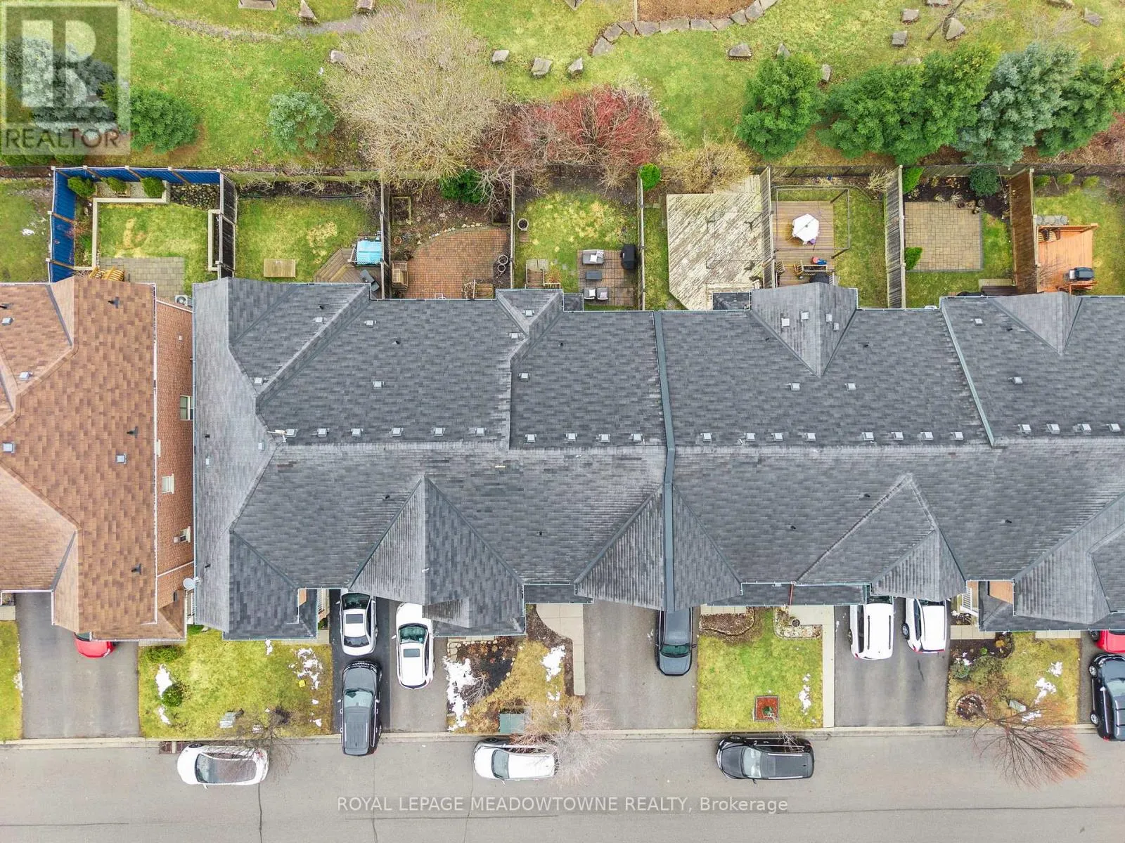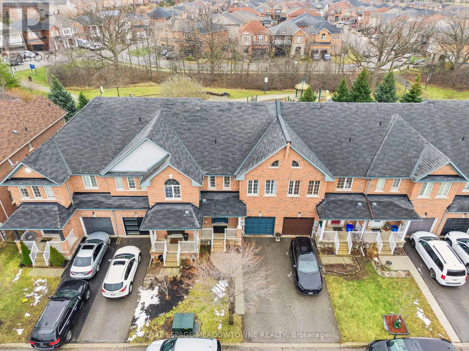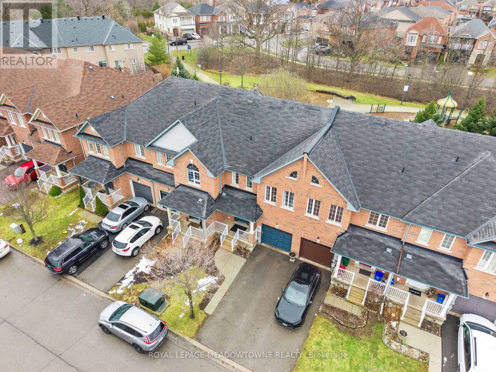Thompson/Derry Carlton model townhome with 1,715 sq ft of living space. Backs onto mature trees and a neighbourhood park with no rear neighbours. Renovated "Adore Your Kitchen" with pantry, breakfast bar, backsplash and new appliances. Open concept main floor. 3 bedrooms, 3 bathrooms including 2 full upstairs. Convenient second floor laundry. Finished basement with rare, functional storage space. Quiet, low-traffic street. Walk to schools, parks, community centre, arts centre and GO. Parking for 3 cars. (id:27476)