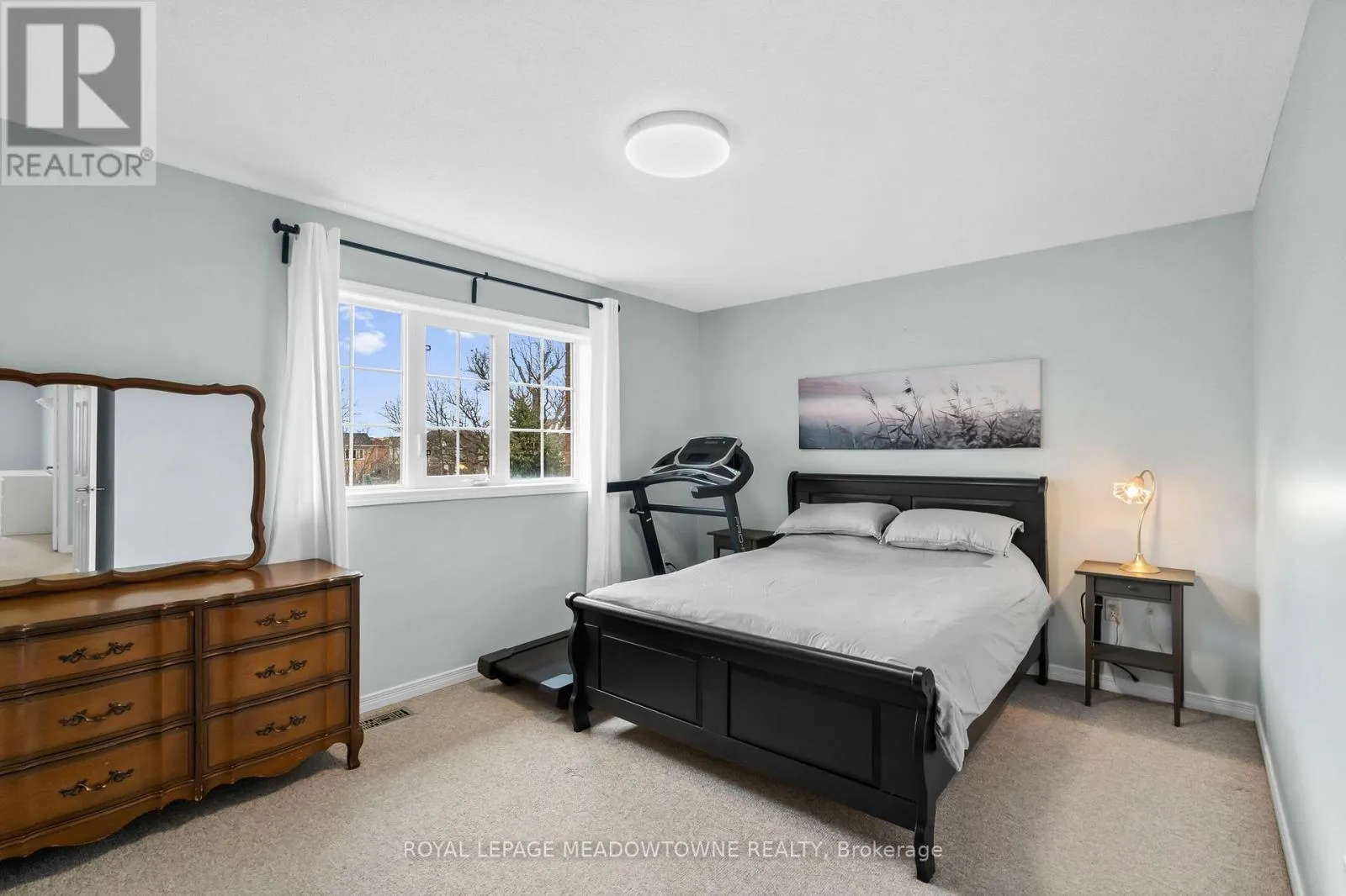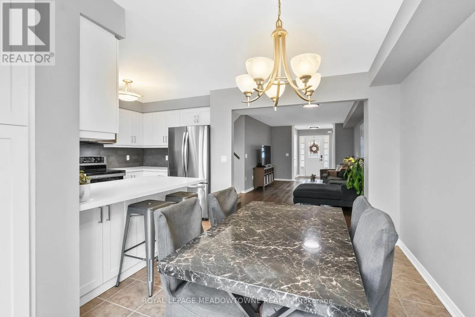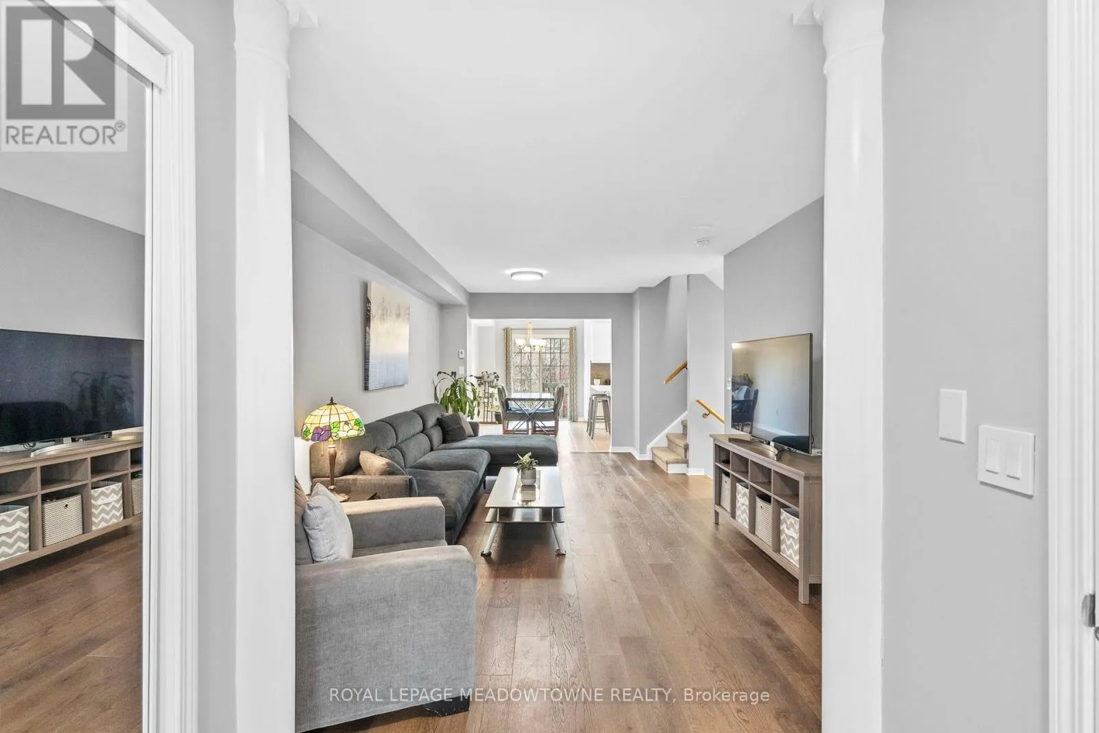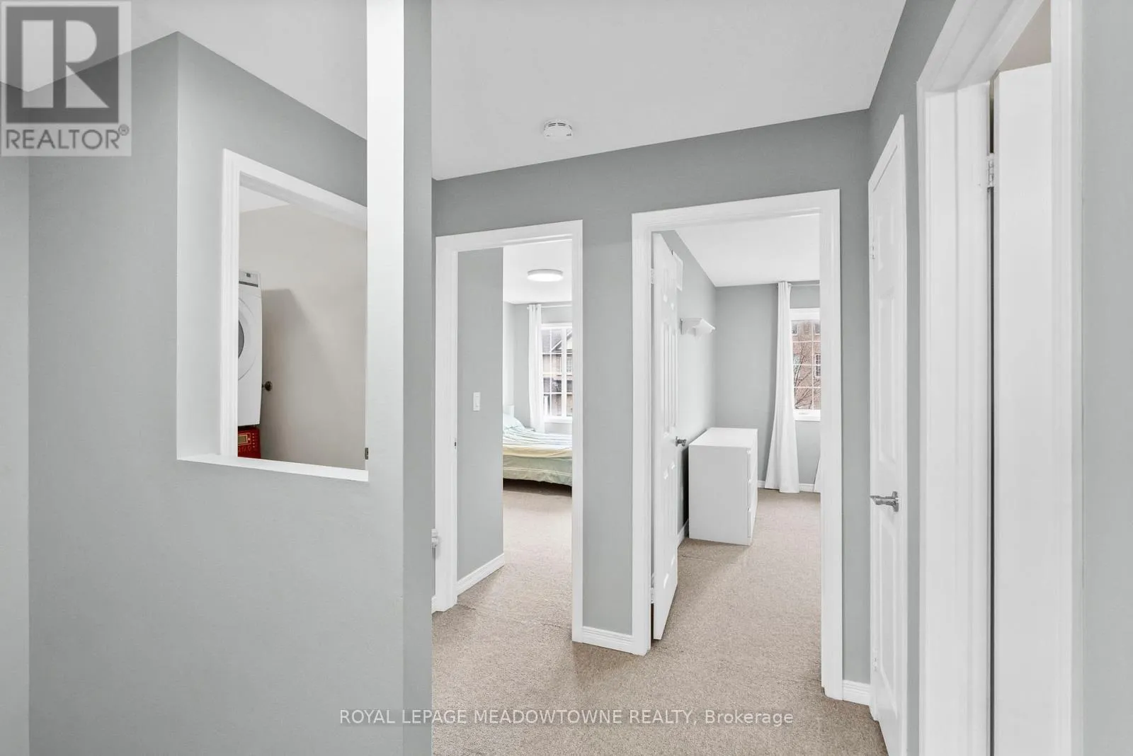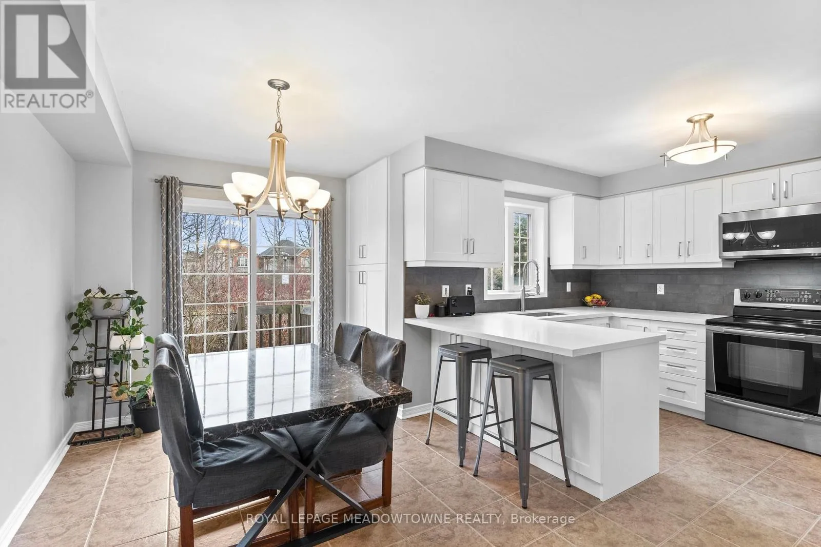 Thompson/Derry Carlton model townhome with 1,715 sq ft of living space. Backs onto mature trees and a neighbourhood park with no rear neighbours. Renovated "Adore Your Kitchen" with pantry, breakfast bar, backsplash and new appliances. Open concept main floor. 3 bedrooms, 3 bathrooms including 2 full upstairs. Convenient second floor laundry. Finished basement with rare, functional storage space. Quiet, low-traffic street. Walk to schools, parks, community centre, arts centre and GO. Parking for 3 cars. (id:27476)