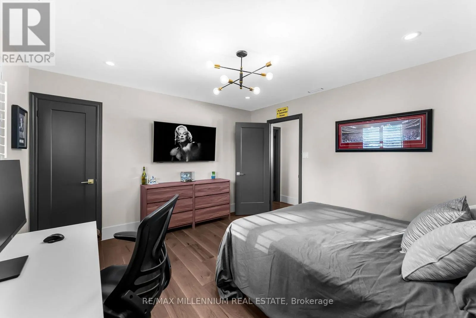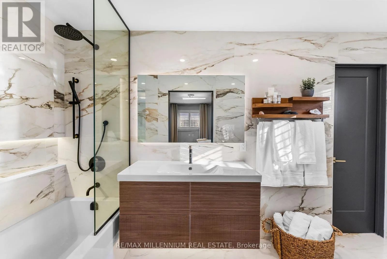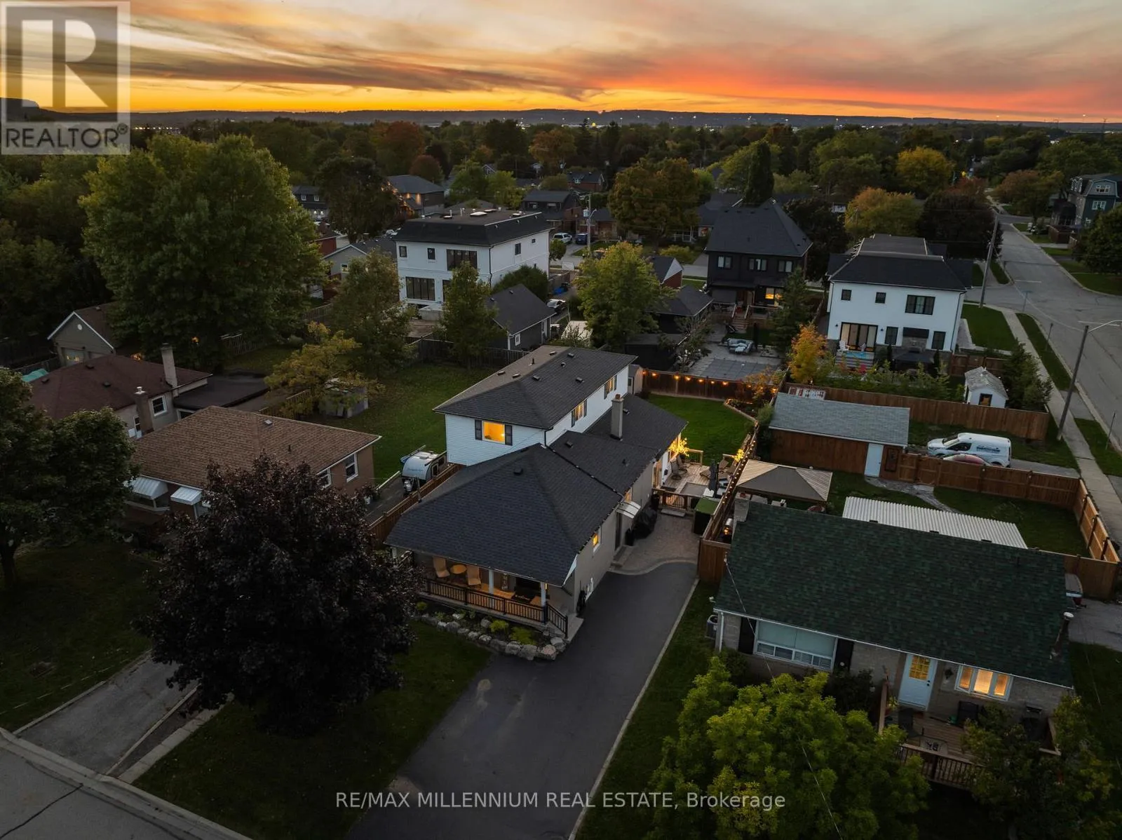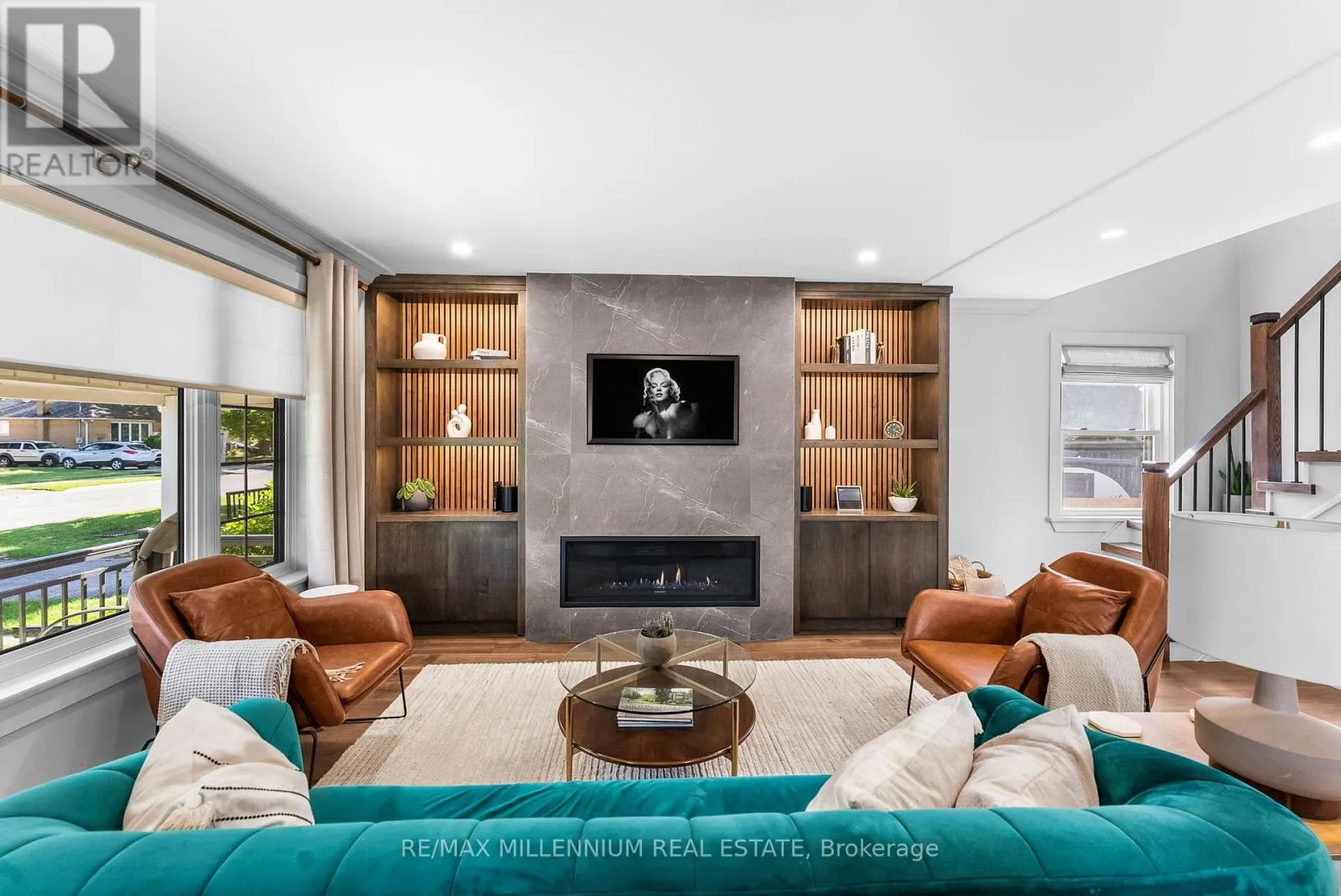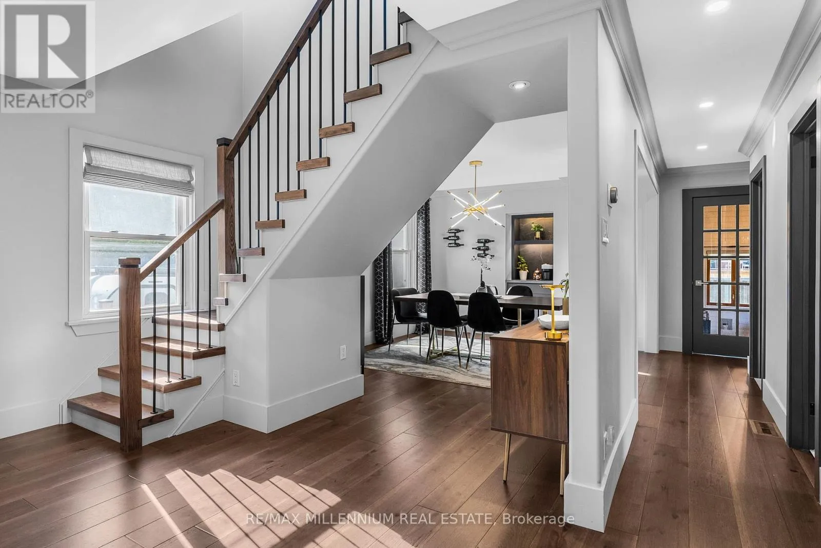 Ontario St N and Main St E Team Tiger proudly presents 393 George Street, Milton a stunning designer-inspired residence that blends luxury craftsmanship, modern comfort, and timeless sophistication in one of Milton's most established neighbourhoods. Every detail has been meticulously curated to create a home that radiates style, function, and warmth.Step inside to discover luxury large-plank Hickory engineered hardwood flooring (2023) that flows seamlessly throughout the main and upper levels, complemented by a custom hardwood-capped staircase with wrought iron railings (2025). The living area is anchored by a 56" Continental Linear Gas Fireplace framed with Italian 24"x48" Rebel porcelain tile, surrounded by custom built-in cabinetry with ambient lighting (2024) the perfect setting for elegant entertaining or quiet evenings at home.The primary ensuite redefines spa-like indulgence with heated Italian porcelain floors, a floating vanity, backlit mirror, Grohe wall-mounted toilet, custom glass shower, and Vogt Drava Collection fixtures every element designed for refined relaxation. Additional bathrooms mirror this design quality with premium porcelain tile, floating vanities, textured accent walls, and modern backlit mirrors (2025).Enjoy effortless comfort with custom window treatments, motorized sunroom shades, upgraded 200-amp electrical (2024), Beam SC375 central vacuum (2024), Fusion 2 water softener (owned, 2024), and gas BBQ connection. The roof (2020) and upgraded front porch (2022) add further peace of mind and curb appeal.The lower level offers a beautifully finished bathroom with custom glass shower, plus rough-ins for a laundry area and wet bar or kitchenette, offering endless potential for future expansion or in-law accommodations.Located steps from Milton's charming downtown core, parks, schools, and amenities, this exceptional home combines high-end finishes with a warm, inviting atmosphere the hallmark of thoughtful design. (id:27476)