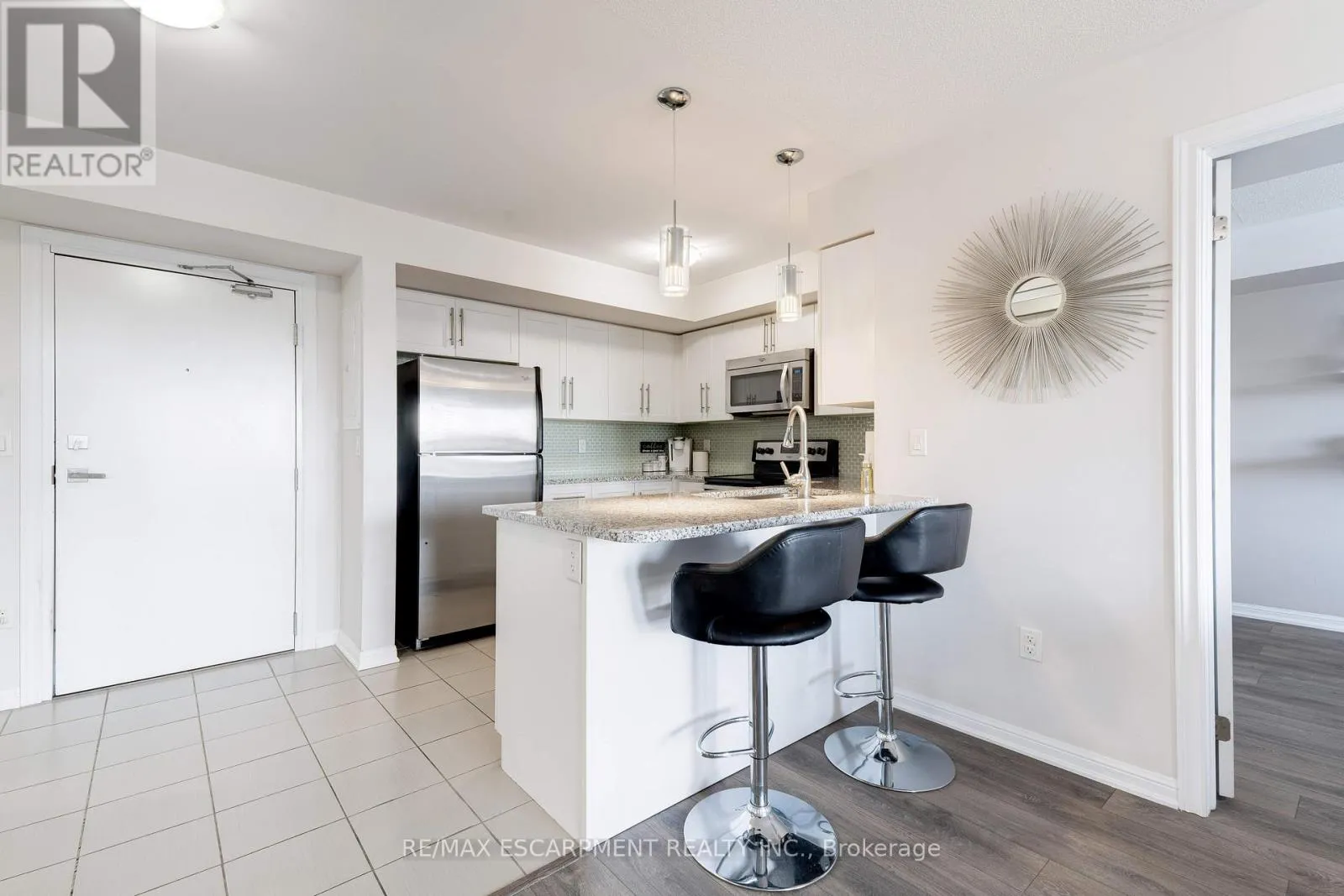 Cross Streets: Louis St. Laurent. ** Directions: Diefenbaker Street - Nadalin. Welcome to Village Suites, a sought-after low-rise condo in one of Milton's most desirable neighbourhoods! This beautifully maintained top-floor 2 bedroom, 2 bathroom suite offers the perfect blend of comfort, style, and convenience. Enjoy a bright and airy open concept layout with southern exposure, filling the space with natural light throughout the day. The upgraded white kitchen features granite countertops, a glass backsplash, stainless steel appliances, and a functional breakfast bar perfect for casual dining or entertaining.The unit boasts modern laminate flooring throughout with no carpet, creating a clean and cohesive look. The spacious primary bedroom includes a private ensuite with a large walk-in shower, while the second bedroom is ideal for guests, a home office, or growing families. Step outside to your private south facing balcony, perfect for enjoying morning coffee or admiring the sunset. Additional highlights include underground parking and a storage locker for added convenience. Location, Location, Location! Ideally situated close to Parks, schools, Shopping, restaurants, and everyday amenities! Easy access to highways and transit for commuters! This is an exceptional opportunity to own a stylish, move-in-ready condo in a fantastic community perfect for first-time buyers, down sizers, or investors alike! Flexible possession available! (id:27476)