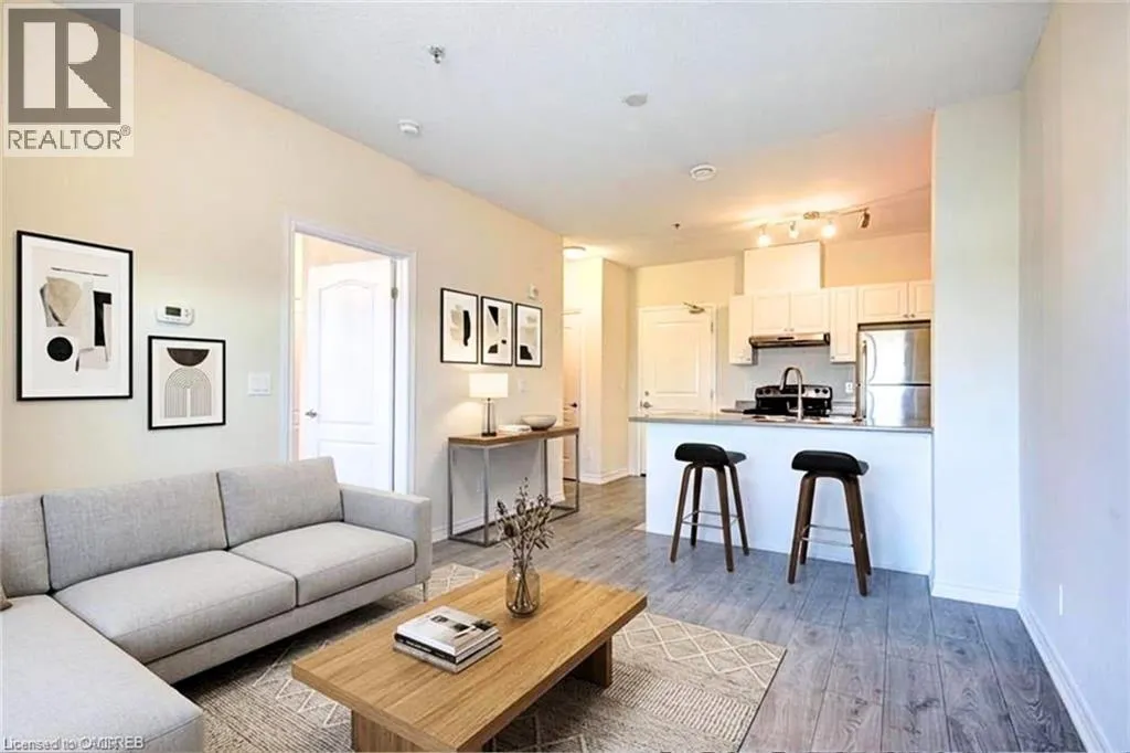 Fourth line and Derry Discover a charming one-bedroom residence nestled in one of Miltonâs most scenic settings, surrounded by ponds and quiet greenspace. This third-floor unit offers a comfortable and functional 585 sq. ft. layout, enhanced by high nine-foot ceilings and attractive laminate flooring throughout the main living areas. The kitchen is well-appointed with classic white cabinetry, stainless steel appliances, and a convenient breakfast bar that overlooks the open-concept great room. A spacious primary bedroom features a four-piece semi-ensuite and ample closet storage. Practicality is key here, with ensuite laundry, one dedicated underground parking spot, and a storage locker included. This is a fantastic opportunity to lease a well-cared-for home in a building known for its peaceful atmosphere and excellent proximity to schools, parks, and the library. (id:27476)