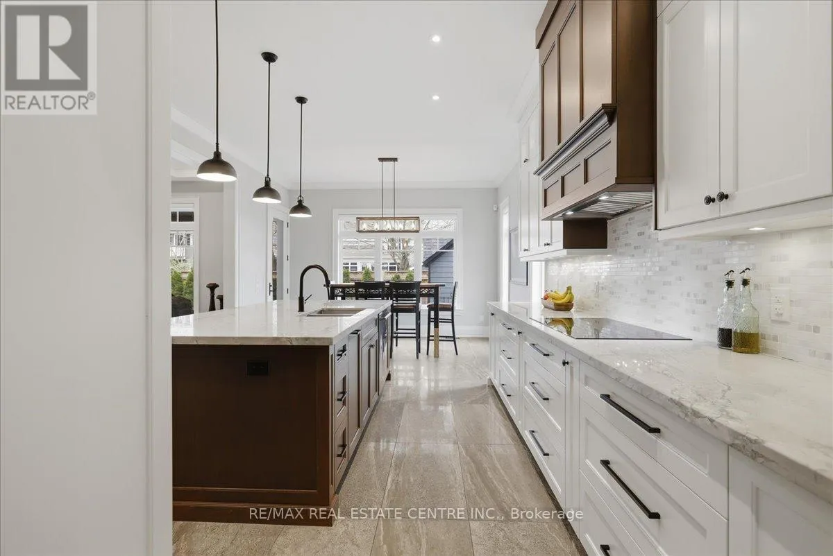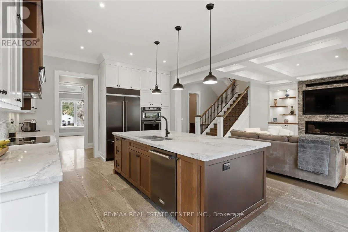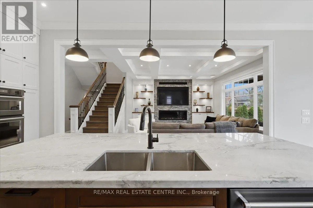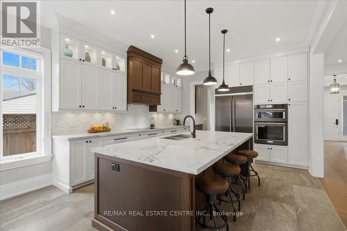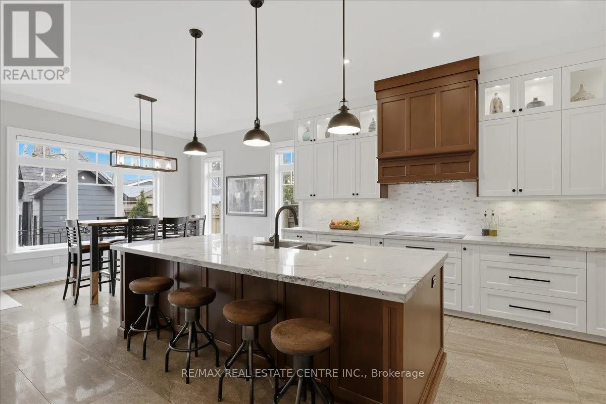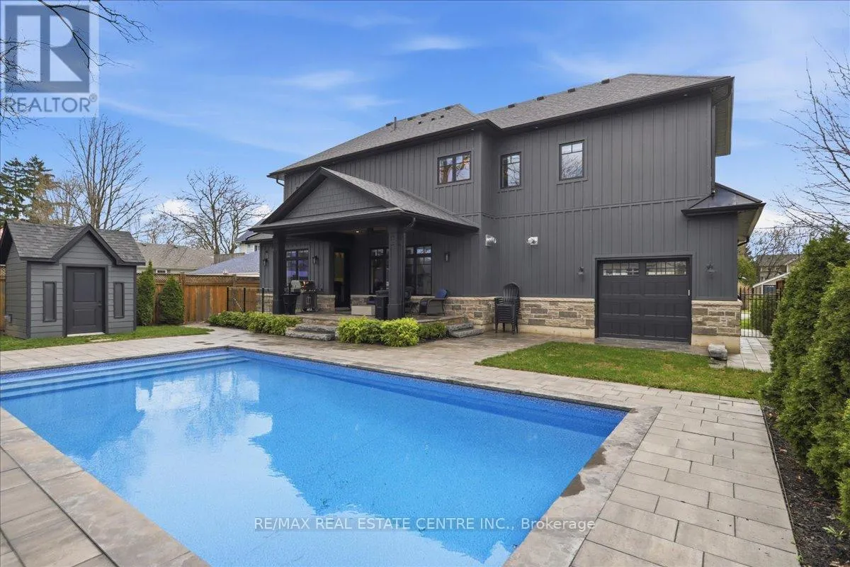 BELL ST AND MAIN ST Welcome to one of Old Milton's finest custom homes, totalling over 5000 sq ft, built in 2019 and impeccably maintained, just steps to Town Hall, the fairgrounds, and downtown. The exterior showcases historic reclaimed brick (replica), a durable metal roof with snow stops, a 22x42 cobblestone driveway for 4 cars, and maintenance-free Hardie board & batten siding. The fully landscaped backyard features a 16x32 saltwater pool with Aqualink automation (phone controlled), in-ground sprinkler system, 185 sq ft covered porch with fieldstone tile, and aseparate basement entrance ideal for multi-generational living.The double car garage is exceptionally equipped with epoxy floors, oversized 9x8 doors, a raredrive-through third door to the backyard, side-mount openers, and custom cabinetry with LED lighting, stainless counters, and a built-in beverage fridge. Inside, the main floor offers10ft ceilings, multiple coffered ceilings, and a bright open-concept layout. The chef's kitchen includes high-end appliances, induction cooktop, wall oven, and a butler's pantry. The living room features a fireplace with custom built-ins, while the staircase is highlighted byhand-carved posts. A heated mudroom floor and new cabinetry add everyday comfort.Upstairs offers 9ft ceilings, 4 bedrooms, 3 bathrooms, a laundry room, and 2 linen closets. The primary suite is large and bright with 2 walk-in closets, a carpenter gothic-style window, and a 5-piece ensuite with curbless shower, soaker tub, and heated floors. The basement features-9ft ceilings, in-floor radiant heat, gym space with rubber flooring, a wet bar with custom cabinetry (sink, mini fridge, dishwasher), and 2 large cold cellars. Elevator-ready framing,solid poplar trim (no MDF), 9" baseboards, 4.5" casings, 8ft solid doors with 4 ball-bearinghinges, 100+ LED pot lights, and full interior/exterior security system complete this exceptional home. (id:27476)