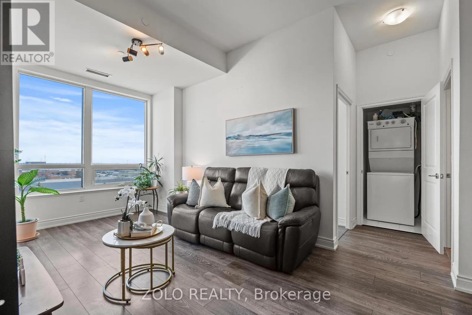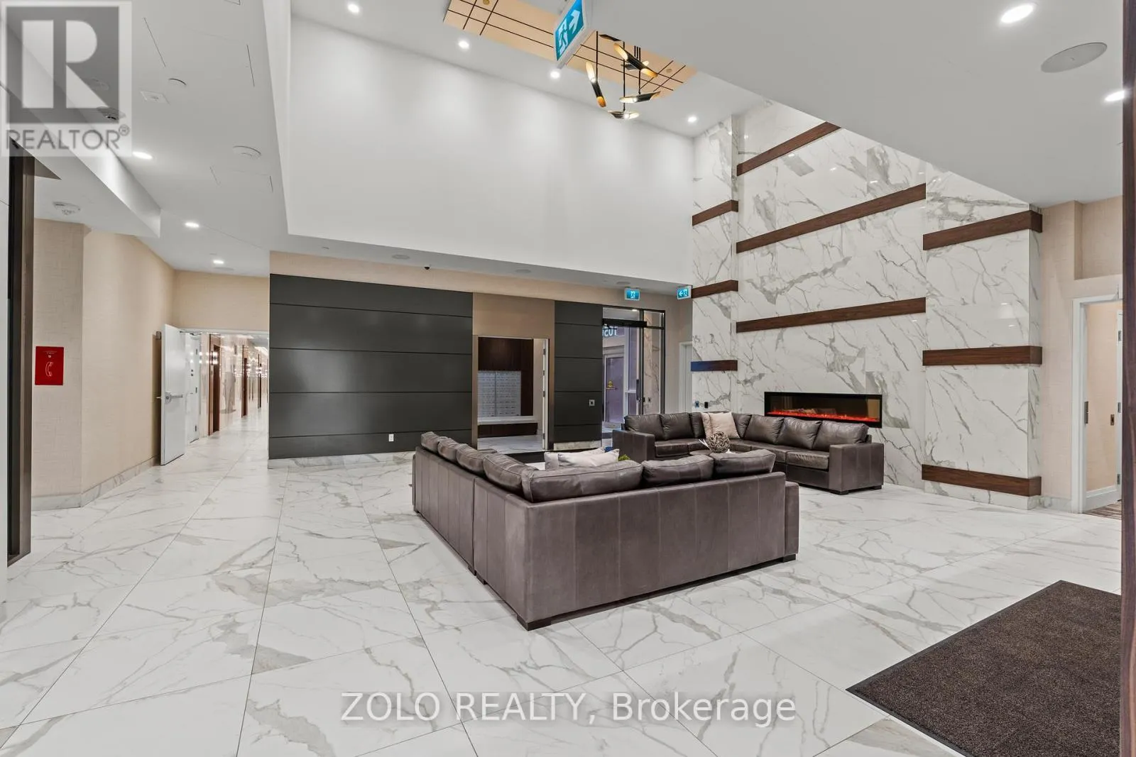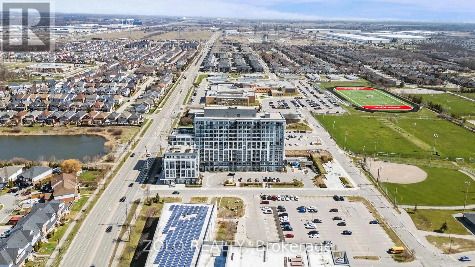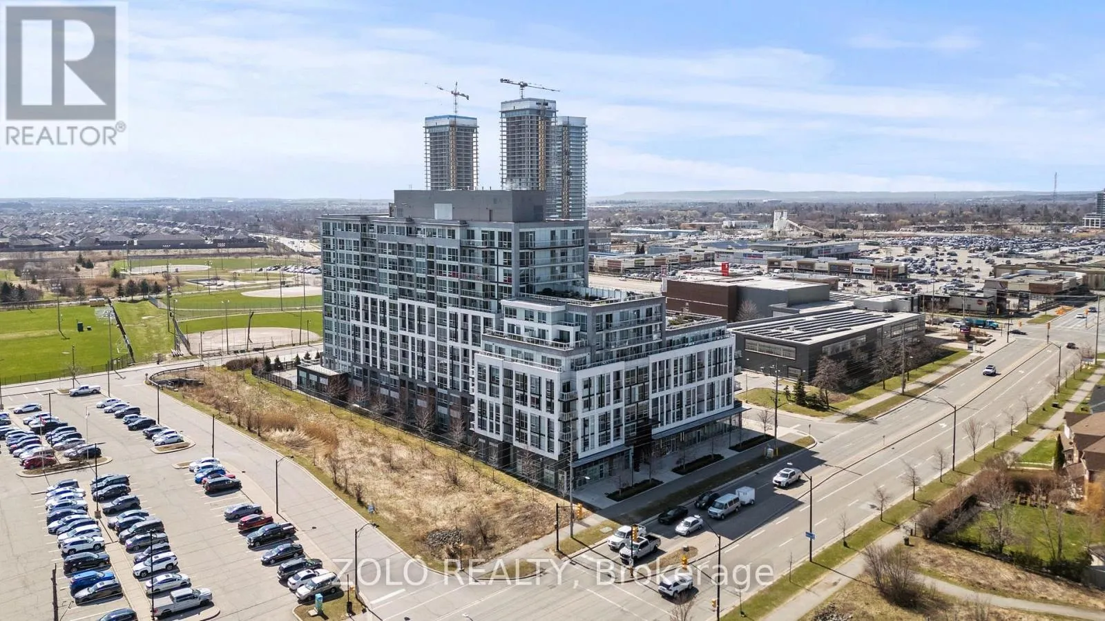 Main St and Thompson Rd Welcome to Art on Main - one of Milton's most sought-after boutique condo buildings by Fernbrook Homes. This beautifully appointed 2-bedroom + den suite offers 920+ sq ft of thoughtfully designed living space with soaring 10-ft ceilings and a bright open-concept layout that immediately impresses. Perched on the 6th floor with south-east exposure, enjoy views overlooking Lions Sports Park and the Leisure Centre from your private balcony. The den features sliding doors and generous proportions, ideal as a third bedroom, home office, or guest space. A rare bonus: storage locker conveniently located on the same floor. Also includes underground parking and in-suite laundry. Building amenities include outdoor pool, rooftop deck, gym, party room, guest suites and concierge. Steps to Milton Commons, Leisure Centre, Library, Lions Sports Park and Bishop Reding. GO Station under 1km away. Some balcony images virtually staged. (id:27476)