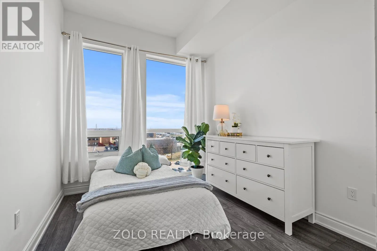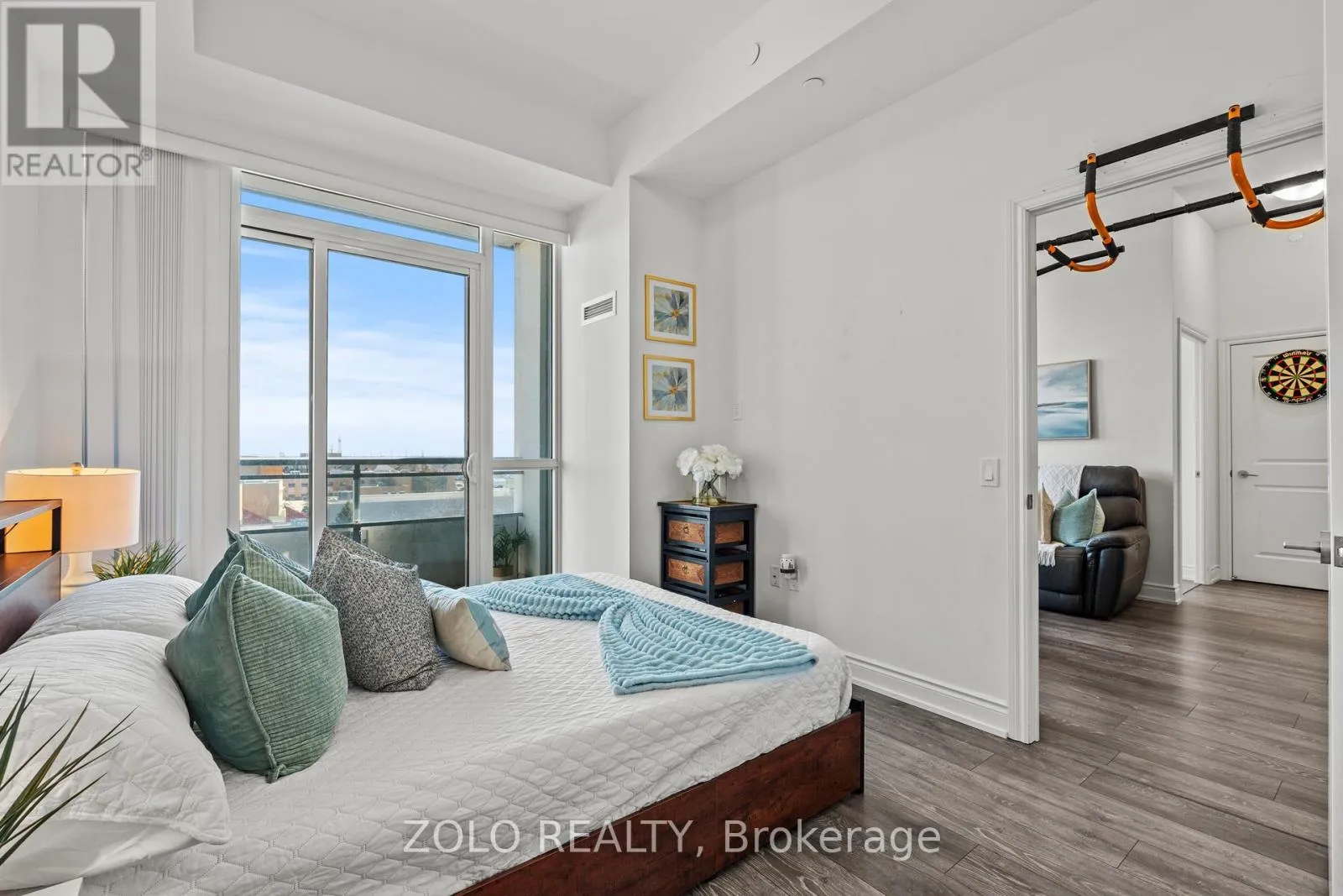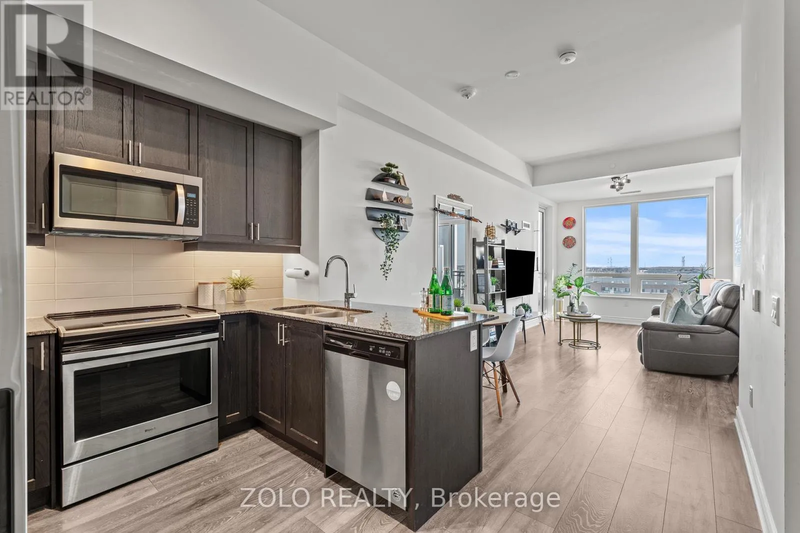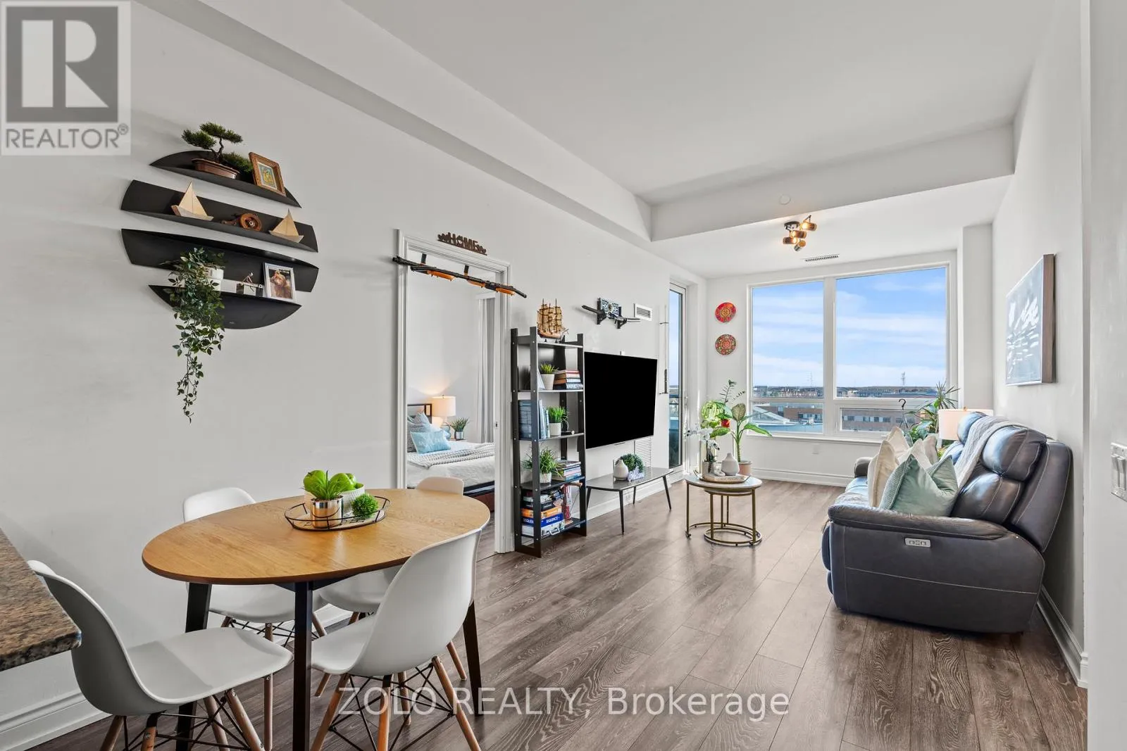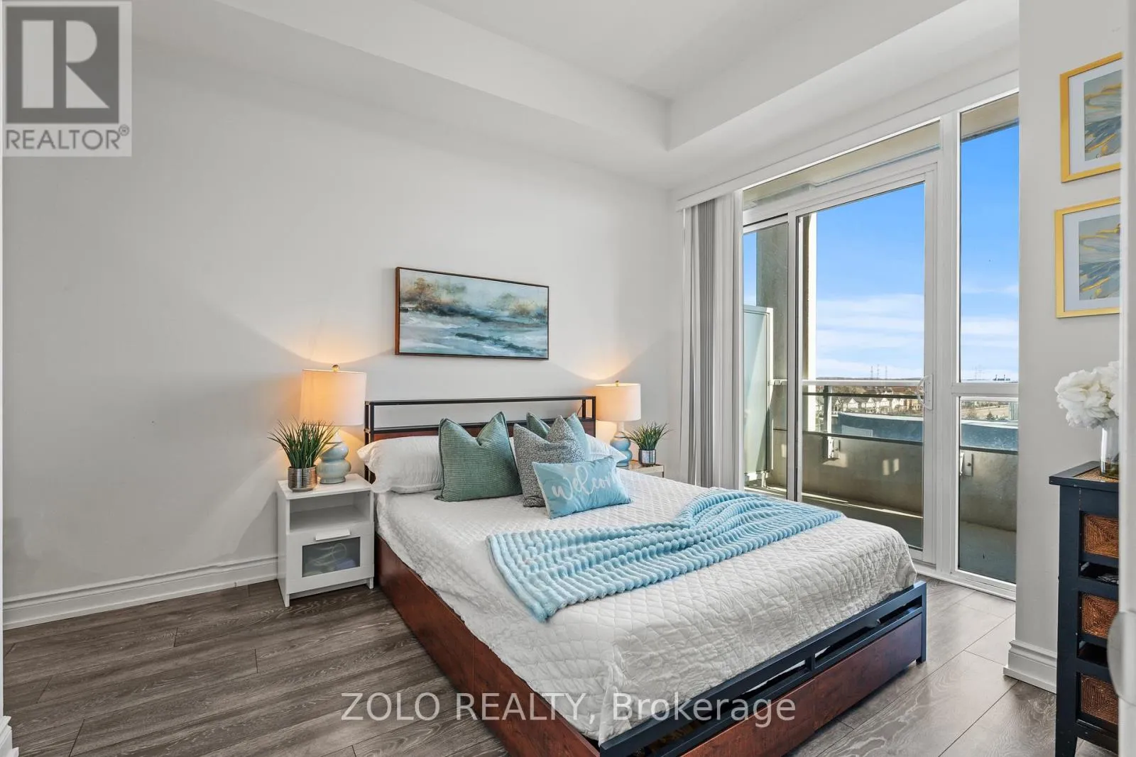 Main St and Thompson Rd Welcome to Art on Main - one of Milton's most sought-after boutique condo buildings by Fernbrook Homes. This beautifully appointed 2-bedroom + den suite offers 920+ sq ft of thoughtfully designed living space with soaring 10-ft ceilings and a bright open-concept layout that immediately impresses. Perched on the 6th floor with south-east exposure, enjoy views overlooking Lions Sports Park and the Leisure Centre from your private balcony. The den features sliding doors and generous proportions, ideal as a third bedroom, home office, or guest space. A rare bonus: storage locker conveniently located on the same floor. Also includes underground parking and in-suite laundry. Building amenities include outdoor pool, rooftop deck, gym, party room, guest suites and concierge. Steps to Milton Commons, Leisure Centre, Library, Lions Sports Park and Bishop Reding. GO Station under 1km away. Some balcony images virtually staged. (id:27476)