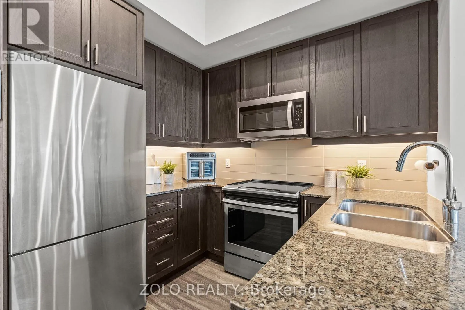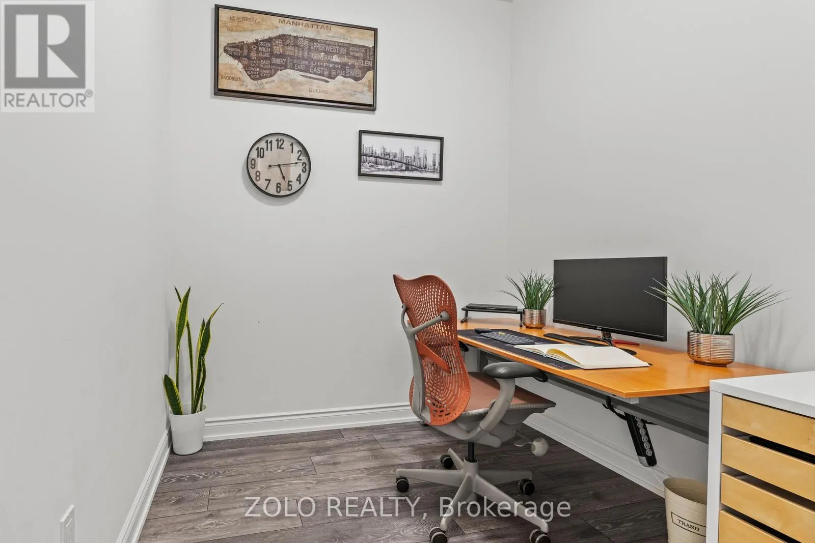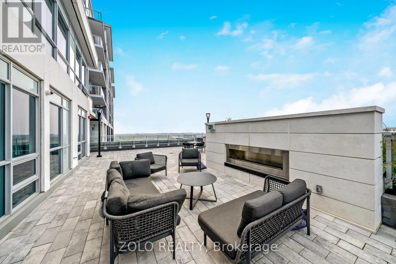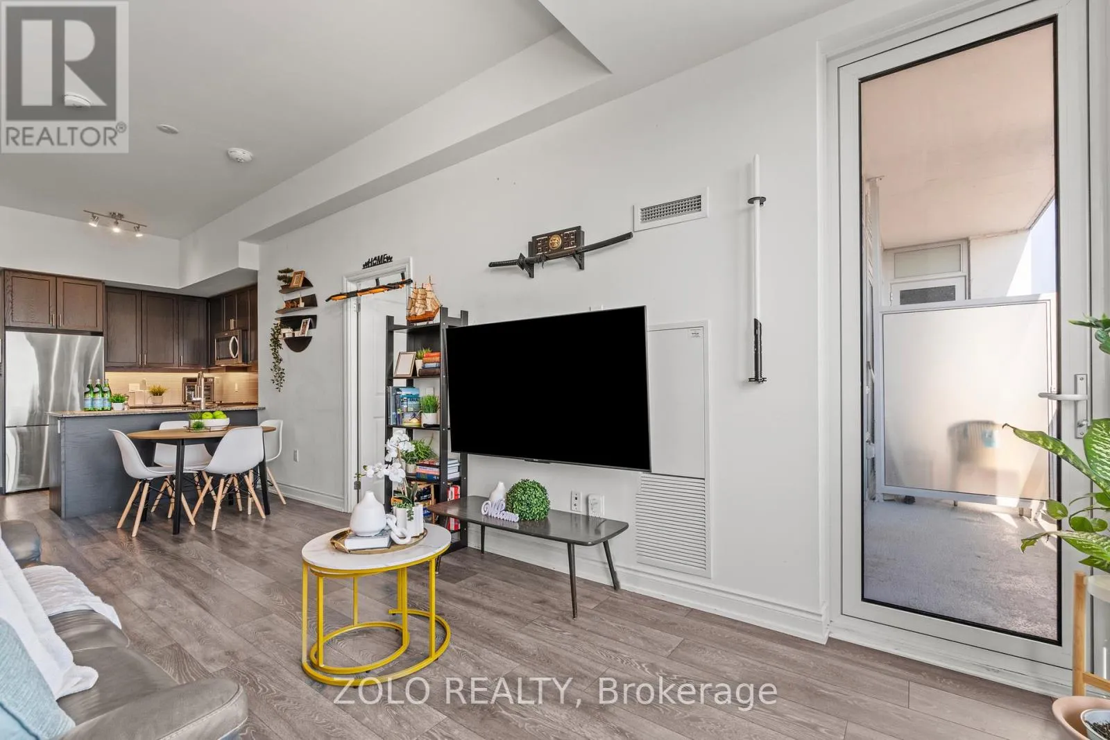 Main St and Thompson Rd Welcome to Art on Main - one of Milton's most sought-after boutique condo buildings by Fernbrook Homes. This beautifully appointed 2-bedroom + den suite offers 920+ sq ft of thoughtfully designed living space with soaring 10-ft ceilings and a bright open-concept layout that immediately impresses. Perched on the 6th floor with south-east exposure, enjoy views overlooking Lions Sports Park and the Leisure Centre from your private balcony. The den features sliding doors and generous proportions, ideal as a third bedroom, home office, or guest space. A rare bonus: storage locker conveniently located on the same floor. Also includes underground parking and in-suite laundry. Building amenities include outdoor pool, rooftop deck, gym, party room, guest suites and concierge. Steps to Milton Commons, Leisure Centre, Library, Lions Sports Park and Bishop Reding. GO Station under 1km away. Some balcony images virtually staged. (id:27476)