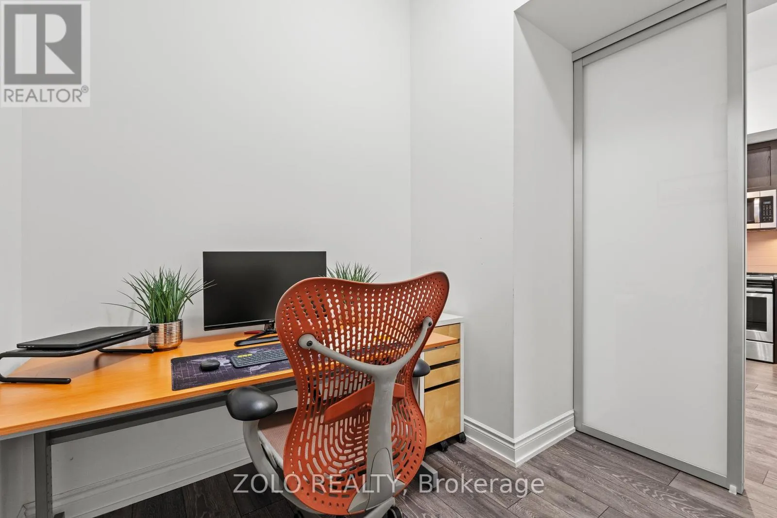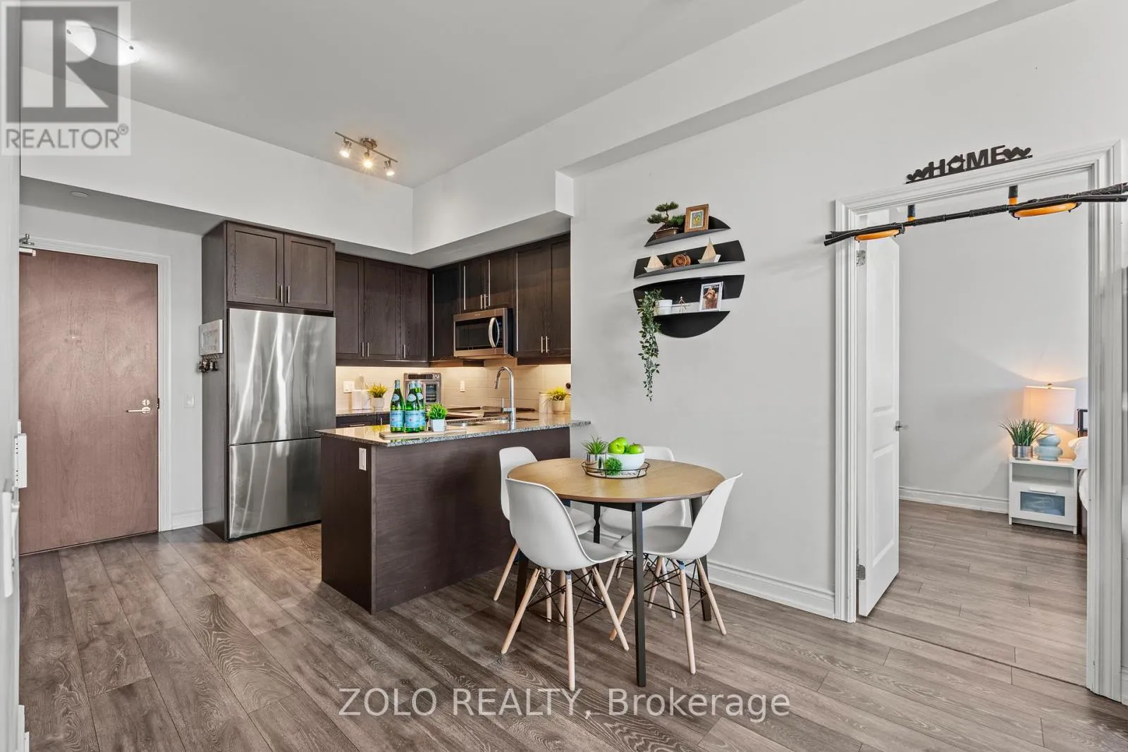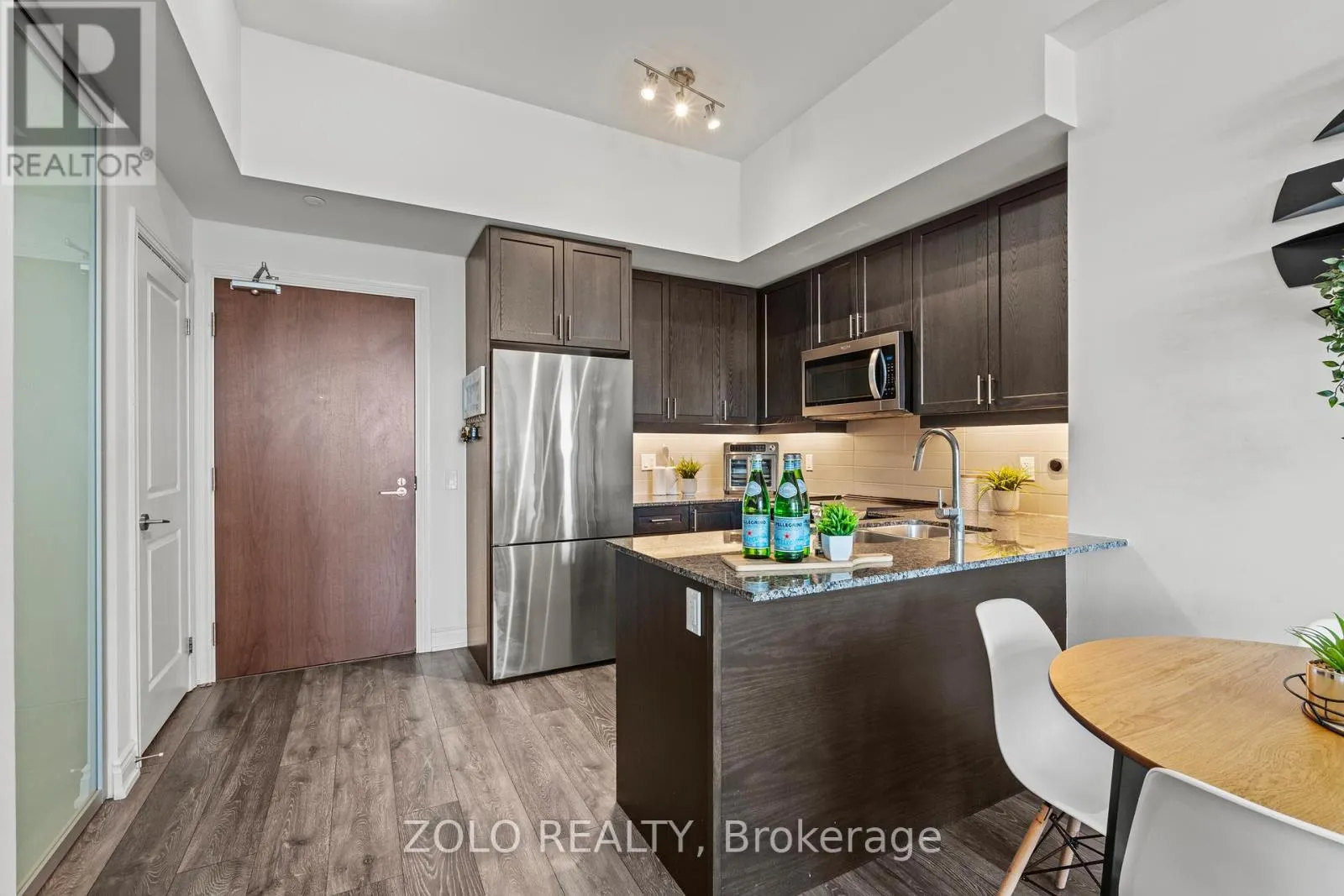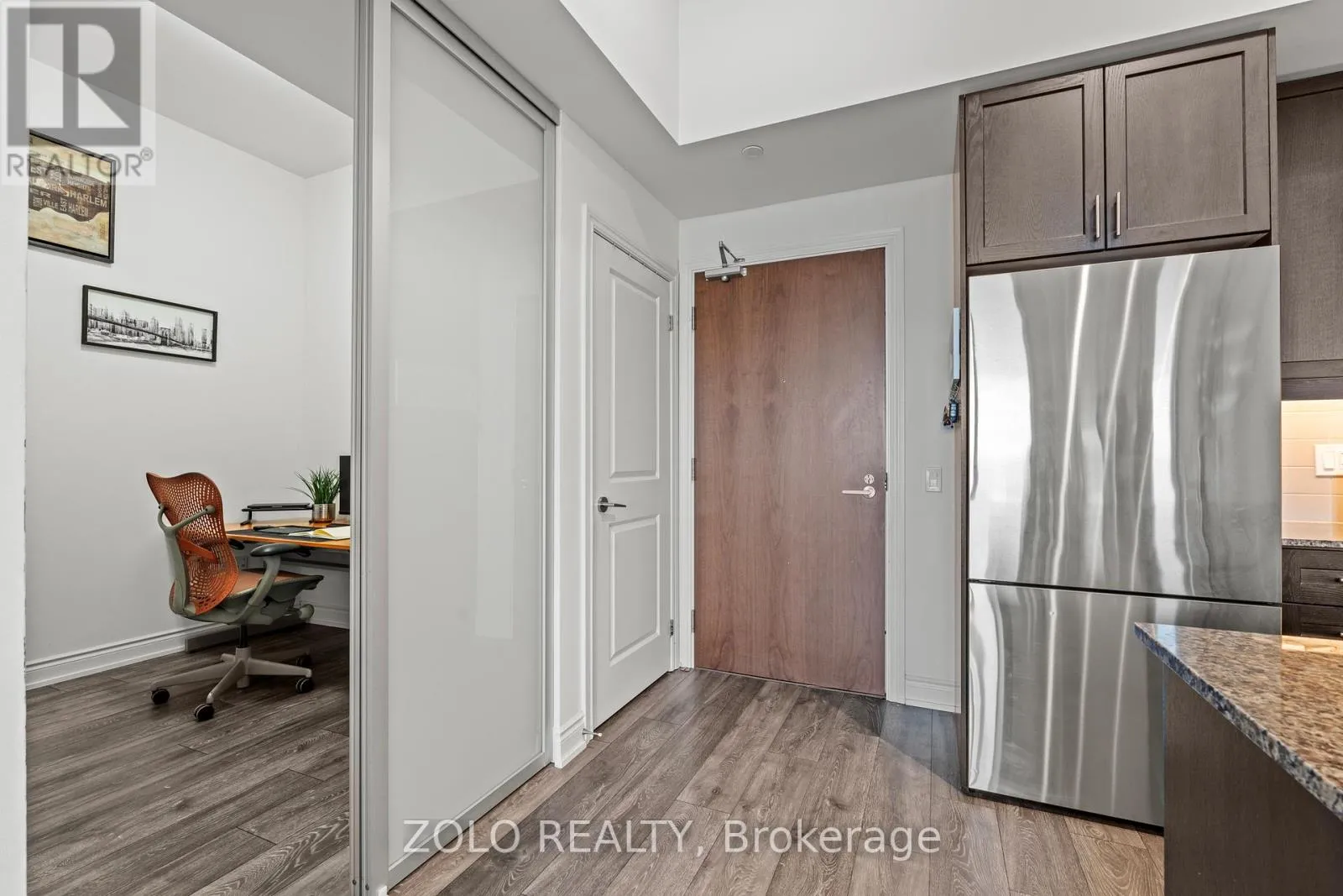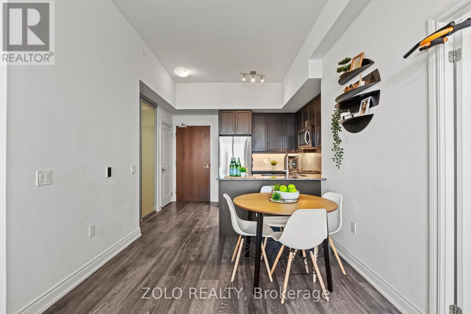 Main St and Thompson Rd Welcome to Art on Main - one of Milton's most sought-after boutique condo buildings by Fernbrook Homes. This beautifully appointed 2-bedroom + den suite offers 920+ sq ft of thoughtfully designed living space with soaring 10-ft ceilings and a bright open-concept layout that immediately impresses. Perched on the 6th floor with south-east exposure, enjoy views overlooking Lions Sports Park and the Leisure Centre from your private balcony. The den features sliding doors and generous proportions, ideal as a third bedroom, home office, or guest space. A rare bonus: storage locker conveniently located on the same floor. Also includes underground parking and in-suite laundry. Building amenities include outdoor pool, rooftop deck, gym, party room, guest suites and concierge. Steps to Milton Commons, Leisure Centre, Library, Lions Sports Park and Bishop Reding. GO Station under 1km away. Some balcony images virtually staged. (id:27476)