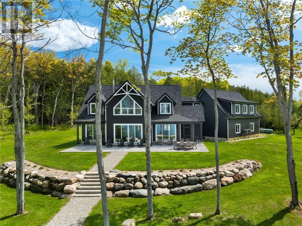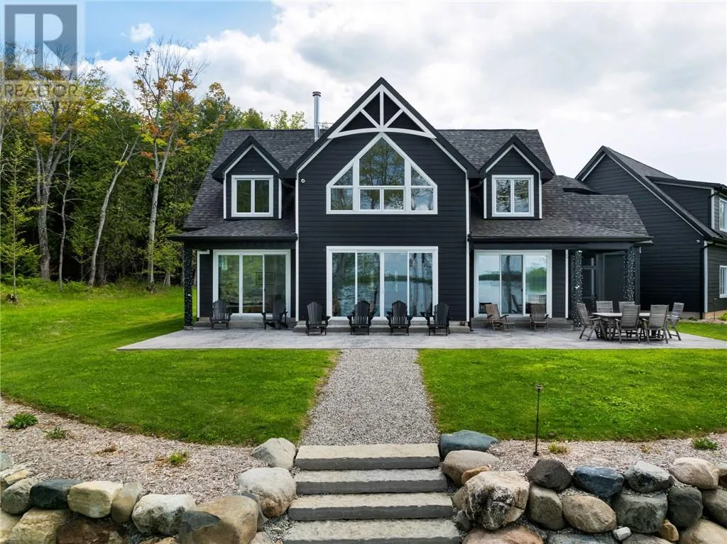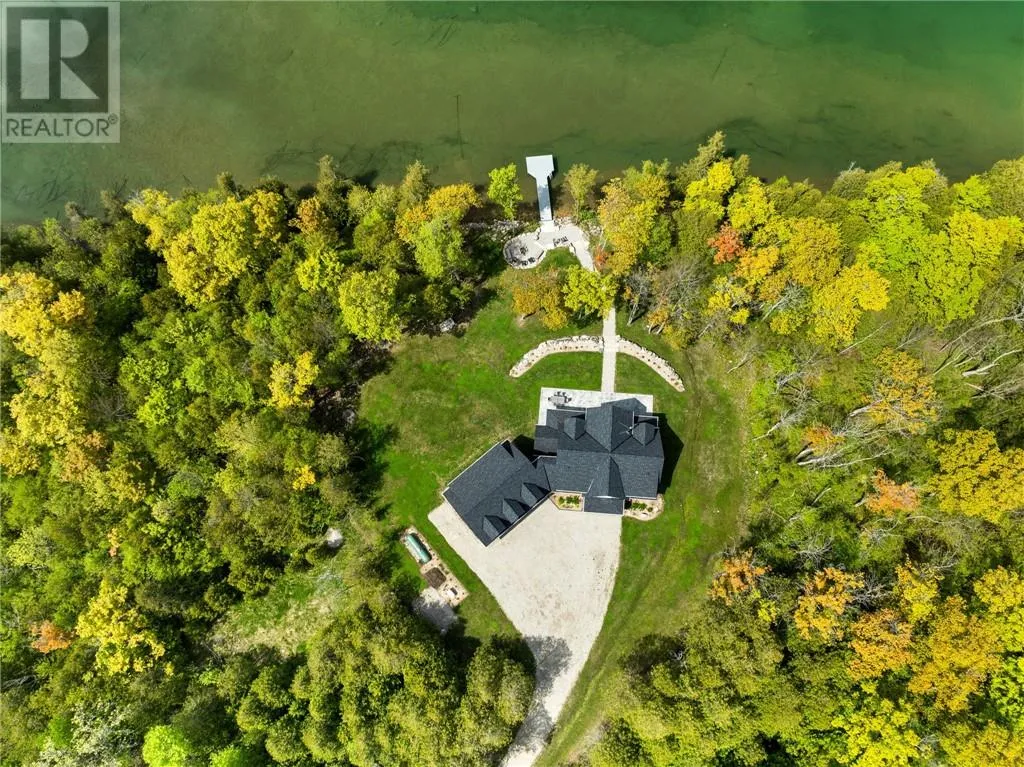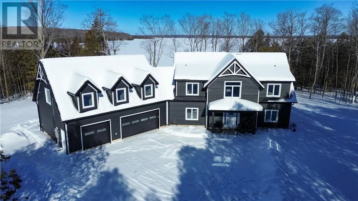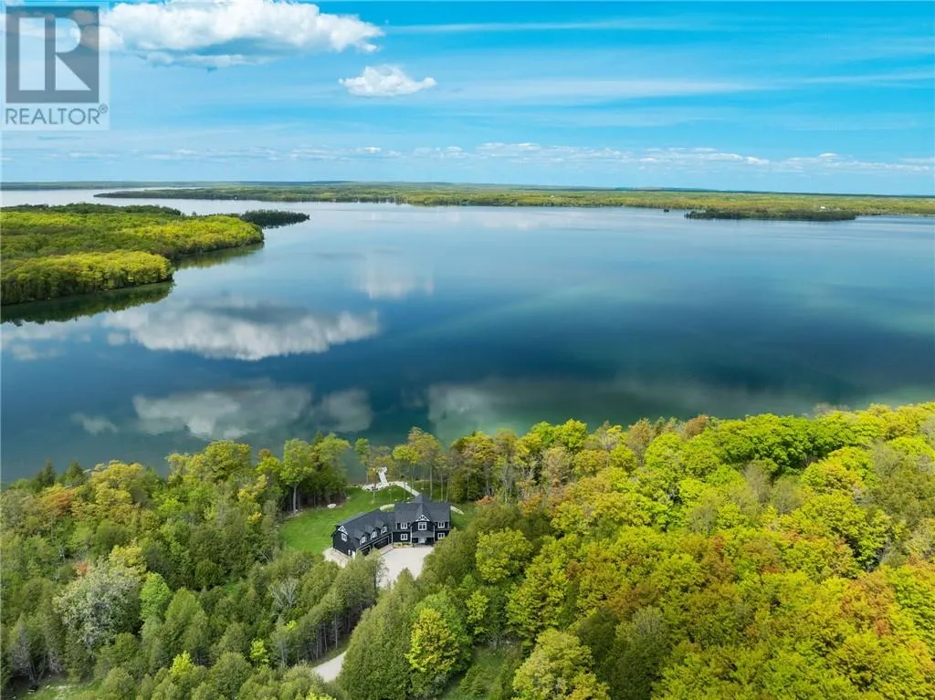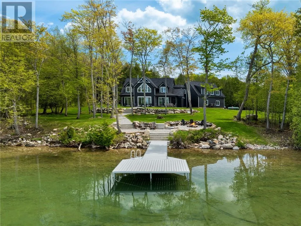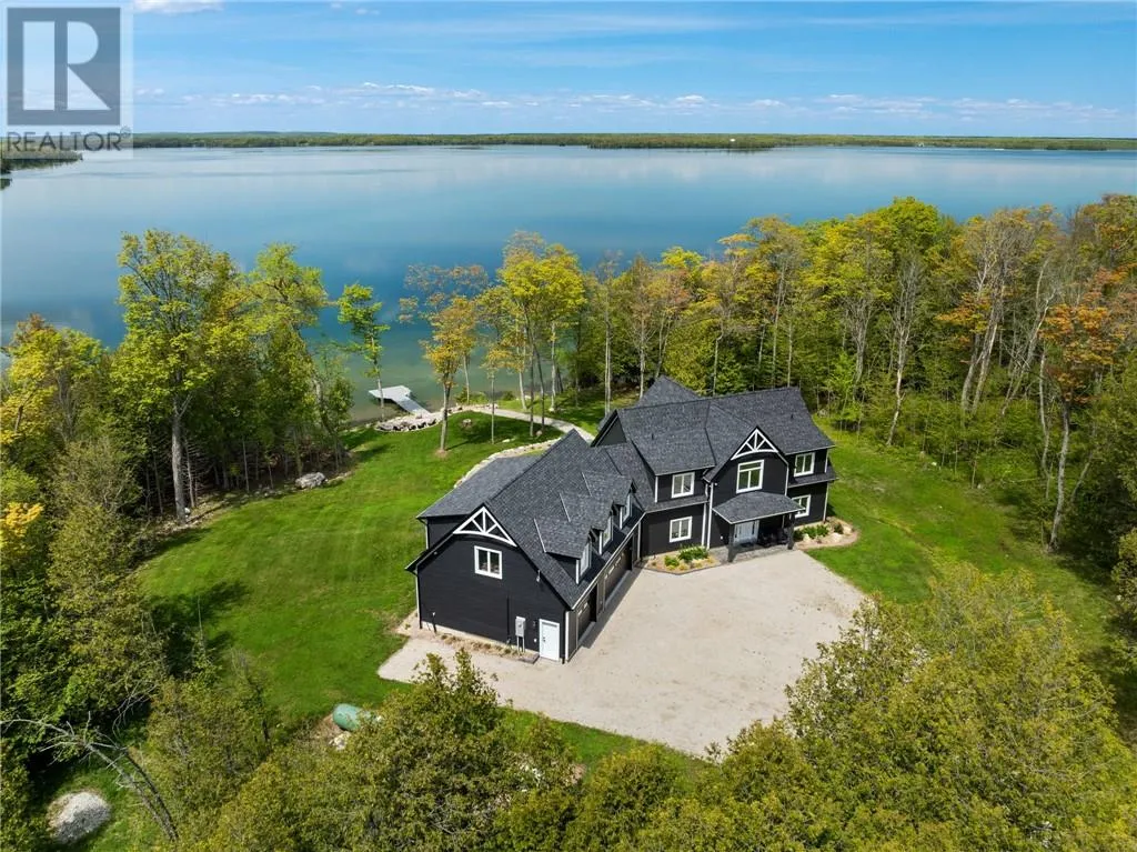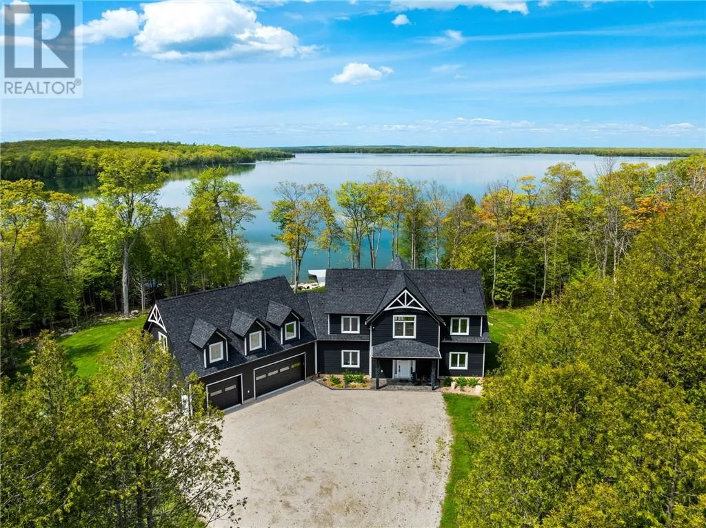 Welcome to 76B Johnston Road, a striking custom-built lakefront residence completed in 2022, where refined craftsmanship meets unparalleled privacy. Set on 5 secluded acres with manicured landscaping, stone walkways, and a shoreline fire pit, this property offers an extraordinary waterfront lifestyle in a serene setting. Soak in breathtaking views over Lake Manitou from your 40-foot dock with expansive sitting areaâperfect to unwind, entertain, or take in the beauty of one of Manitoulin Islandâs most coveted lakes. Inside, this home showcases meticulous attention to detail, featuring cathedral ceilings with shiplap accents, engineered hardwood floors, and floor-to-ceiling windows that frame the lake and flood the home with natural light. The open-concept main level is both elegant and inviting, anchored by a stunning stone fireplace in the living room. The kitchen is a chefâs dream with granite countertops, a large island, and seamless flow into the dining area and sunroomâideal for hosting or quiet mornings overlooking the water. The primary suite is a private sanctuary, offering spectacular lake views, a spacious walk-in closet, and a spa-inspired ensuite complete with double vanities, a luxurious walk-in shower, a deep soaker tub, and beautifully finished tile flooring. A grand foyer with a powder room, main-floor laundry, and access to the heated triple-car garage complete the main level. An open staircase leads to the second floor, where a dramatic walkway overlooks the living space below. This level offers two generous bedrooms, a full bath, and a versatile third bedroom currently suited as a family or games roomâperfect for guests or extended family. Designed for year-round living, this exceptional retreat features modern conveniences, a security system, and superior construction throughout. Whether youâre seeking a refined waterfront escape or a permanent luxury residence, this is a rare offering on Lake Manitou. Schedule your exclusive viewing today. (id:27476)