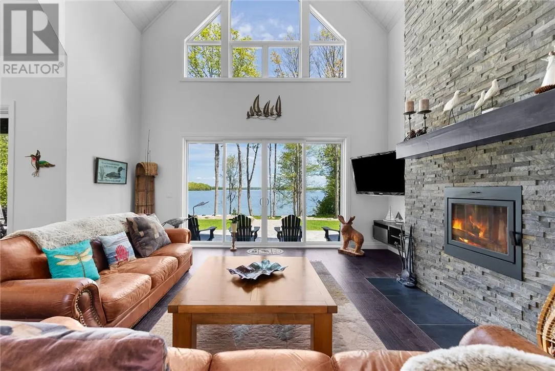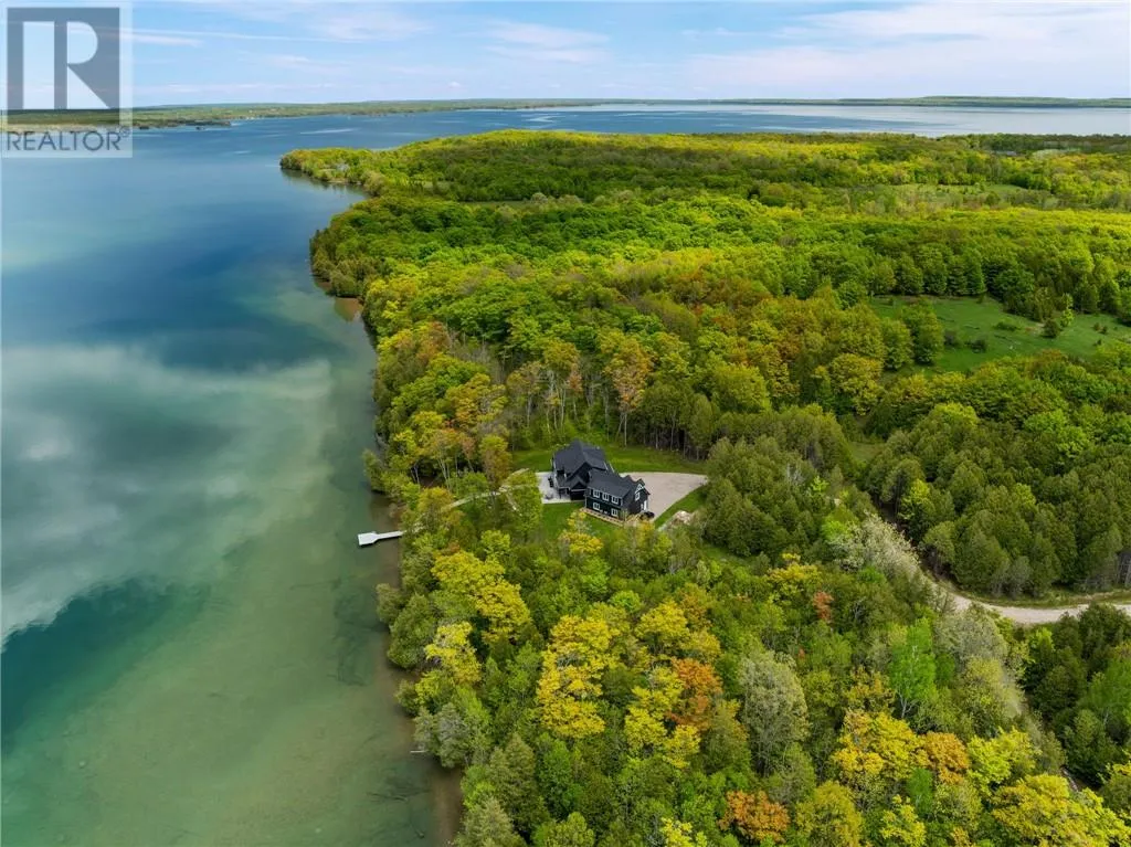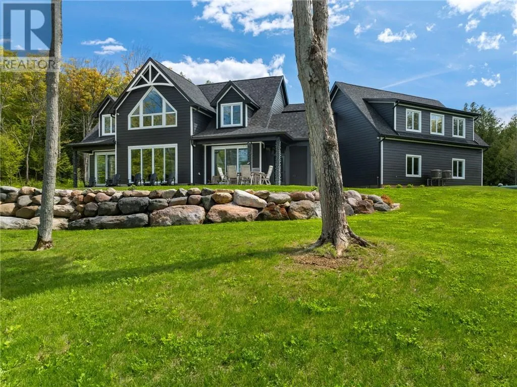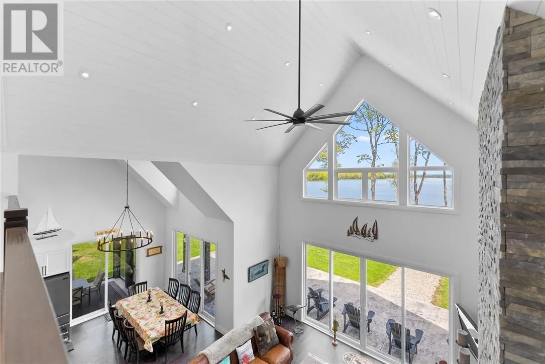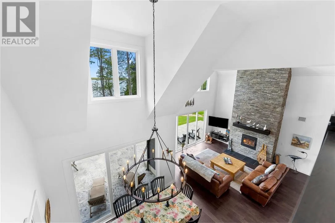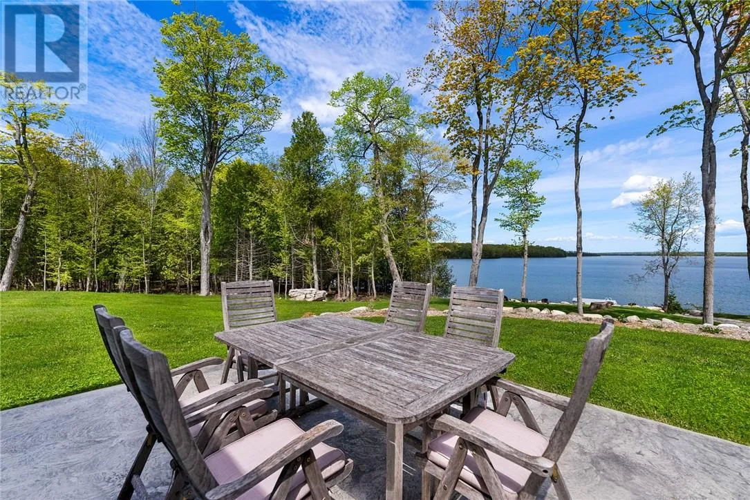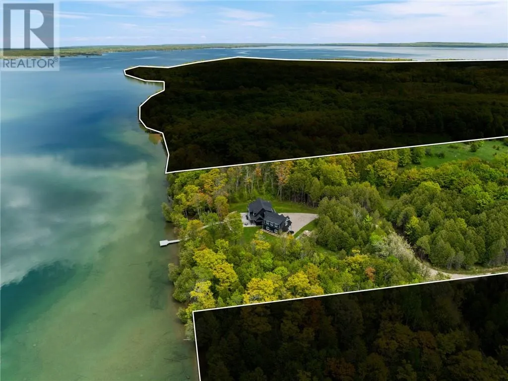 Welcome to 76B Johnston Road, a striking custom-built lakefront residence completed in 2022, where refined craftsmanship meets unparalleled privacy. Set on 5 secluded acres with manicured landscaping, stone walkways, and a shoreline fire pit, this property offers an extraordinary waterfront lifestyle in a serene setting. Soak in breathtaking views over Lake Manitou from your 40-foot dock with expansive sitting areaâperfect to unwind, entertain, or take in the beauty of one of Manitoulin Islandâs most coveted lakes. Inside, this home showcases meticulous attention to detail, featuring cathedral ceilings with shiplap accents, engineered hardwood floors, and floor-to-ceiling windows that frame the lake and flood the home with natural light. The open-concept main level is both elegant and inviting, anchored by a stunning stone fireplace in the living room. The kitchen is a chefâs dream with granite countertops, a large island, and seamless flow into the dining area and sunroomâideal for hosting or quiet mornings overlooking the water. The primary suite is a private sanctuary, offering spectacular lake views, a spacious walk-in closet, and a spa-inspired ensuite complete with double vanities, a luxurious walk-in shower, a deep soaker tub, and beautifully finished tile flooring. A grand foyer with a powder room, main-floor laundry, and access to the heated triple-car garage complete the main level. An open staircase leads to the second floor, where a dramatic walkway overlooks the living space below. This level offers two generous bedrooms, a full bath, and a versatile third bedroom currently suited as a family or games roomâperfect for guests or extended family. Designed for year-round living, this exceptional retreat features modern conveniences, a security system, and superior construction throughout. Whether youâre seeking a refined waterfront escape or a permanent luxury residence, this is a rare offering on Lake Manitou. Schedule your exclusive viewing today. (id:27476)